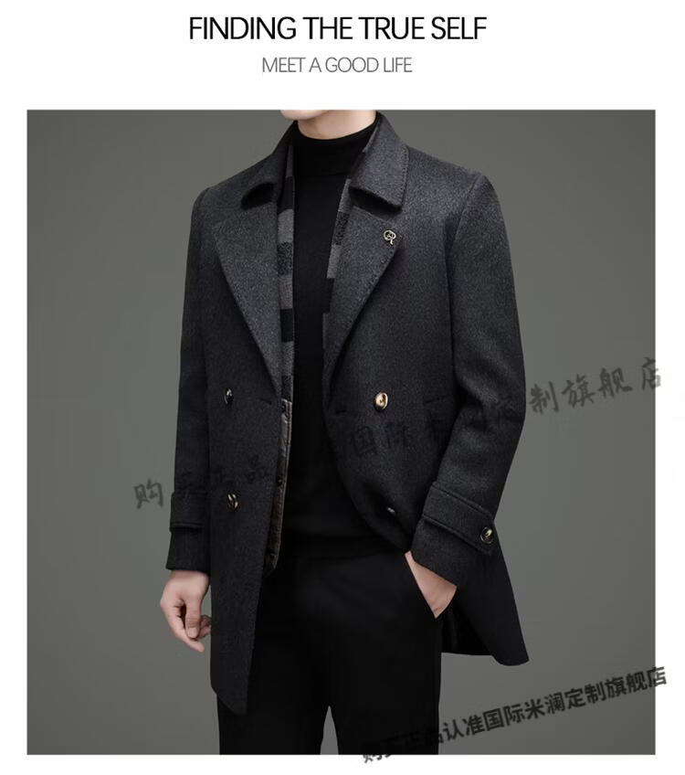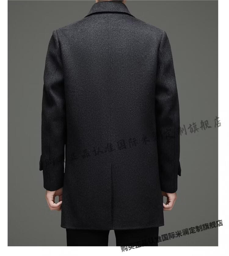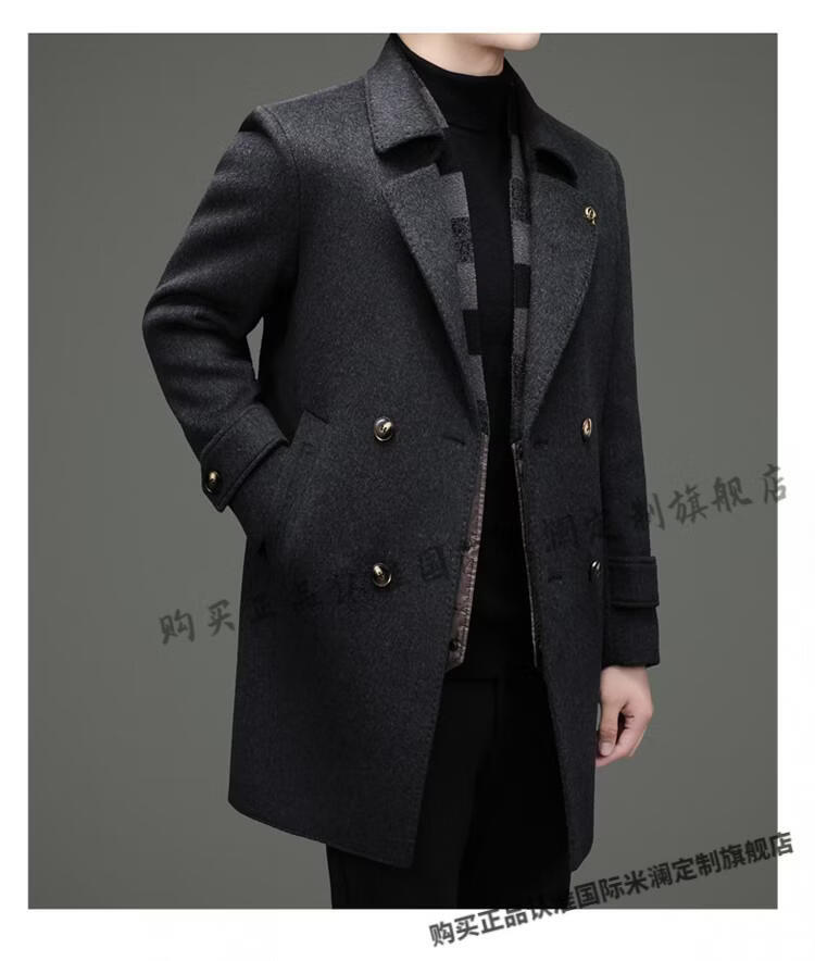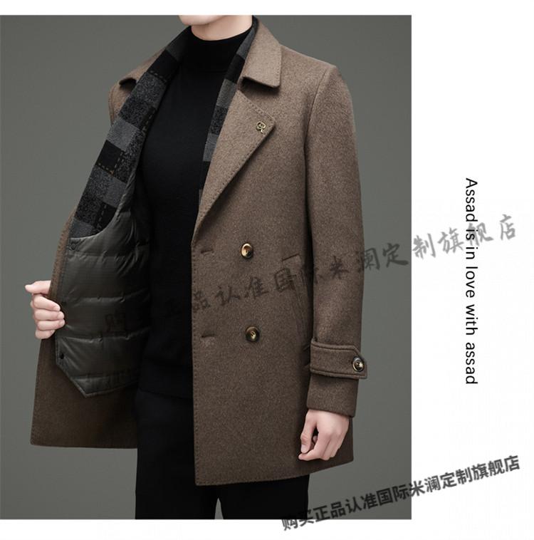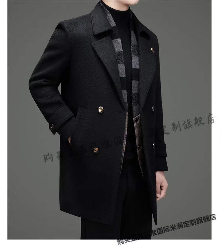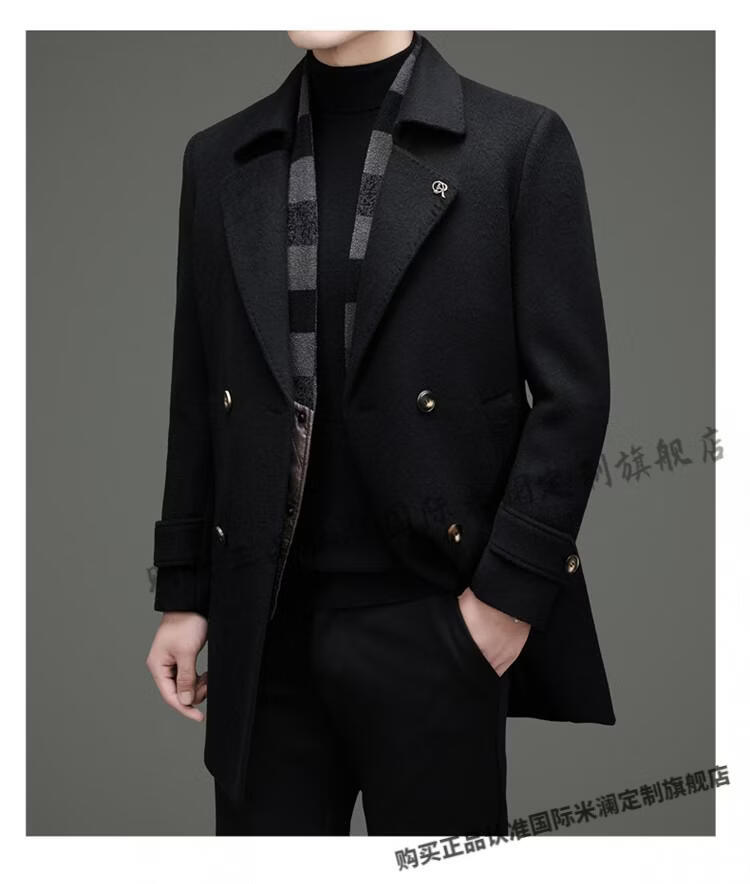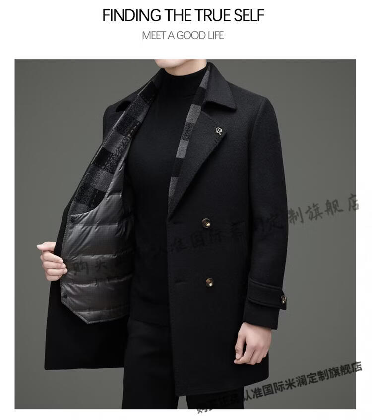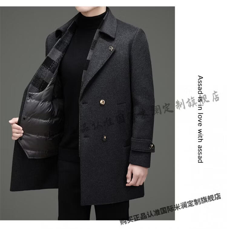 International Milan mid-length cashmere wool coat for men with removable white goose down lining, middle-aged business double-sided wool coat for men, double-breasted - black cashmere + sheep wool fabric, thickened XL 180 size - recommended 130-155 Jin Jin is equal to 0.5 kg