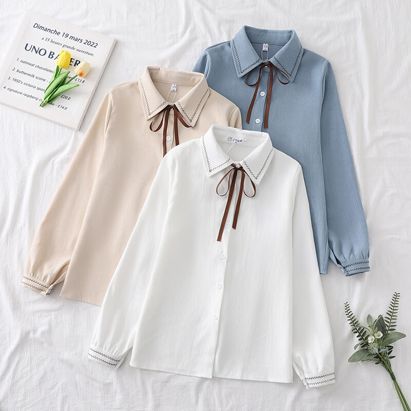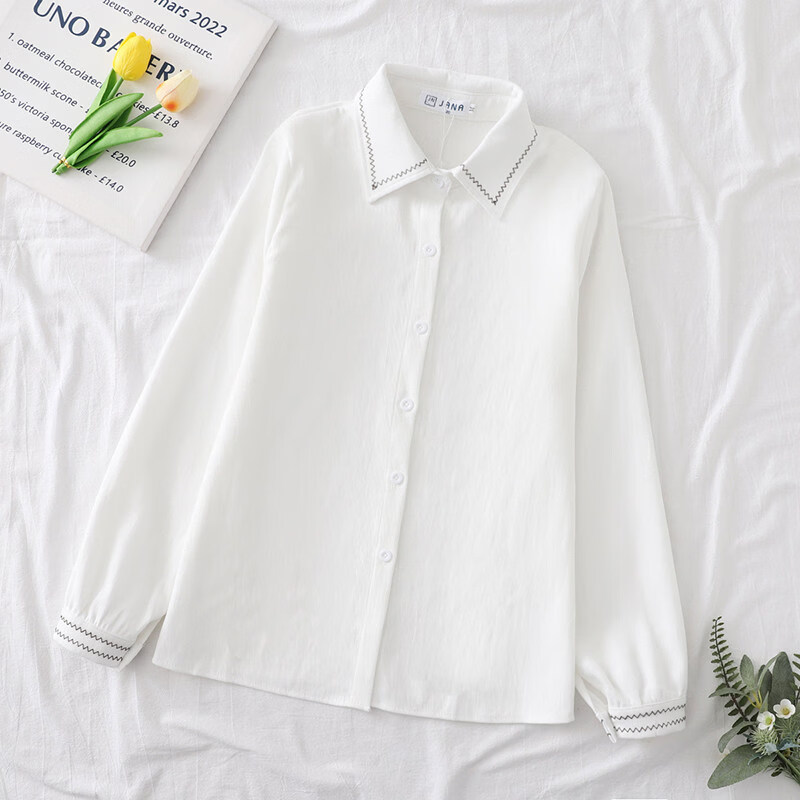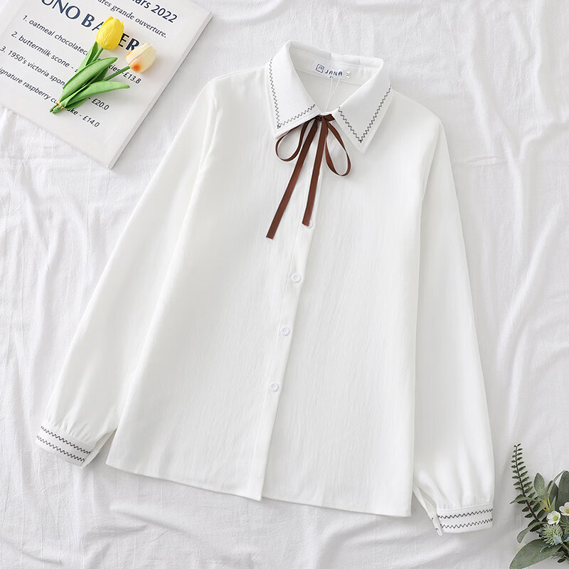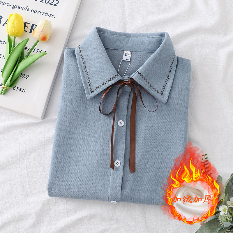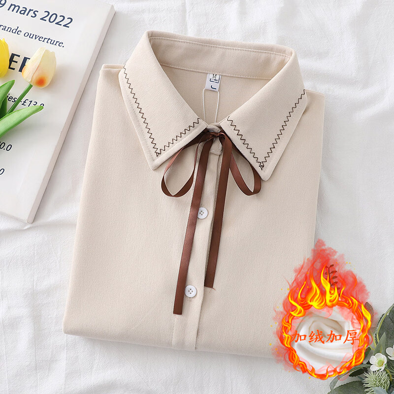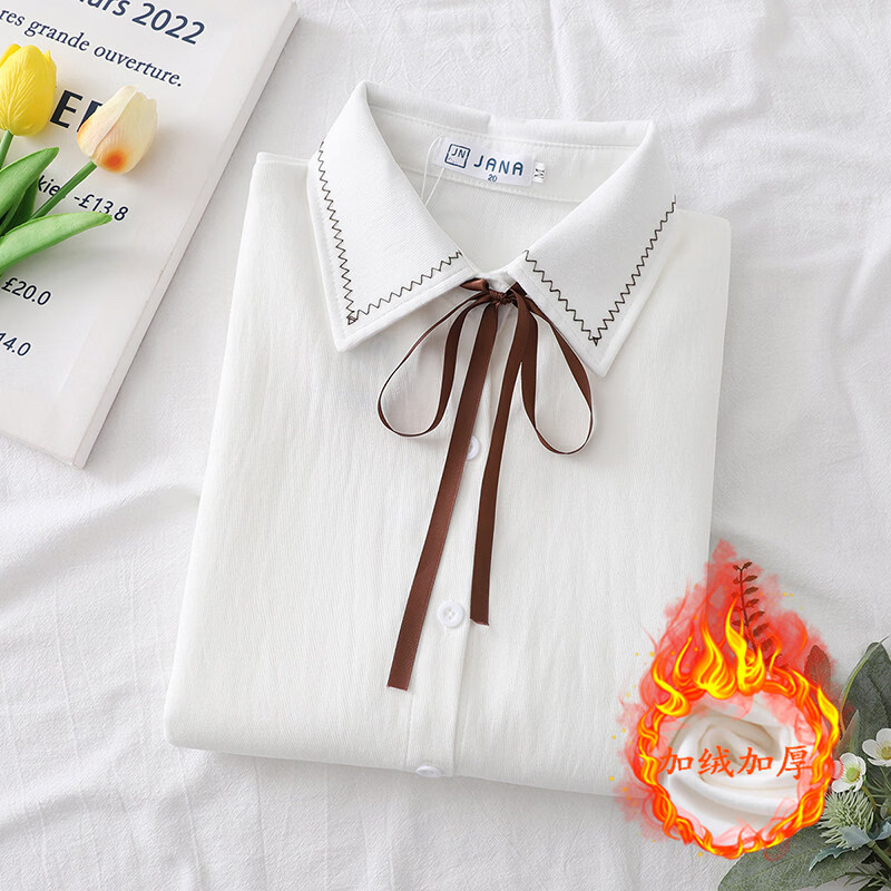Woodpecker autumn and winter new style plus velvet, thickened and warm, commuting basic shirt for women to wear inside, niche long-sleeved top, trendy, white + brown laces, regular version, S collection, priority delivery