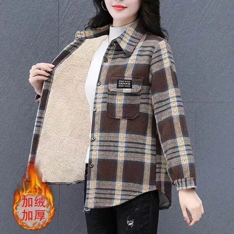 Woodpecker casual fashion cotton thickened one-piece velvet shirt women's autumn and winter velvet thickened shirt women's warm plaid shirt plus velvet style big coffee style 4XL recommended 135-145Jin Jin equals 0.5 kg
