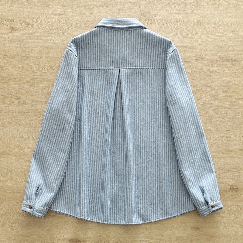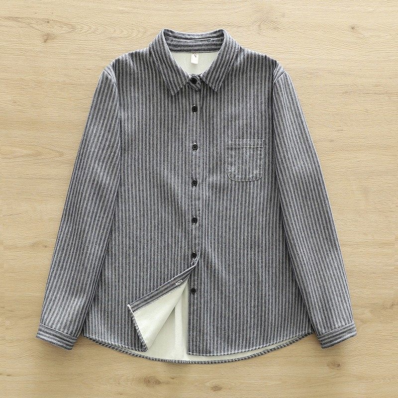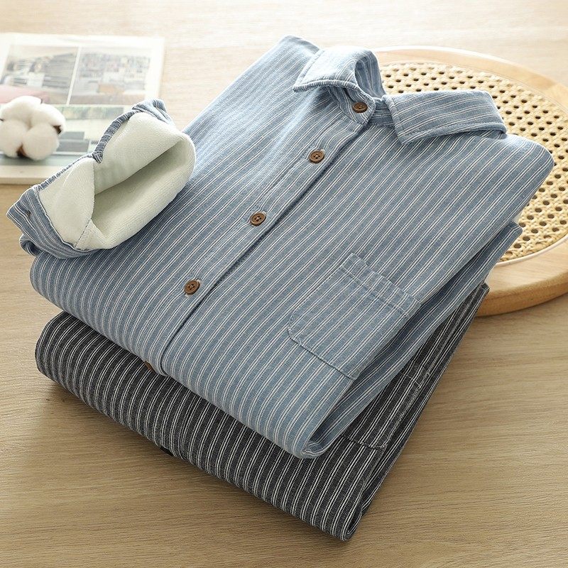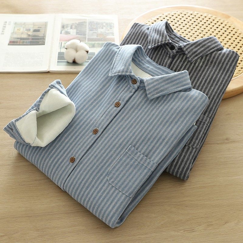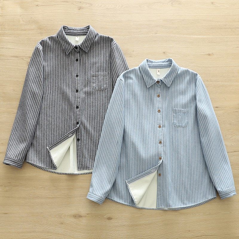 Woodpecker velvet thickened striped shirt for women 2025 autumn and winter new loose and versatile simple all-in-one velvet warm shirt blue striped plus velvet winter plus velvet S 80-110Jin Jin equals 0.5 kg