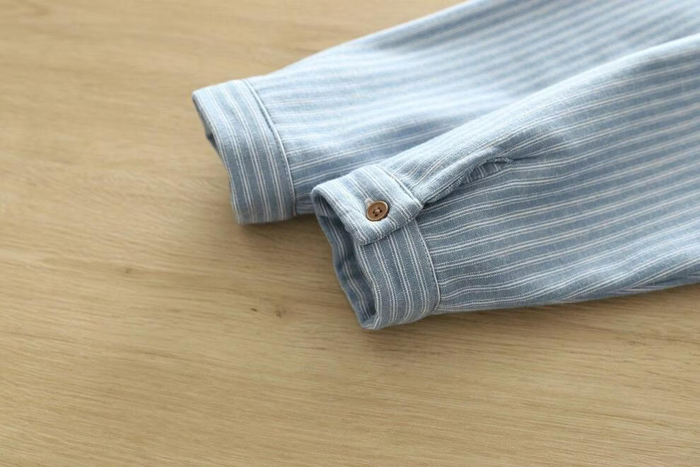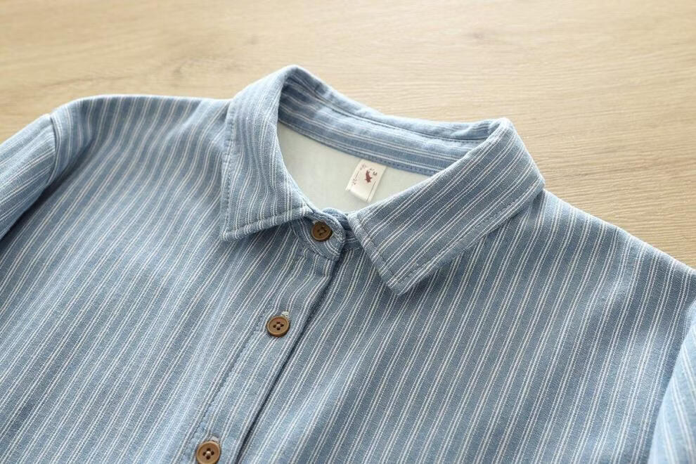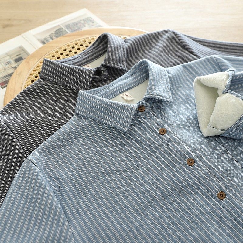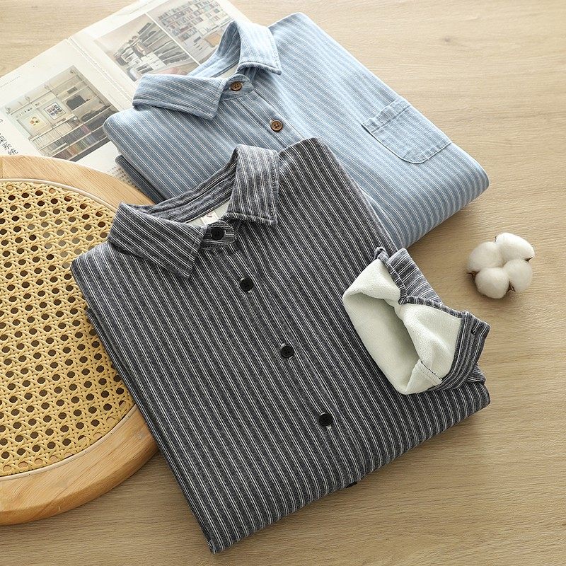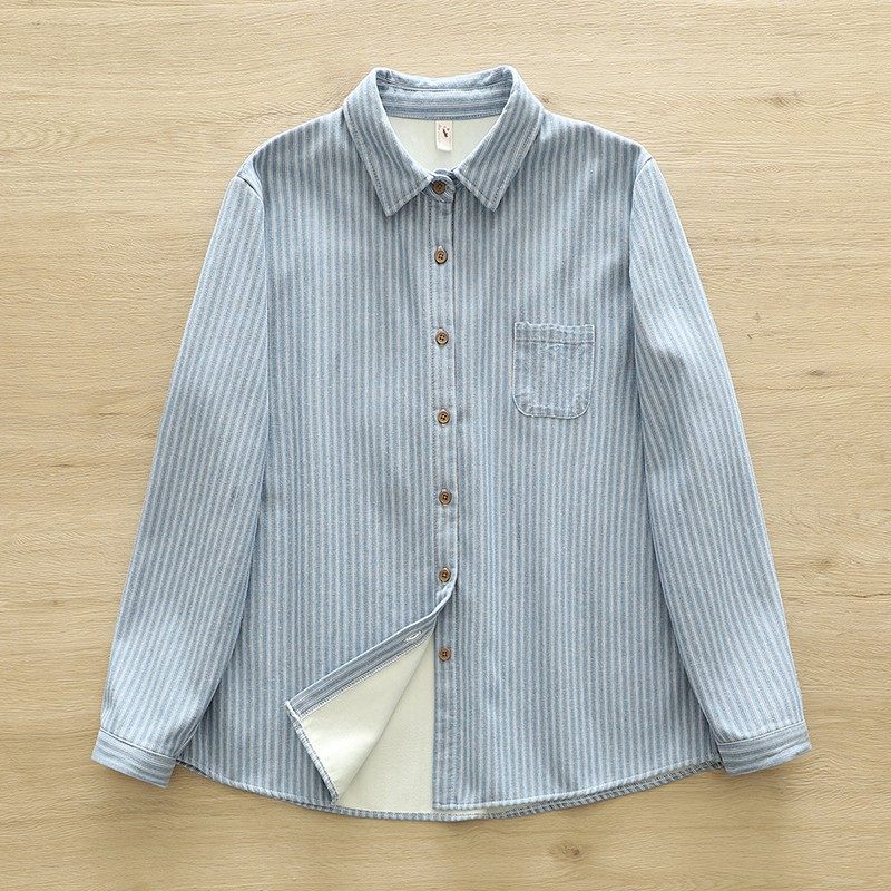 Woodpecker velvet thickened striped shirt for women 2025 autumn and winter new loose and versatile simple all-in-one velvet warm shirt blue striped plus velvet winter plus velvet S 80-110Jin Jin equals 0.5 kg
