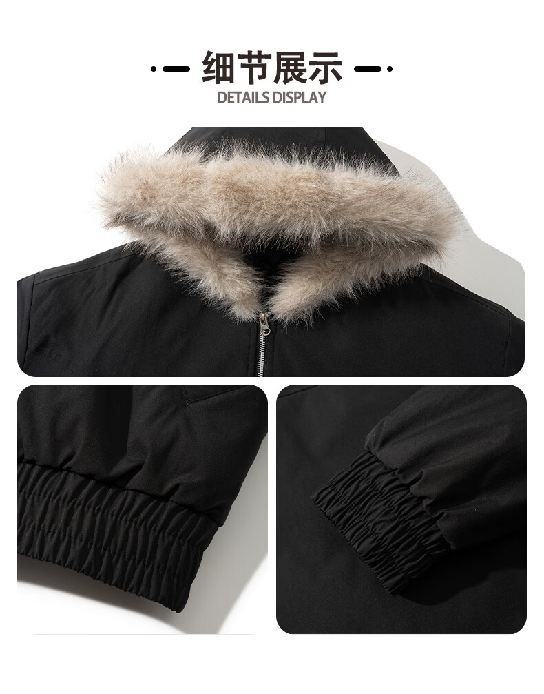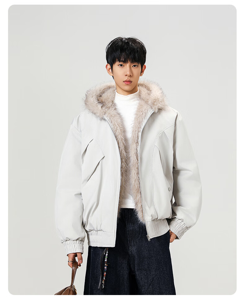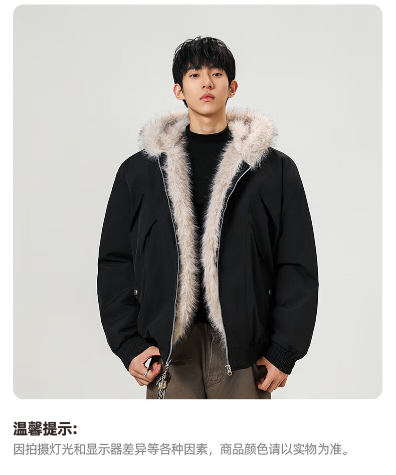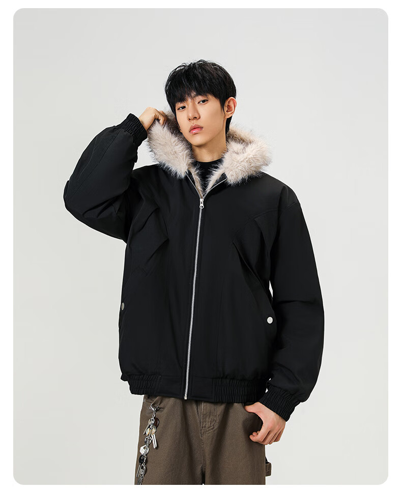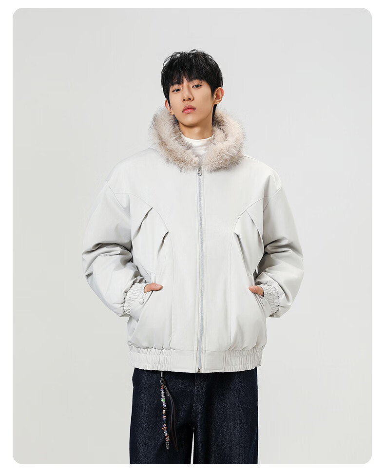 Mountain carving cotton coat fur collar hooded men's autumn and winter loose trendy pleated design warm couple cotton coat khaki 2XL