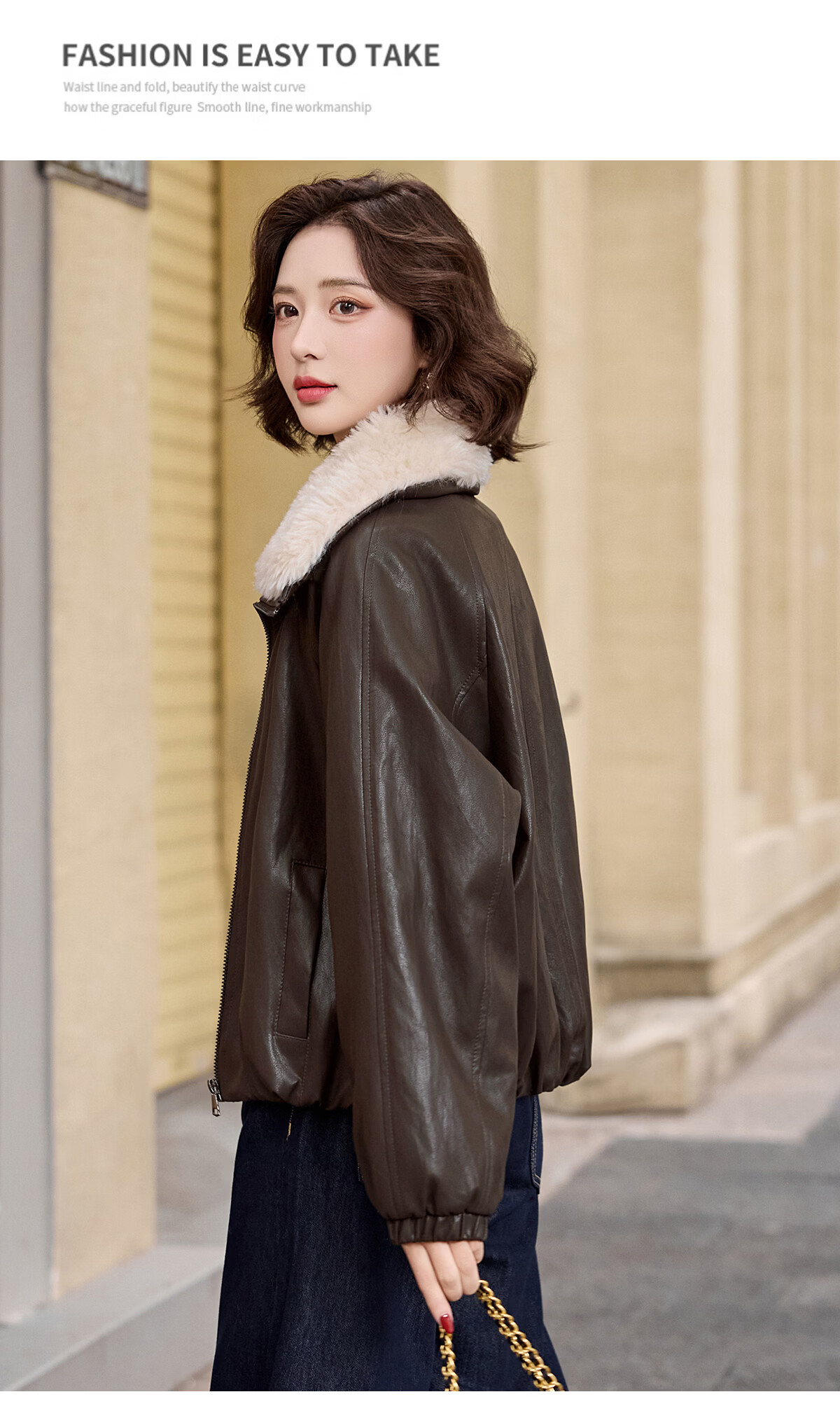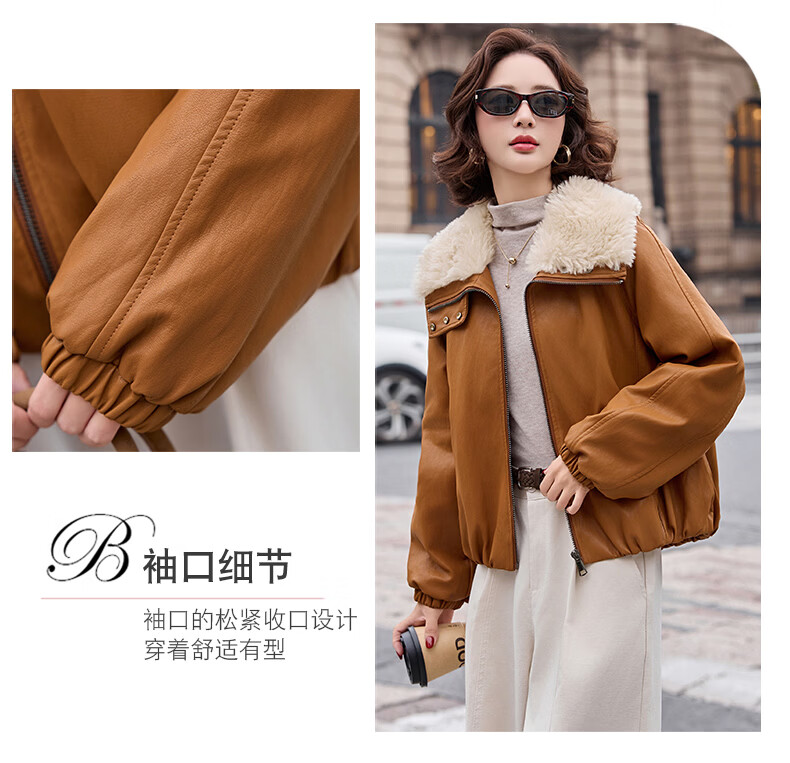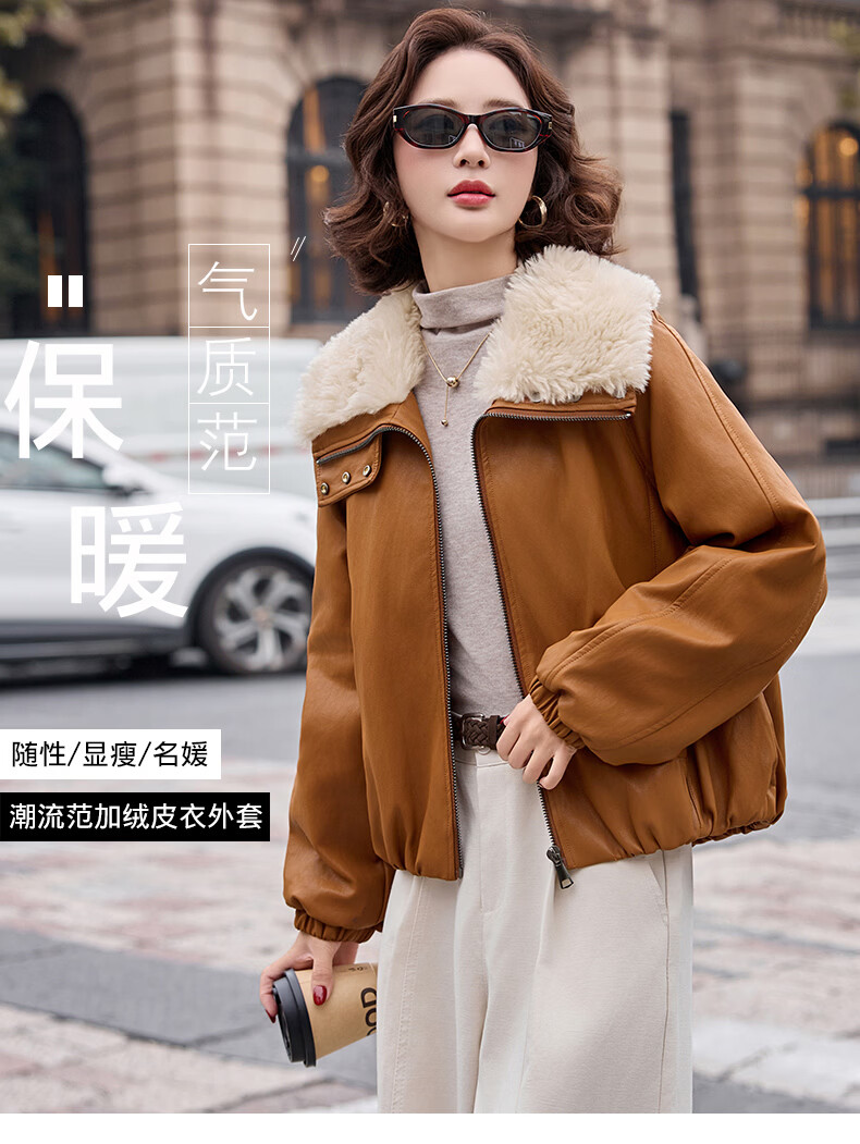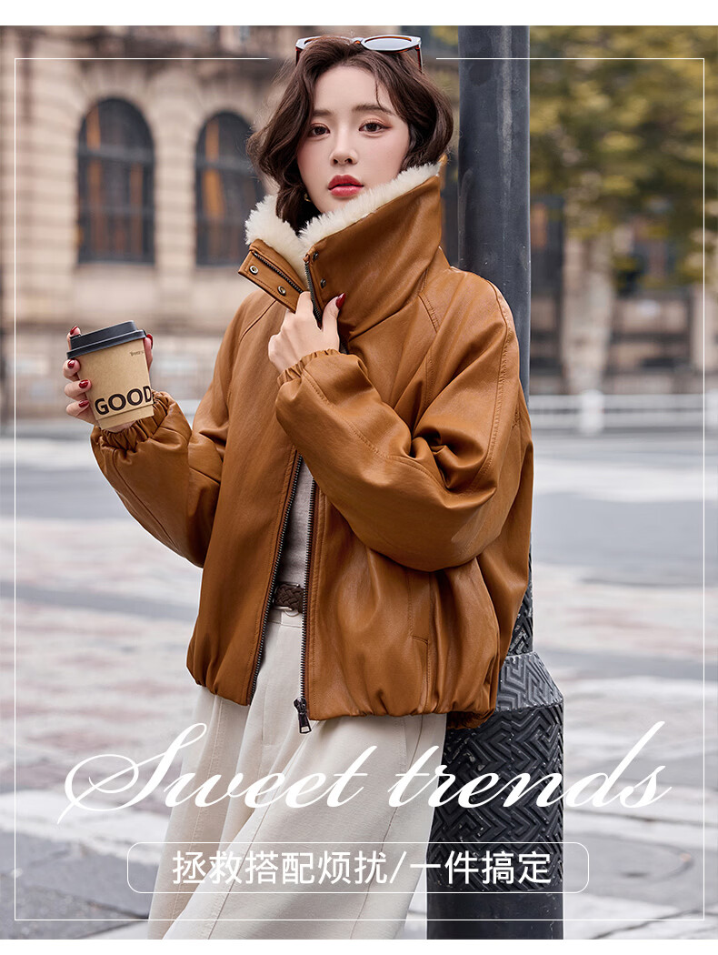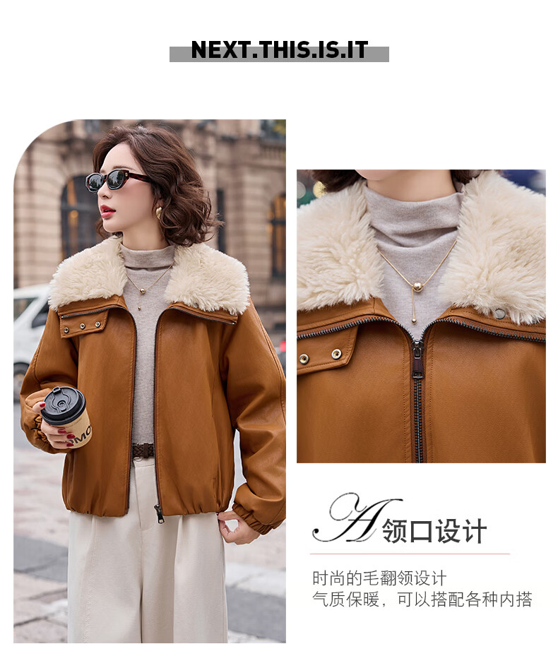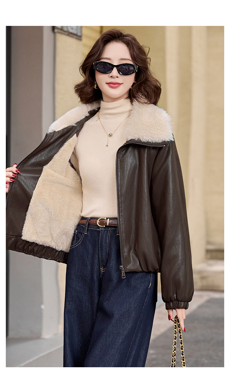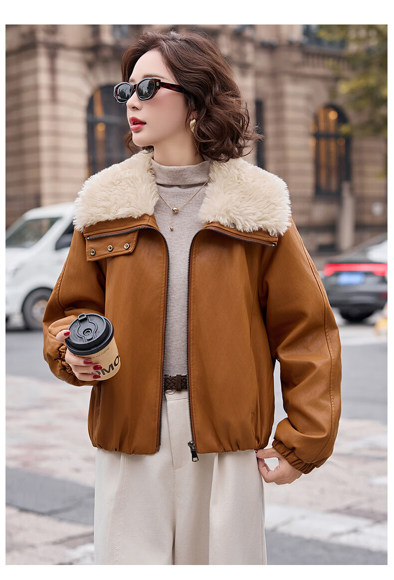 Chuxin velvet thickened PU leather jacket women's short 2025 winter new style women's retro style warm high-end jacket coffee color (velvet thickened) M