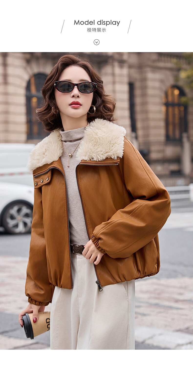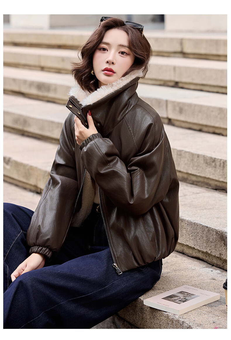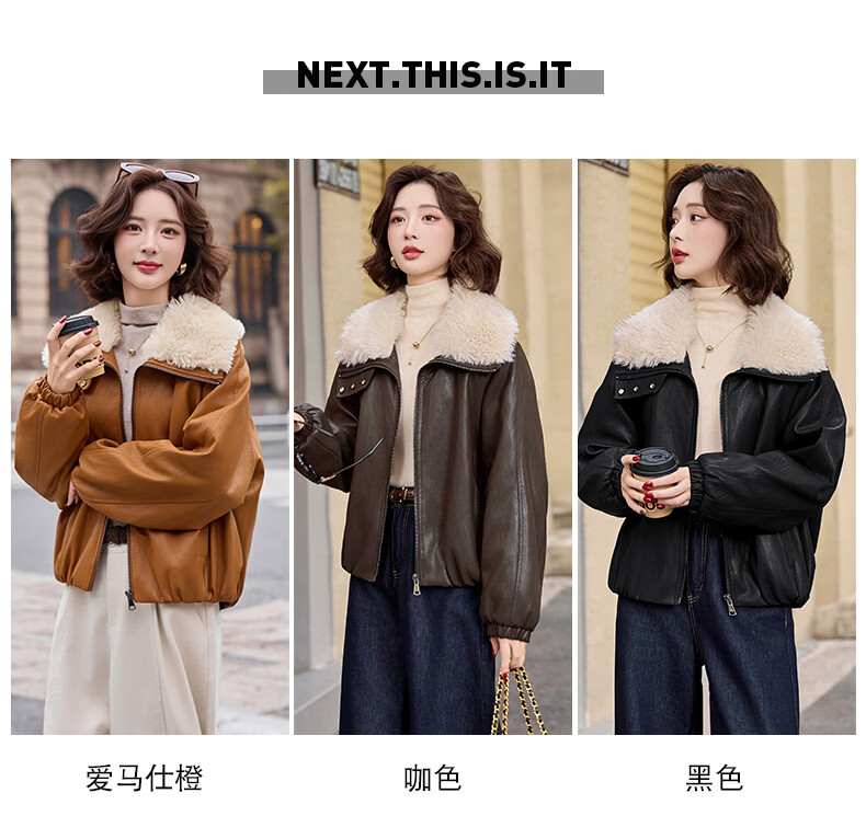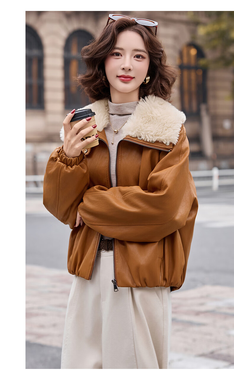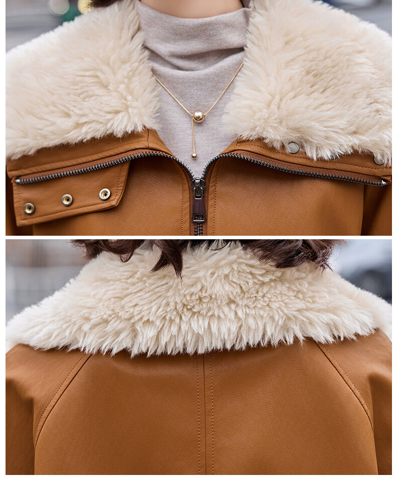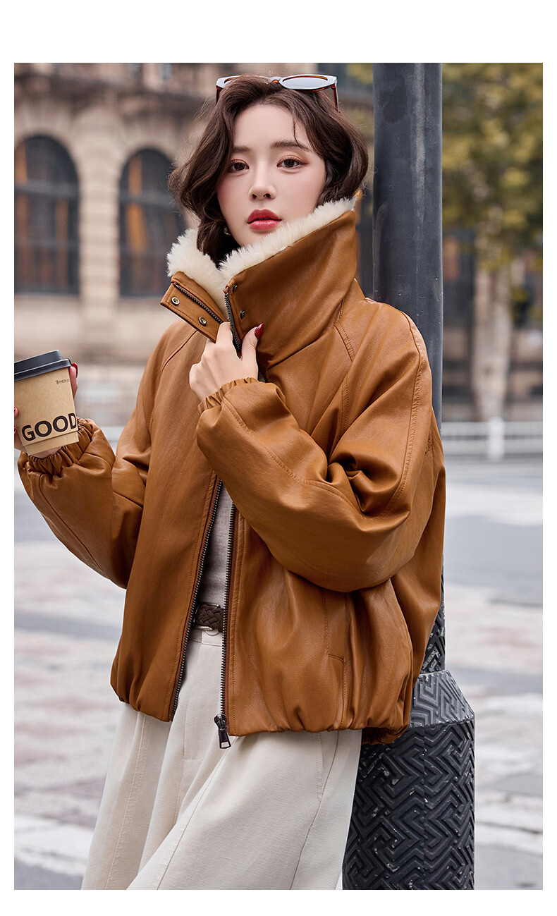 Chuxin velvet thickened PU leather jacket women's short 2025 winter new style women's retro style warm high-end jacket coffee color (velvet thickened) M