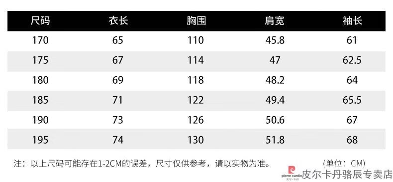 China (cm) 165 / 88-90 170 / 96-98 175 / 108-110 180 / 118-122 185 / 126-130