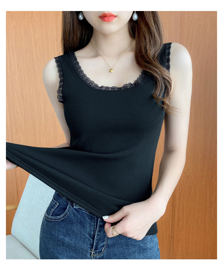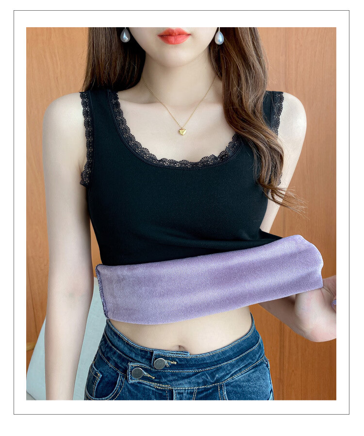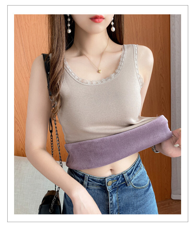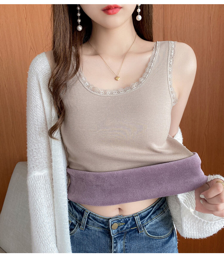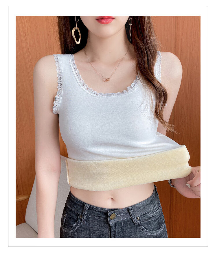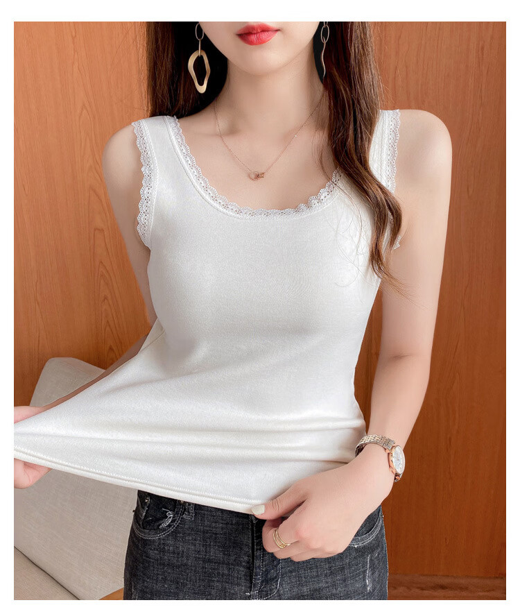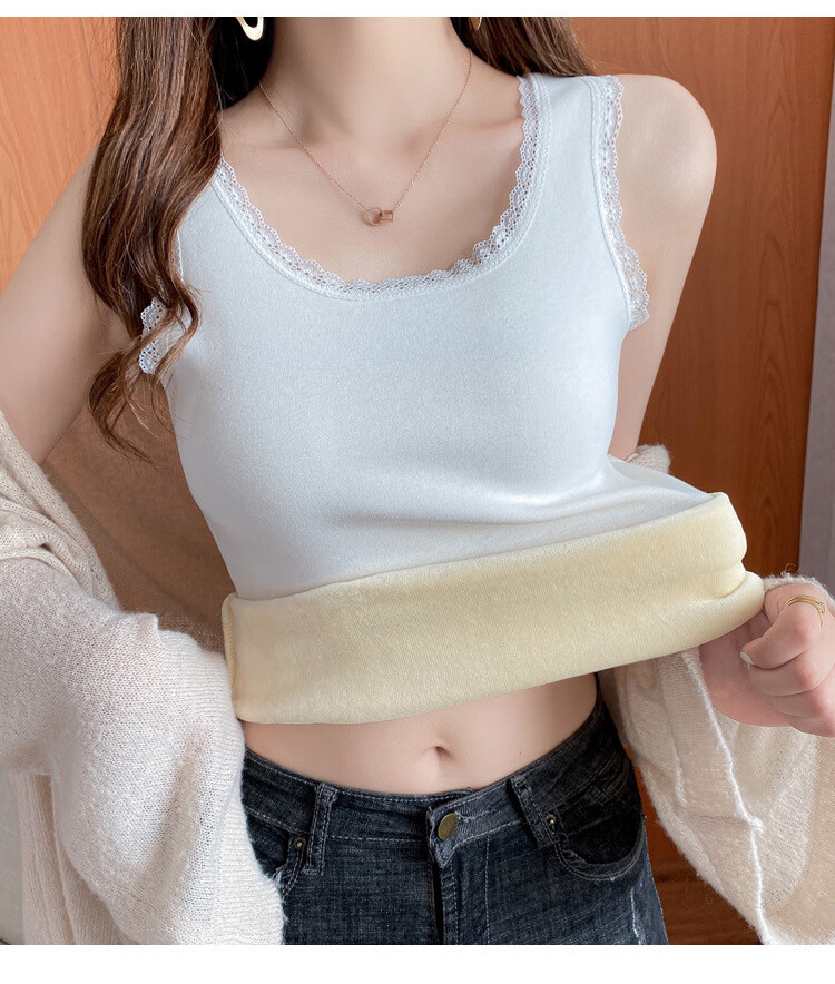 Thermal Vest Women's Velvet Thickened One-piece Velvet Lace Round Neck Autumn and Winter Warm Top Women's Slim Bottoming Shirt White One Size