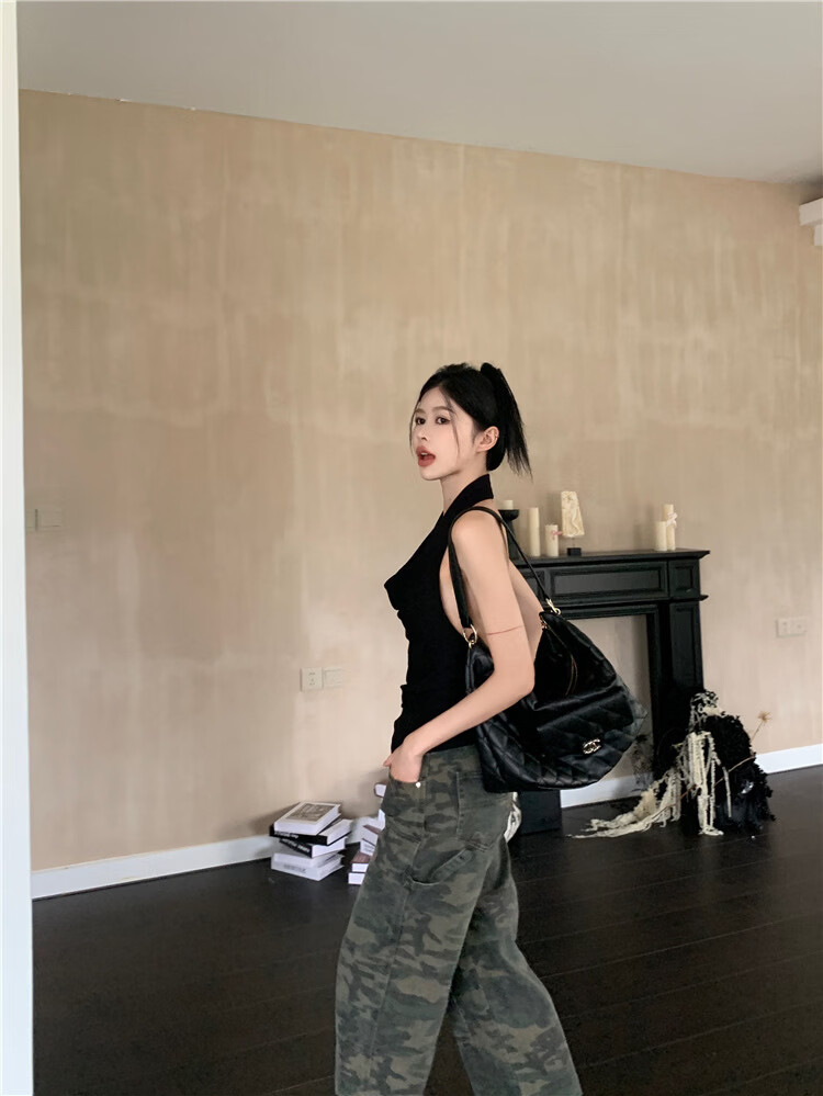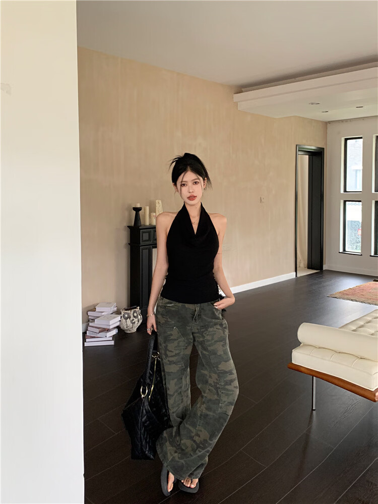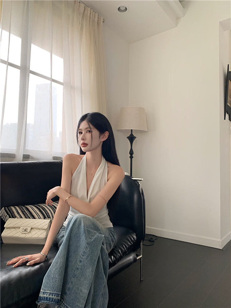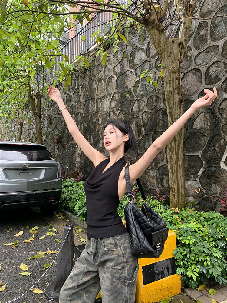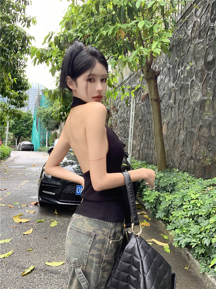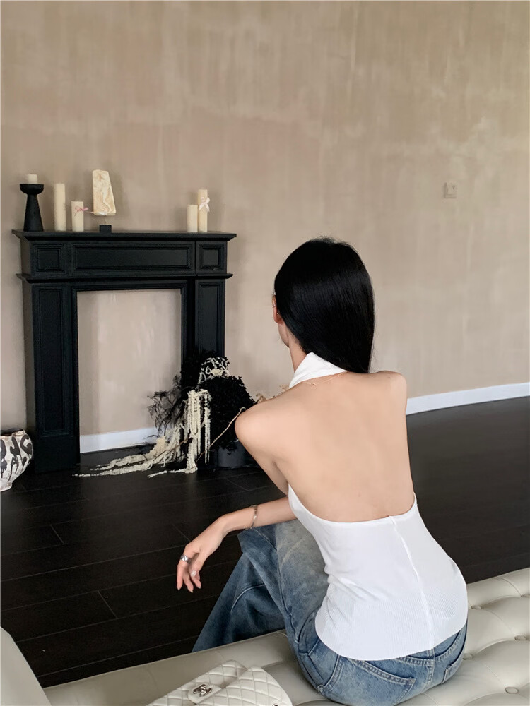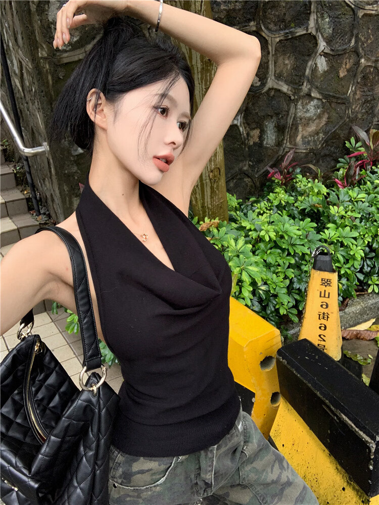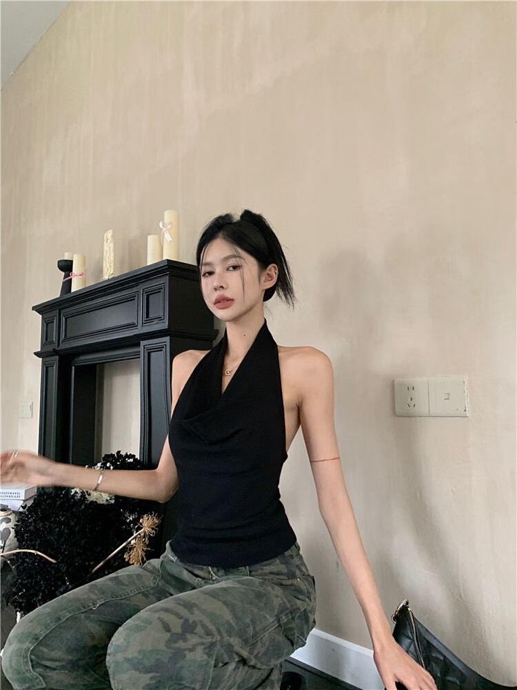 Hot girl sexy swing collar halter top for women summer slim design black sleeveless backless top for outer wear black one size