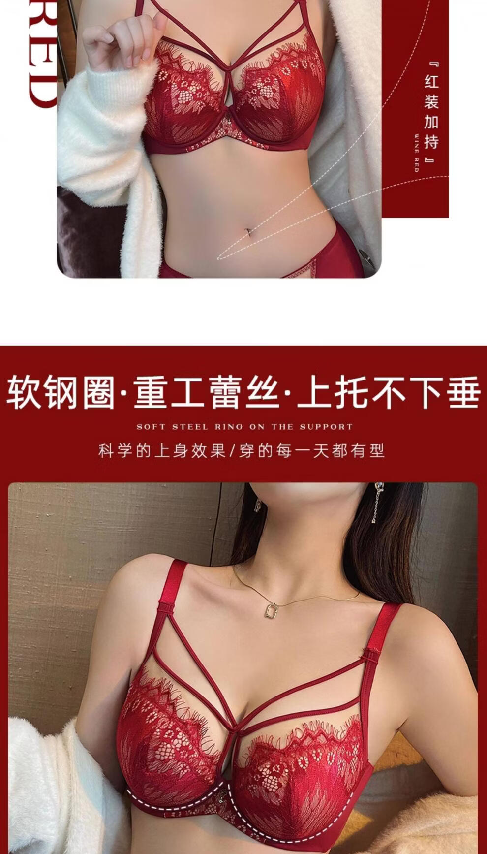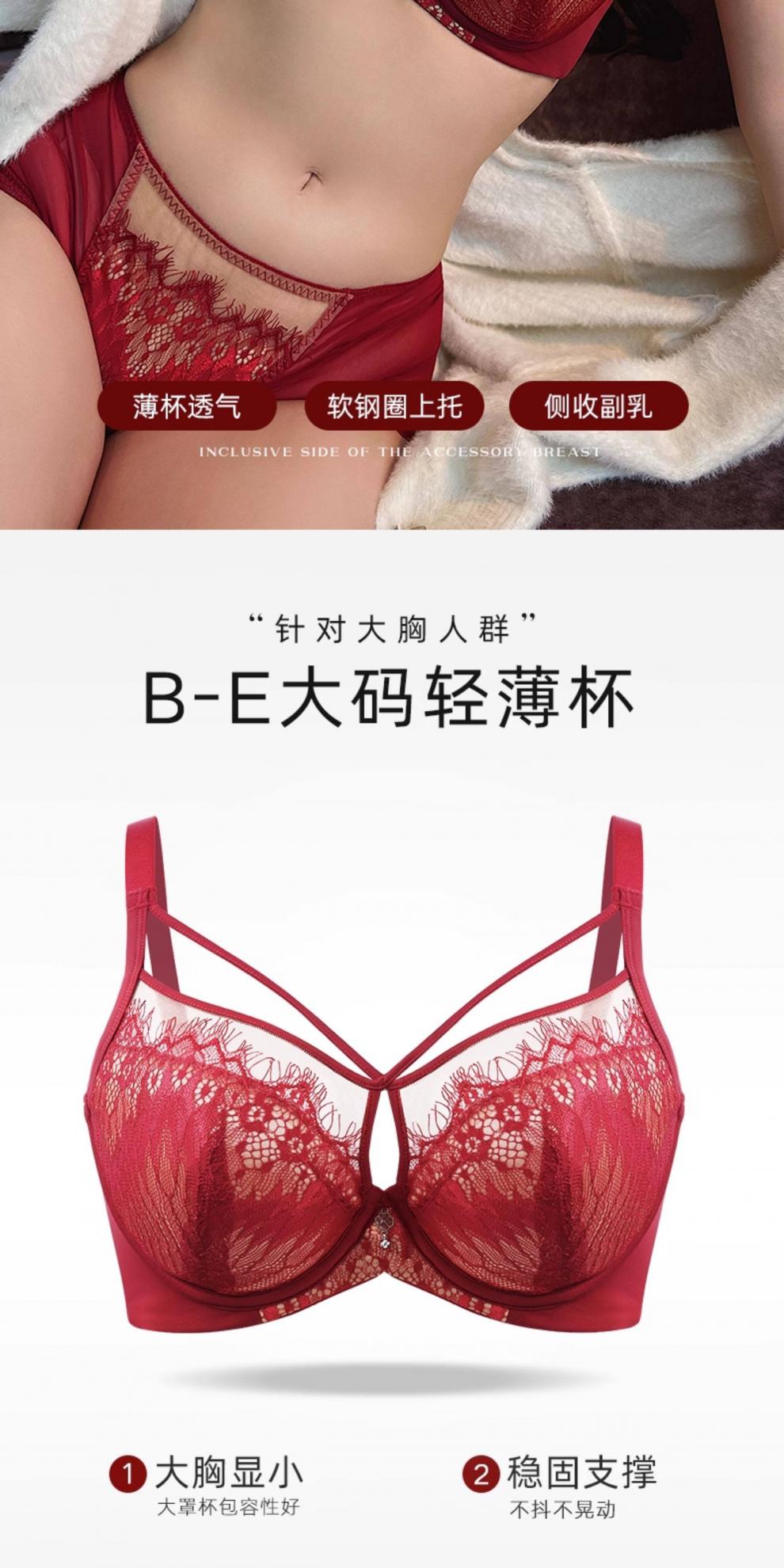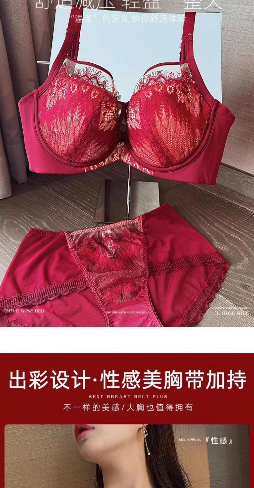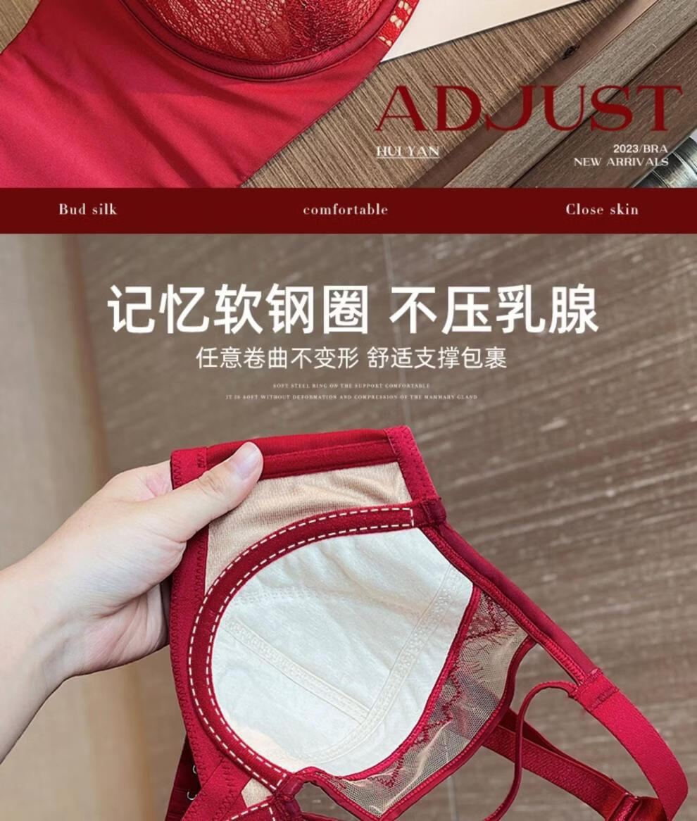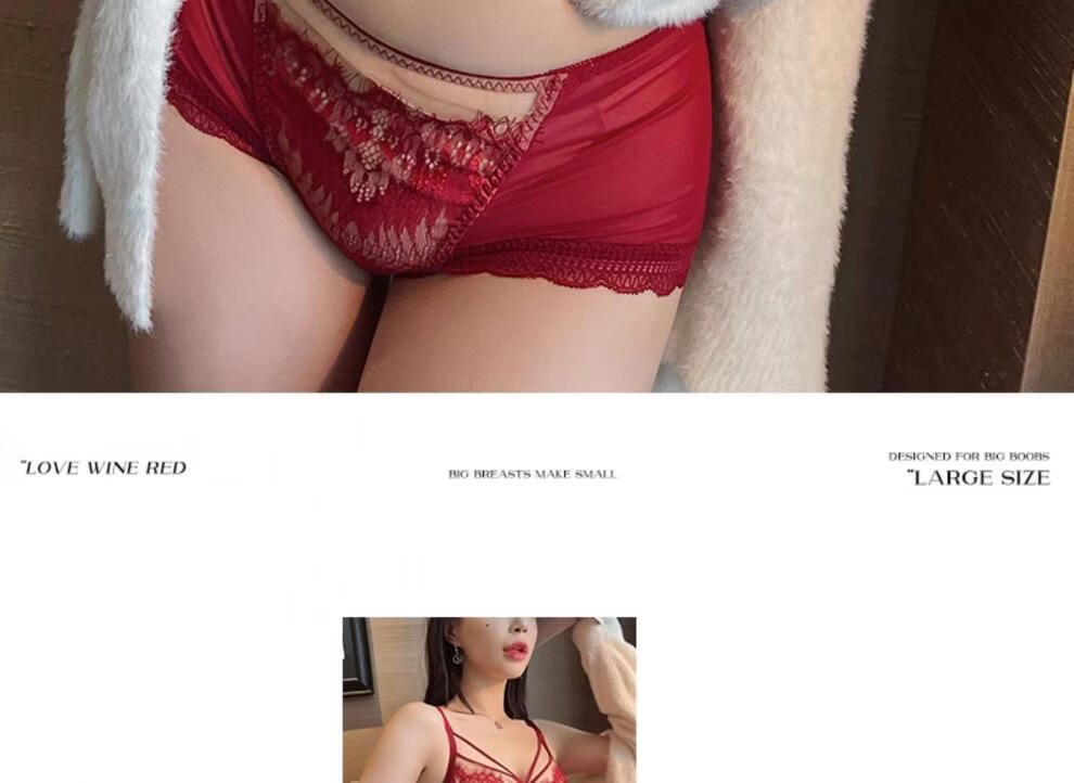 Modal Red Underwear Women's Birthday Festive Sexy Lace Bra Set Gathering Up Anti-Sagging Big Breasts Showing Small Thin Bra Burgundy (Set) 75C 34
