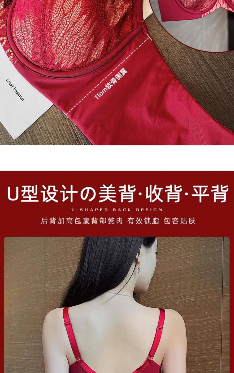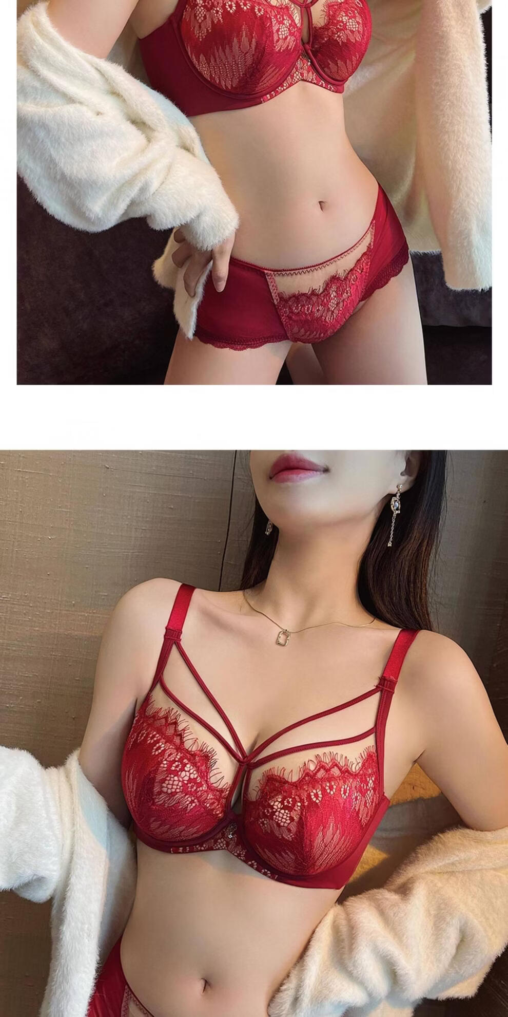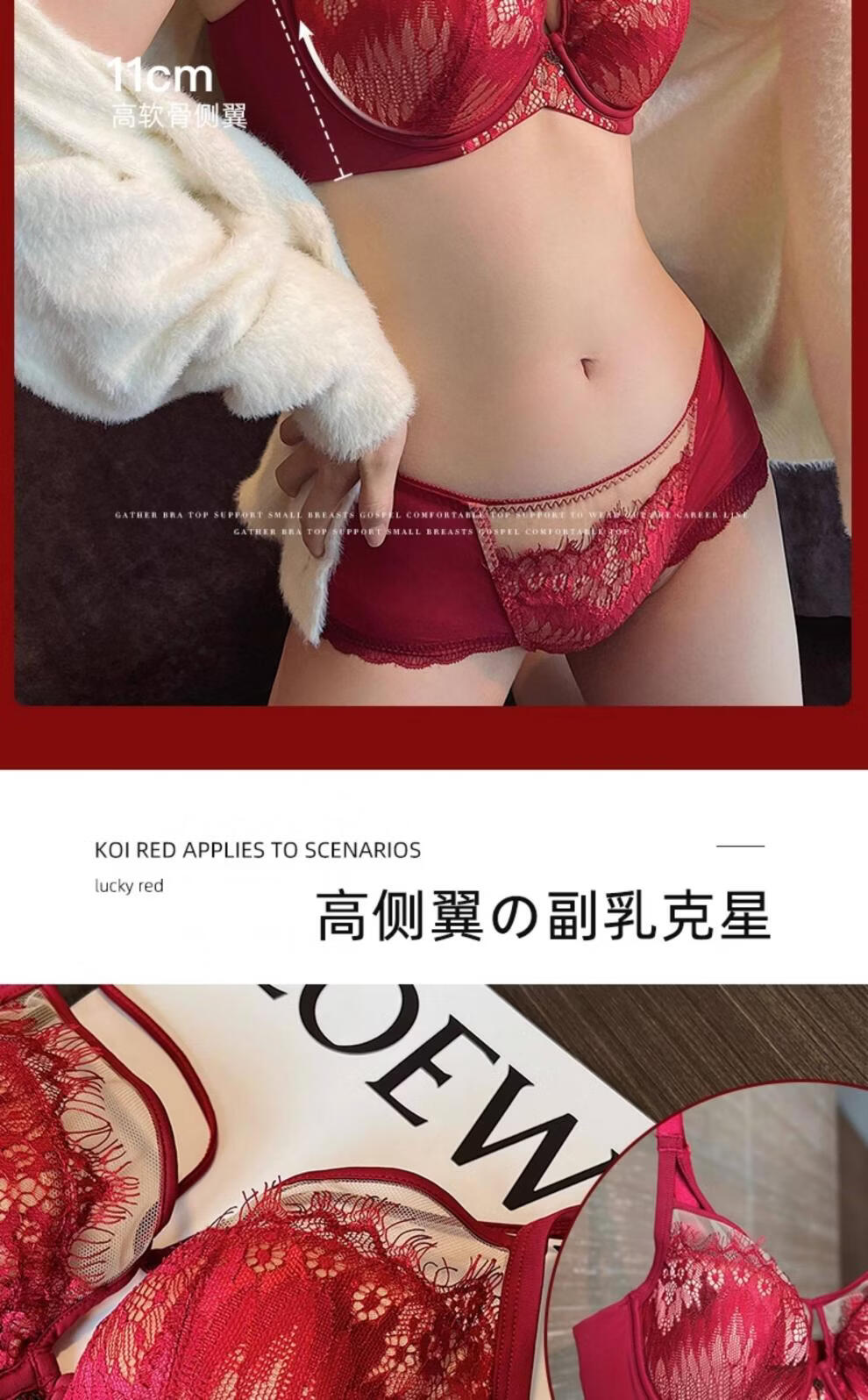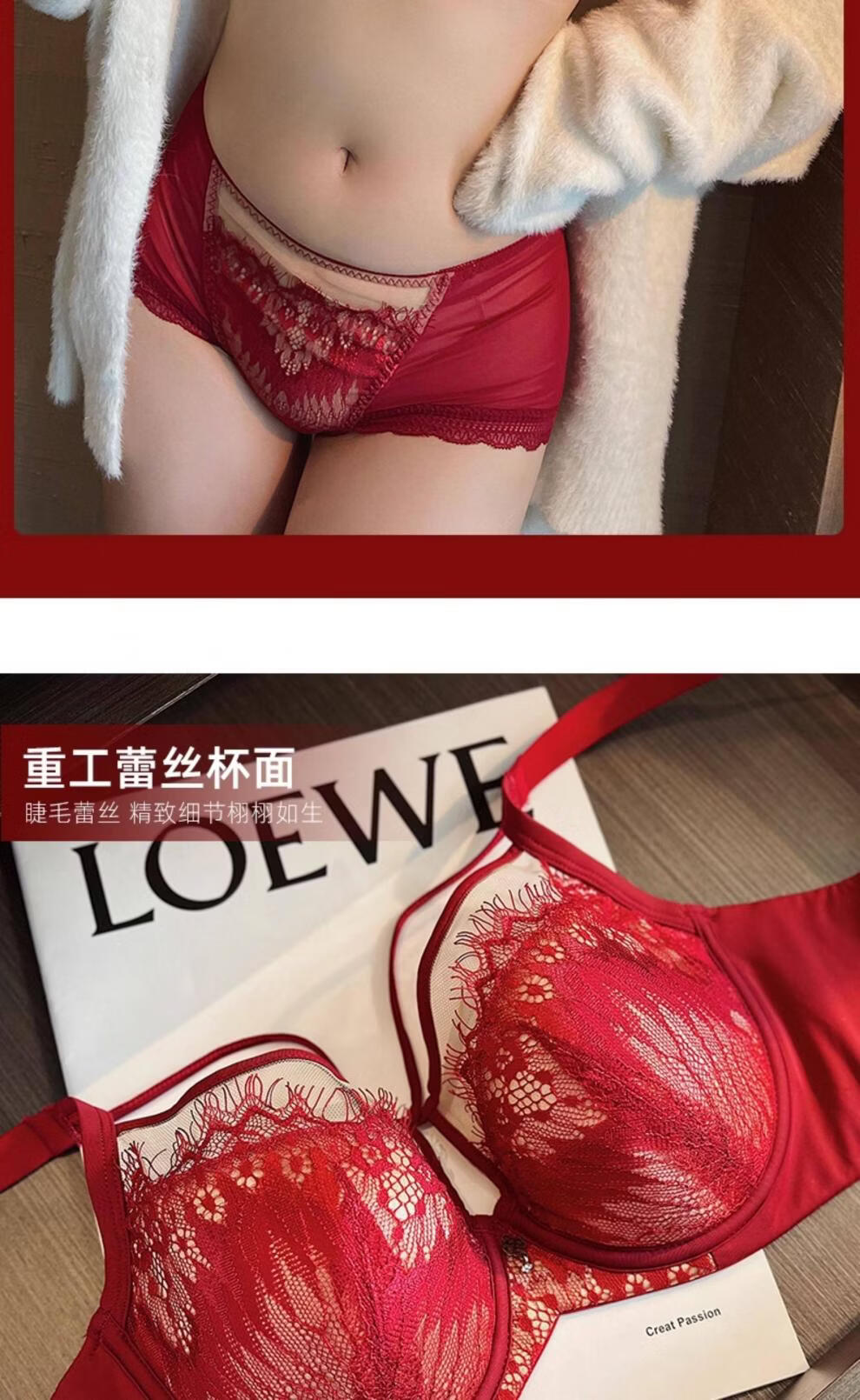 Modal Red Underwear Women's Birthday Festive Sexy Lace Bra Set Gathering Up Anti-Sagging Big Breasts Showing Small Thin Bra Burgundy (Set) 75C 34