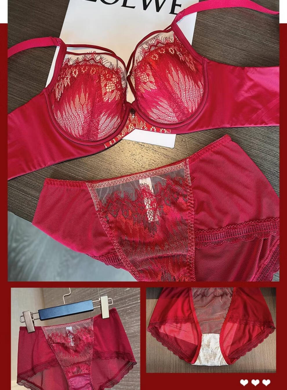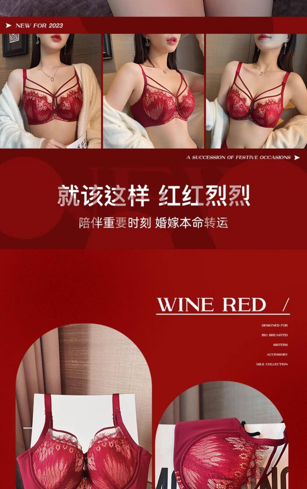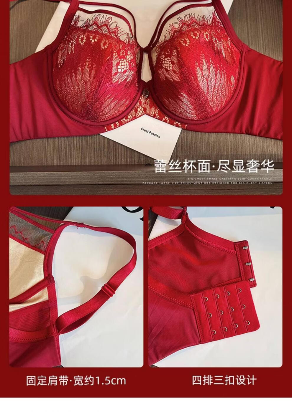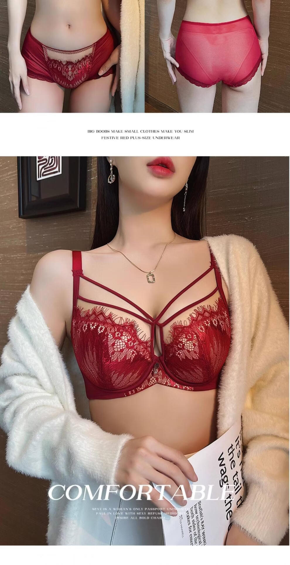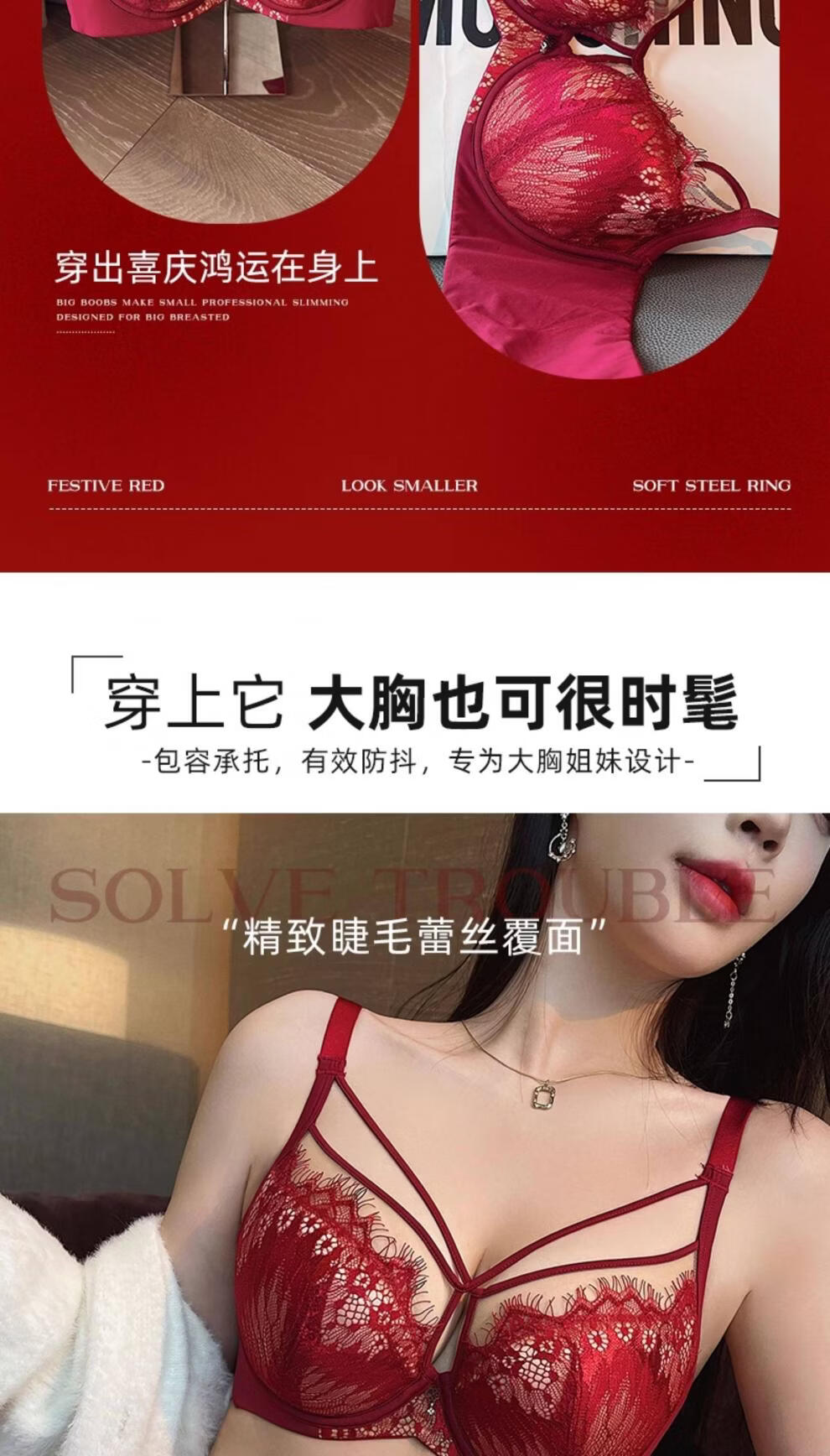 Modal Red Underwear Women's Birthday Festive Sexy Lace Bra Set Gathering Up Anti-Sagging Big Breasts Showing Small Thin Bra Burgundy (Set) 75C 34
