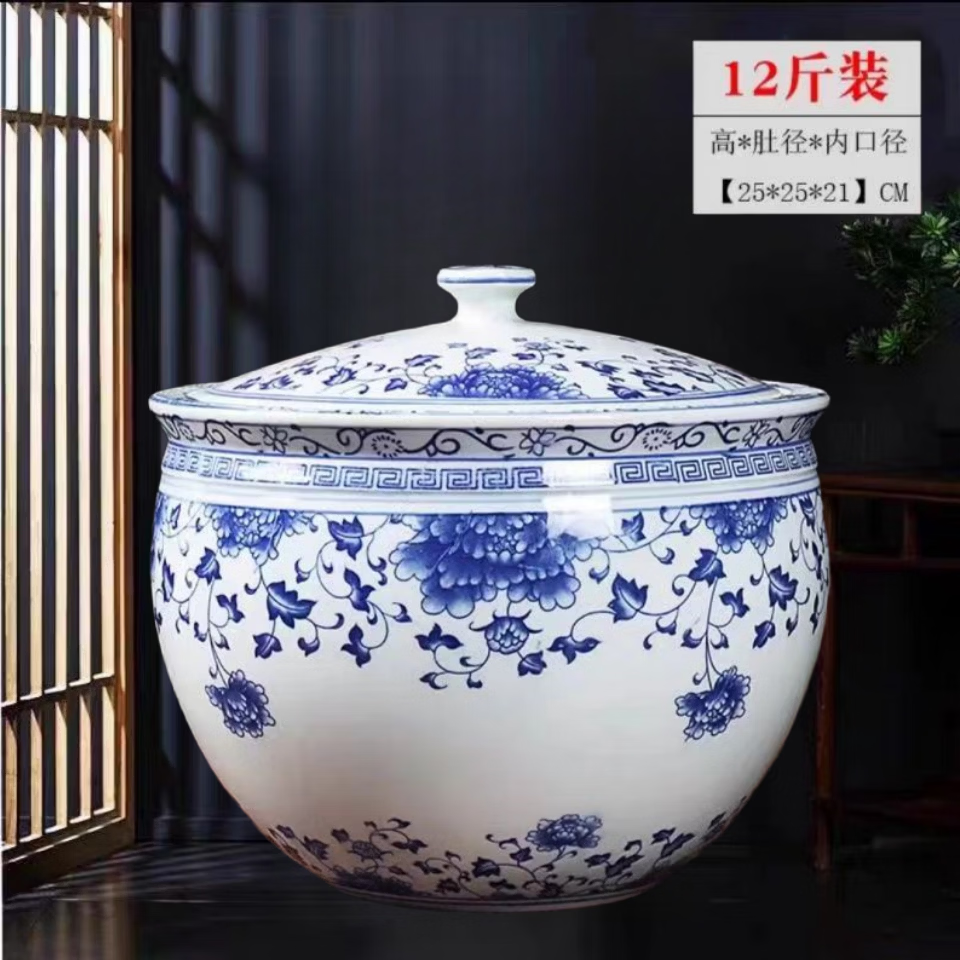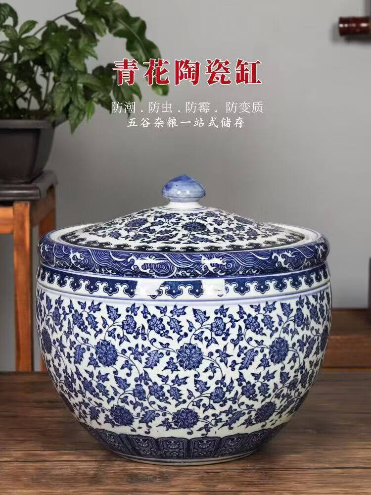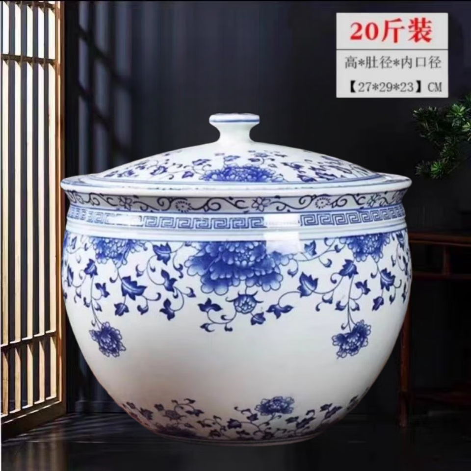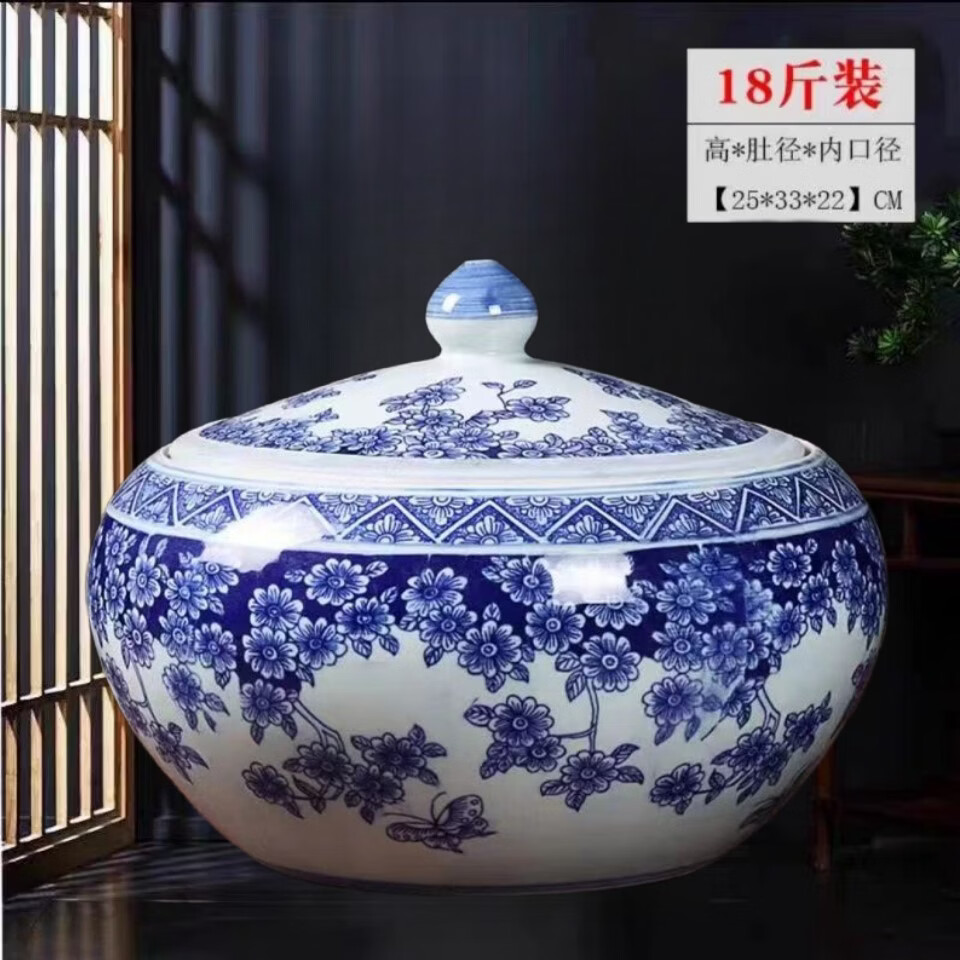 Jingyan blue and white ceramic storage jar rice wine lard salt noodles flour sealed moisture-proof grain jar with lid for pickling 18Jin Jin is equal to 0.5kg round twig lotus (height 25 width 33) comes with sealing ring