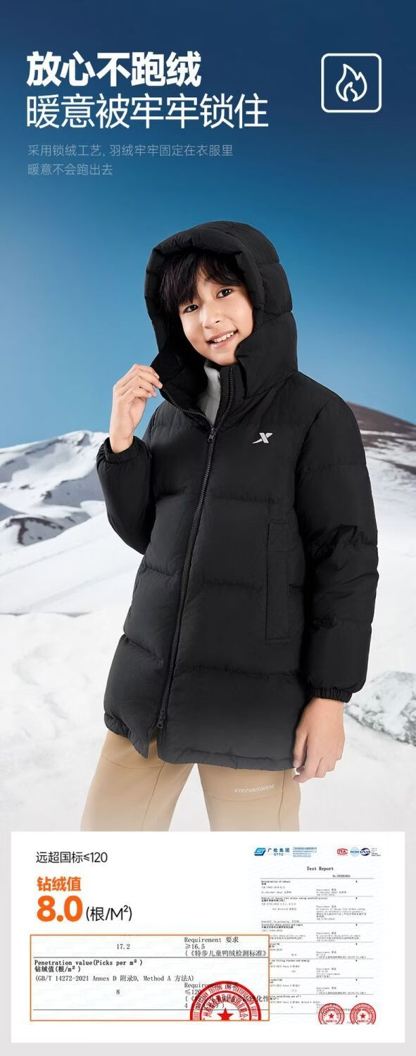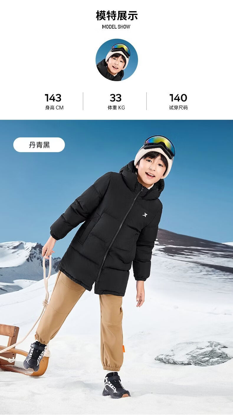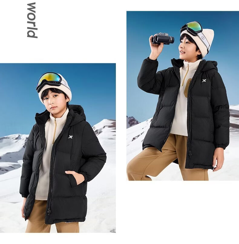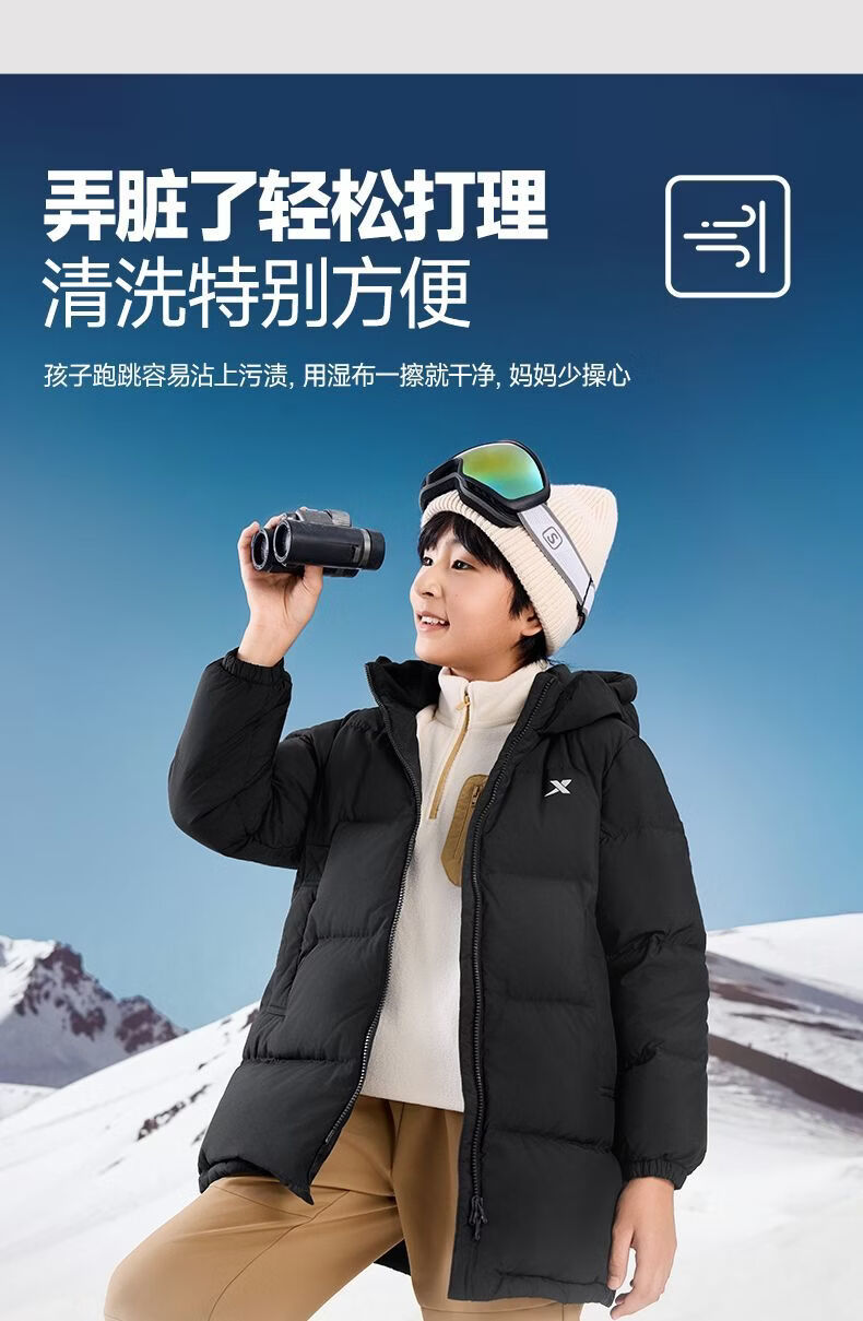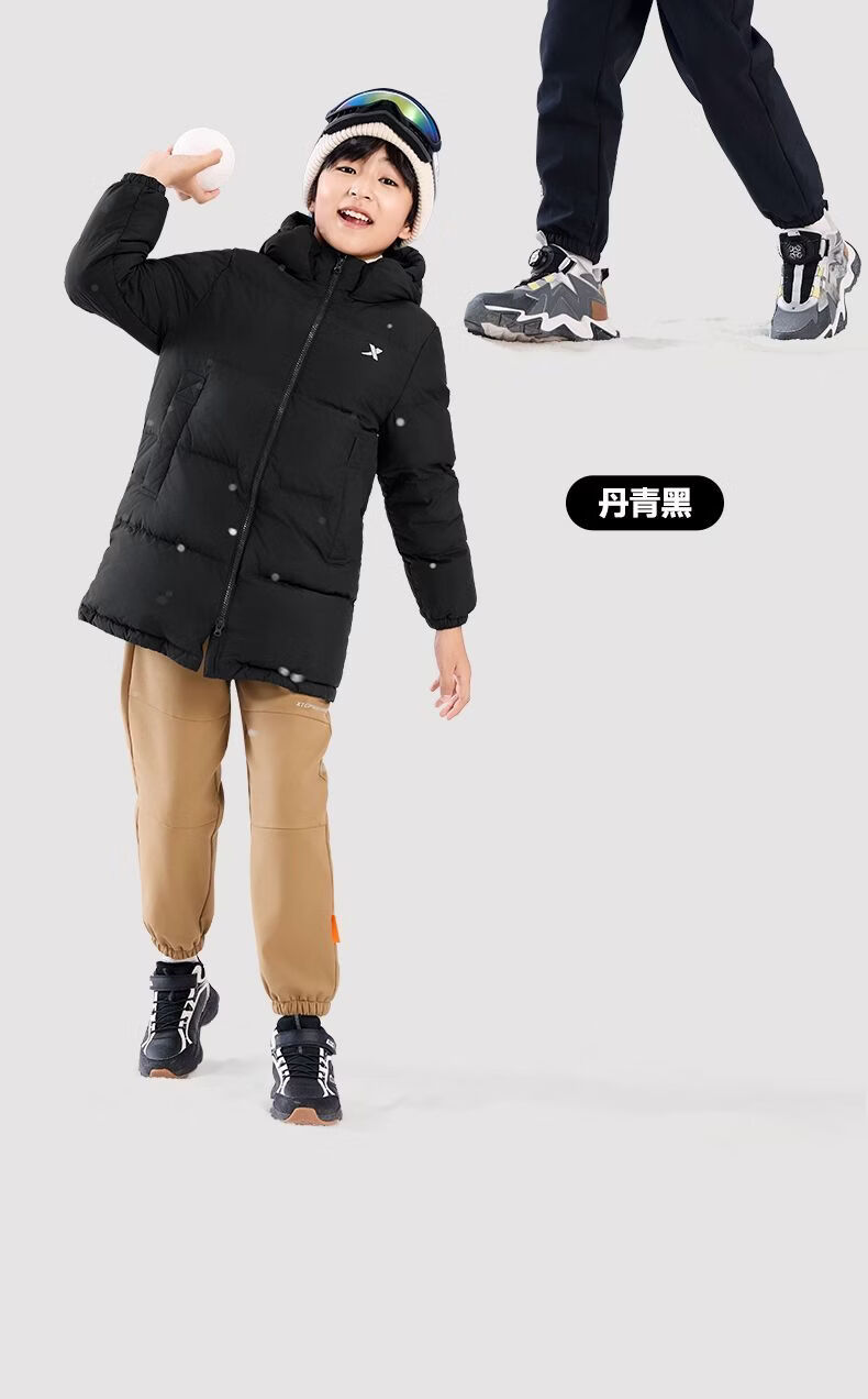 XTEP (XTEP) XTEP Children's Clothing Boys' Mid-Length Down Jacket Three-proof Warmth 2025 Winter New Medium and Large Children's Hooded Windproof Jacket Danqing Black 110