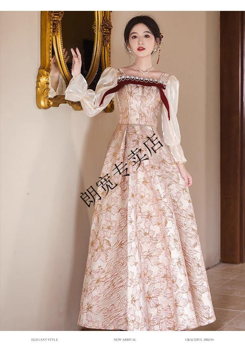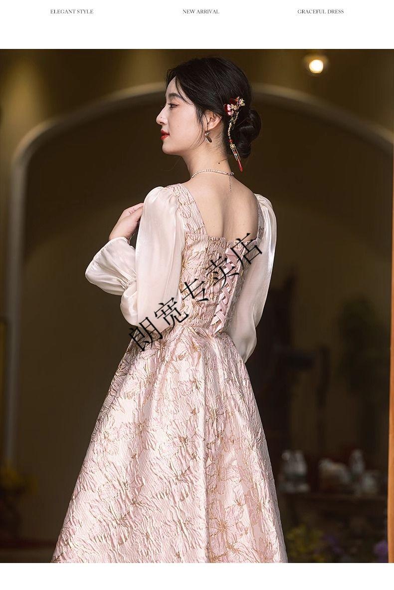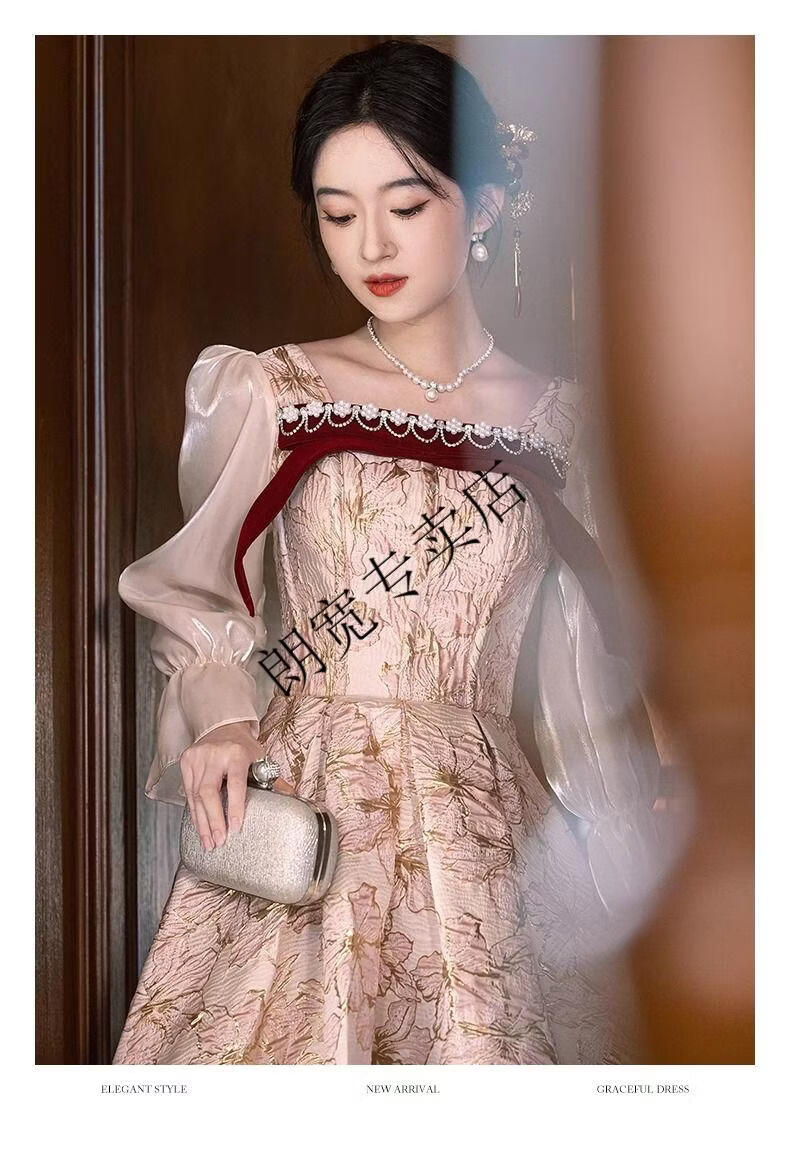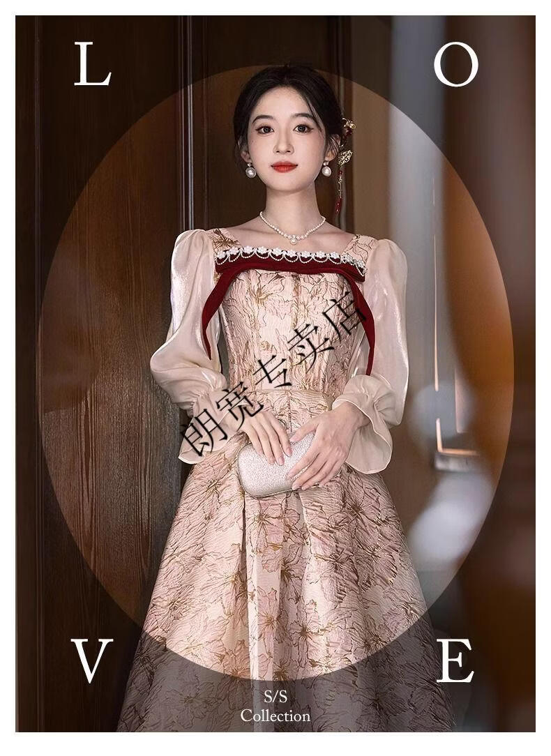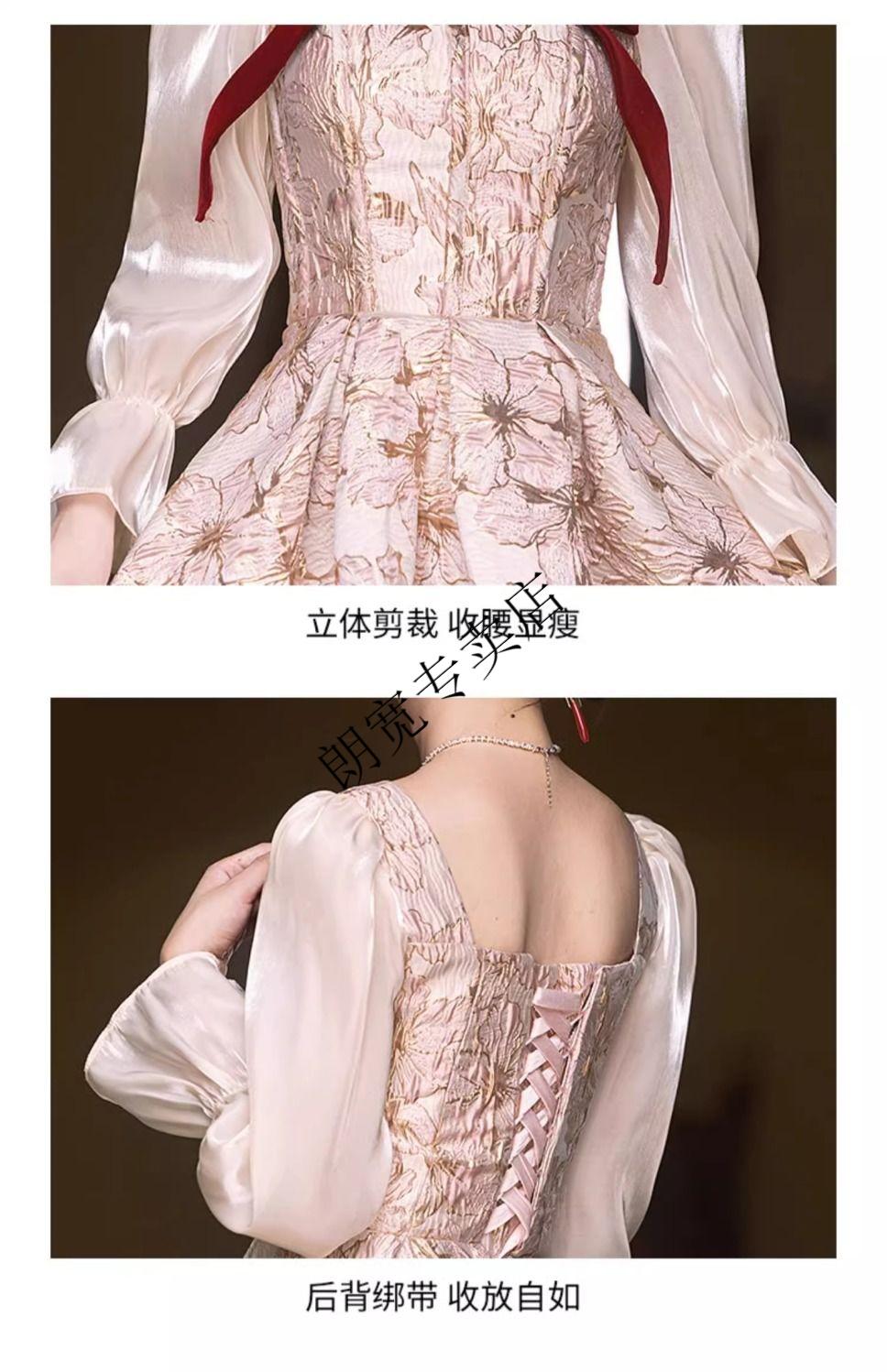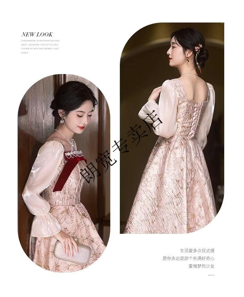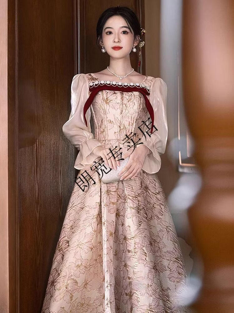 Pierre Cardin Engagement Dress Women 2025 New Style Spring Long-Sleeved Toast Wear Bridal Fashion Slim Dress Champagne 2XL