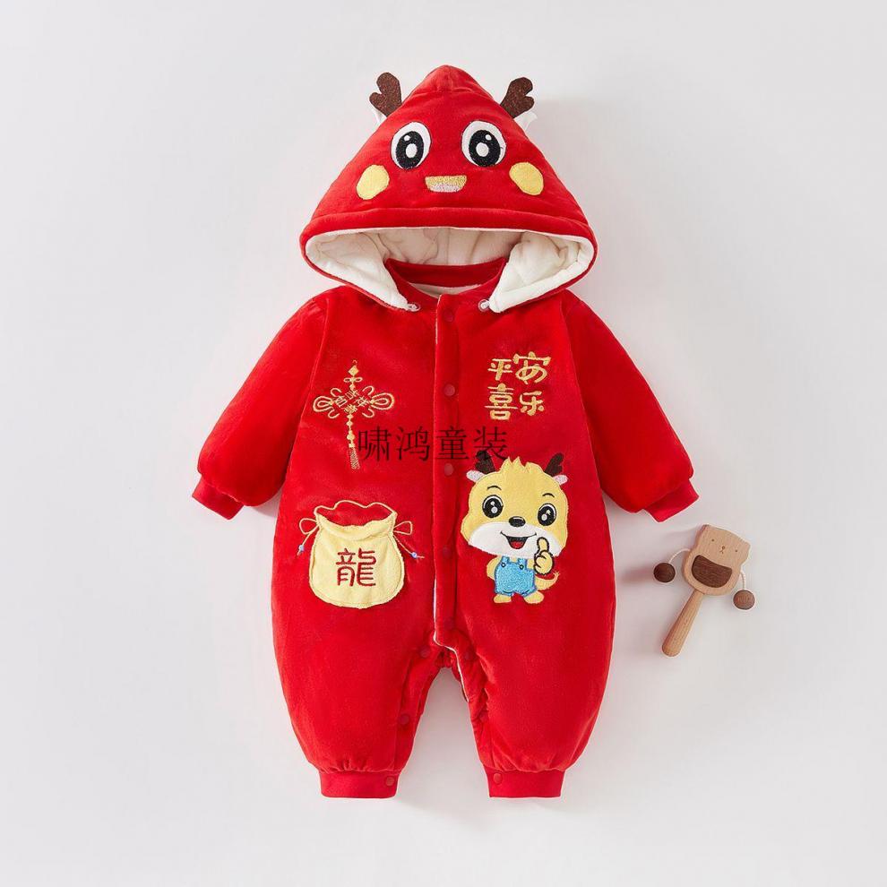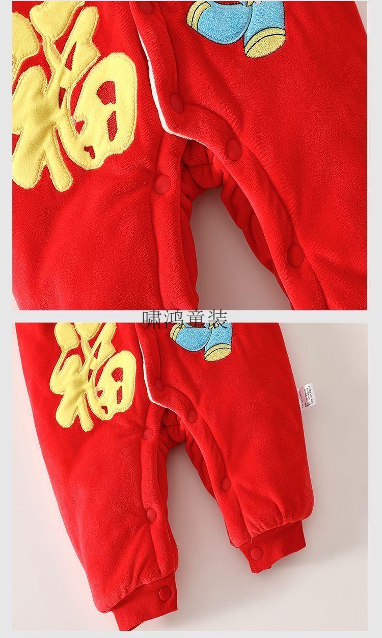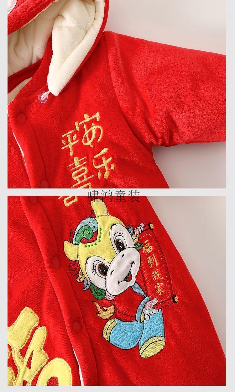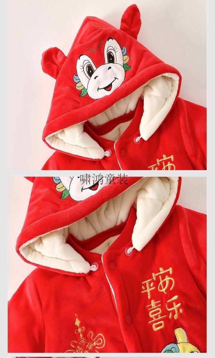 Wooden house baby New Year's greetings New Year's jumpsuit autumn and winter velvet thickened khaki baby quilted warm winter hooded cotton coat 4038 Hima thick cotton khaki 100cm recommended 23-29Jin Jin equals 0.5 kg