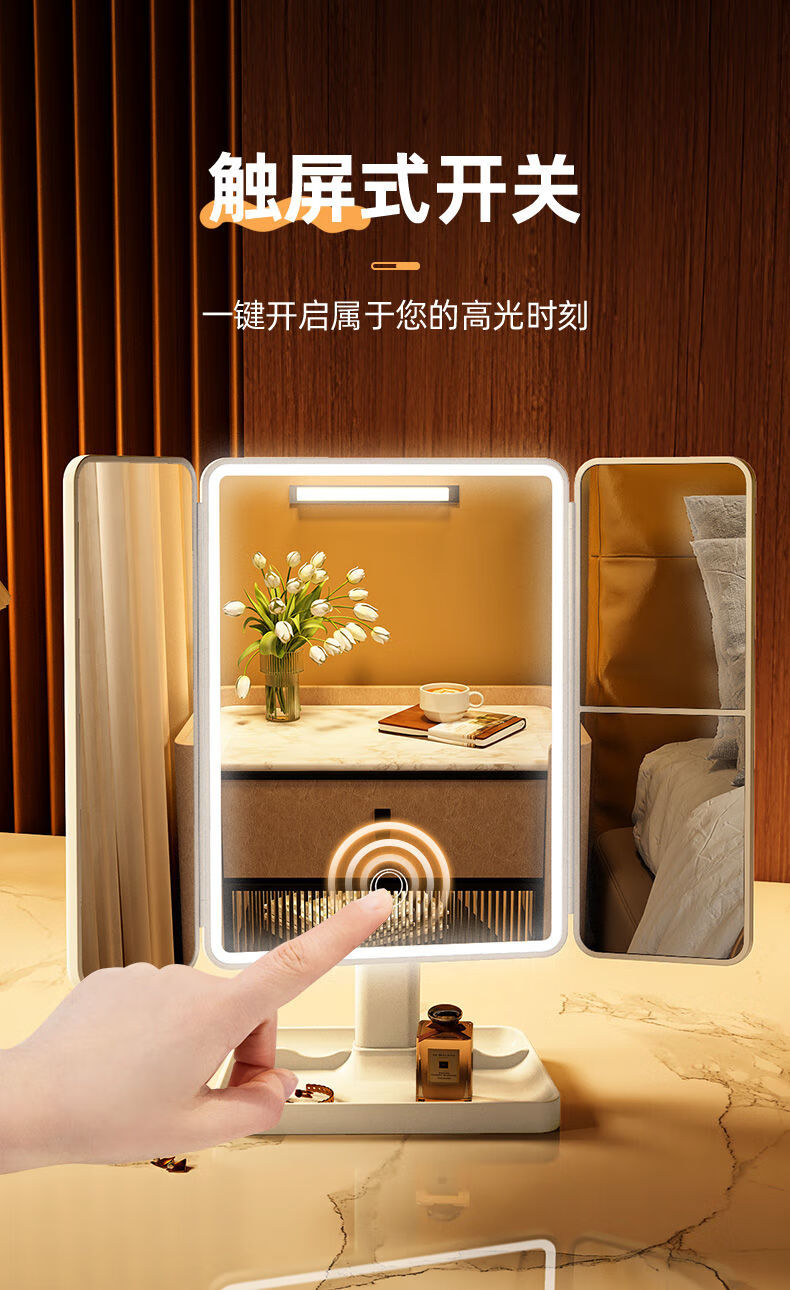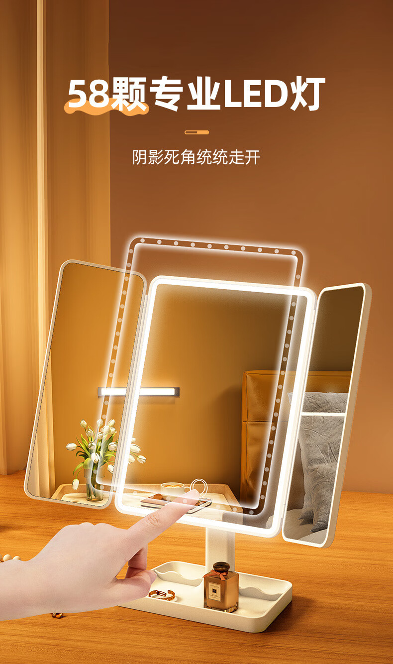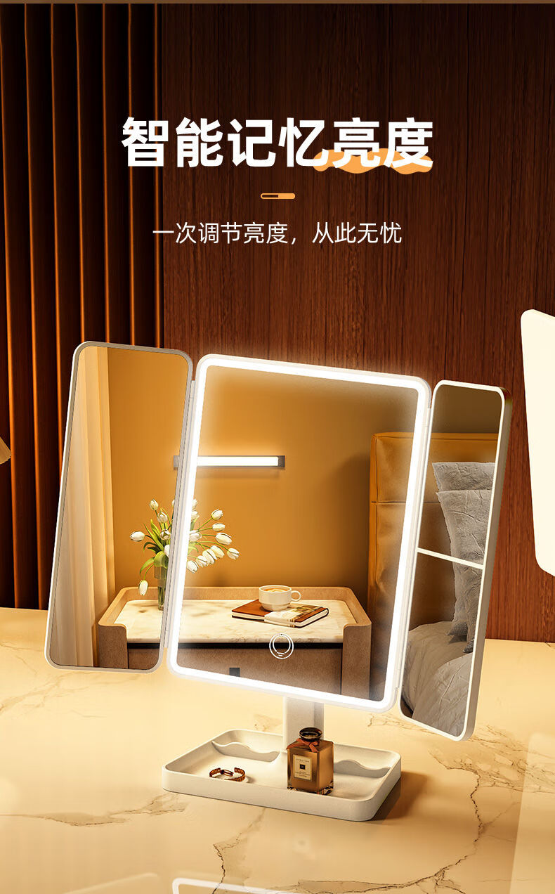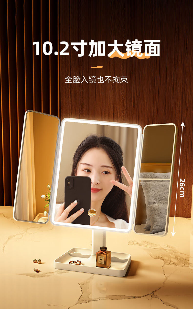 Danyang Qingtian (DYQT) 2025 new makeup mirror LED with light desktop desktop folding home student dormitory magnifying dressing beauty mirror jade porcelain white three-tone light rechargeable model