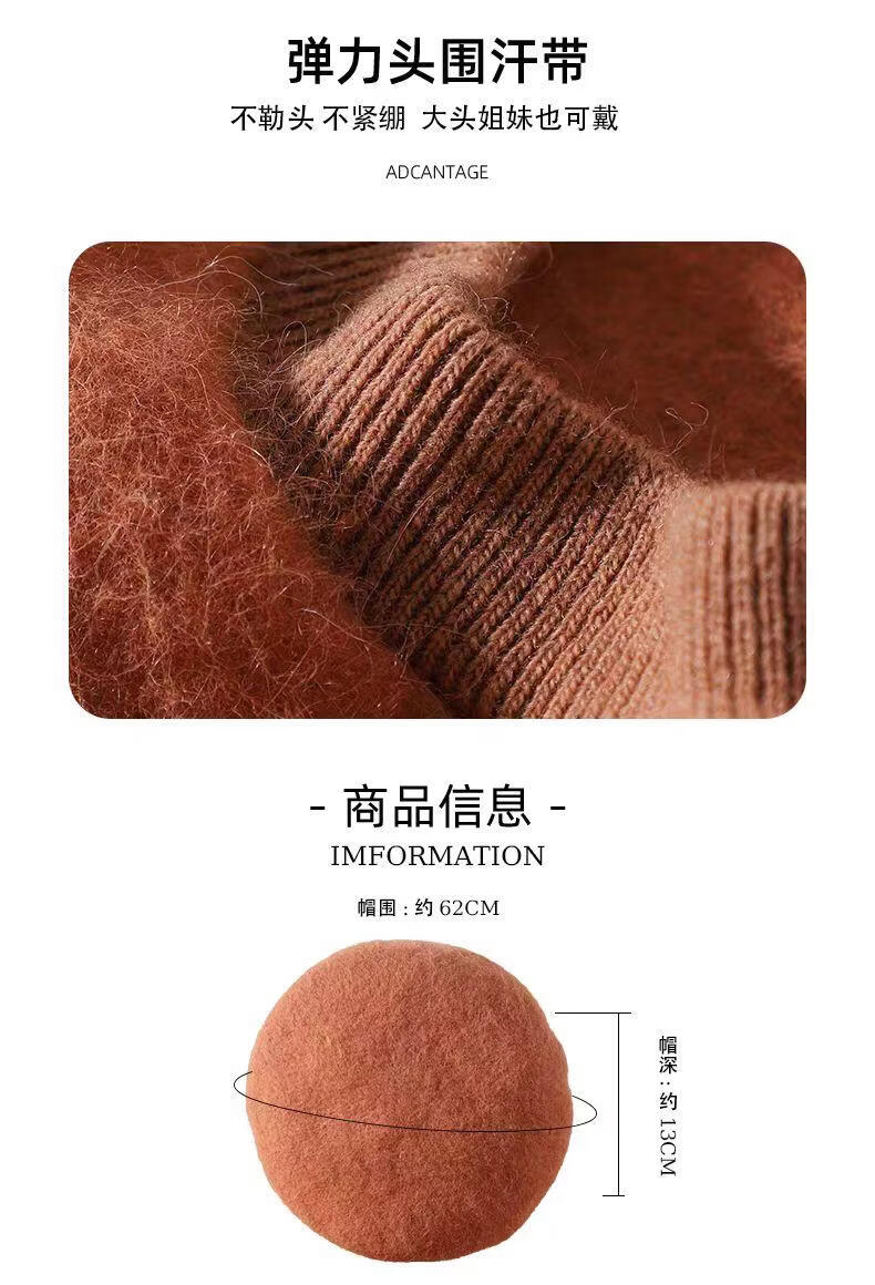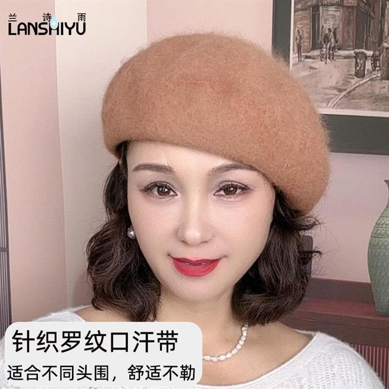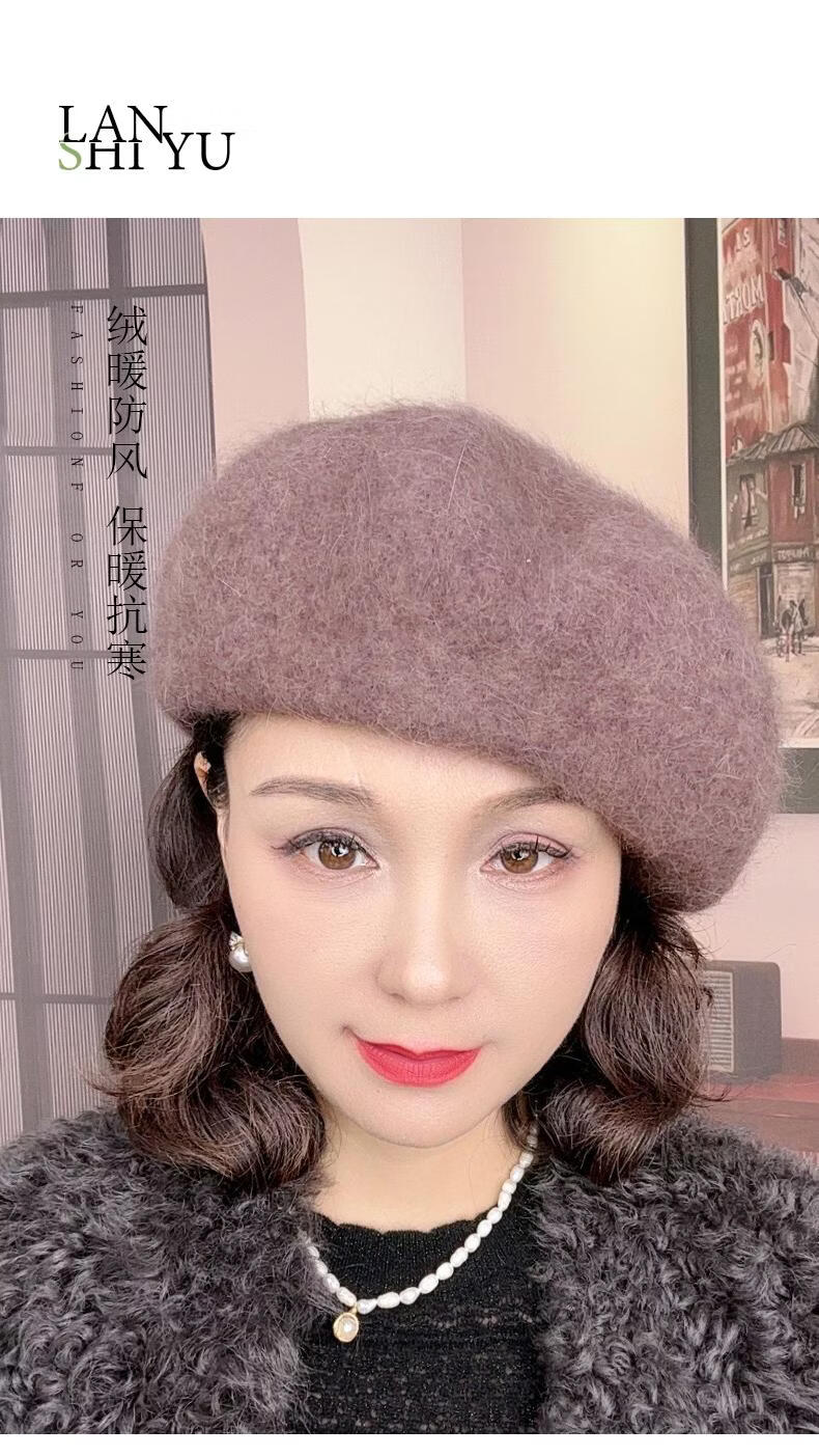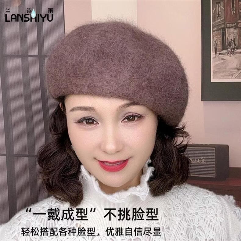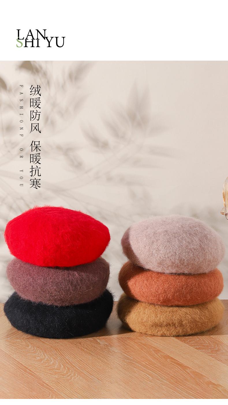 Lanshiyu rabbit hair and wool interwoven women's autumn and winter warm solid color versatile British pumpkin hat fashionable Korean style beret khaki