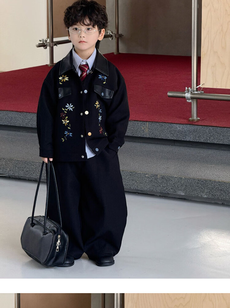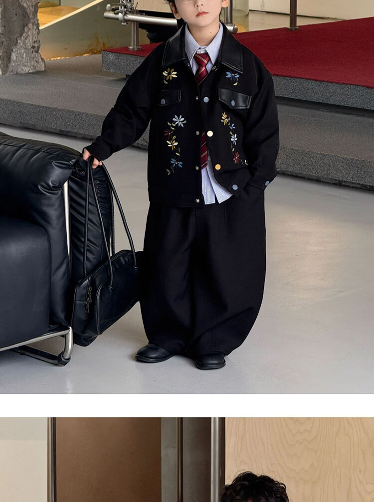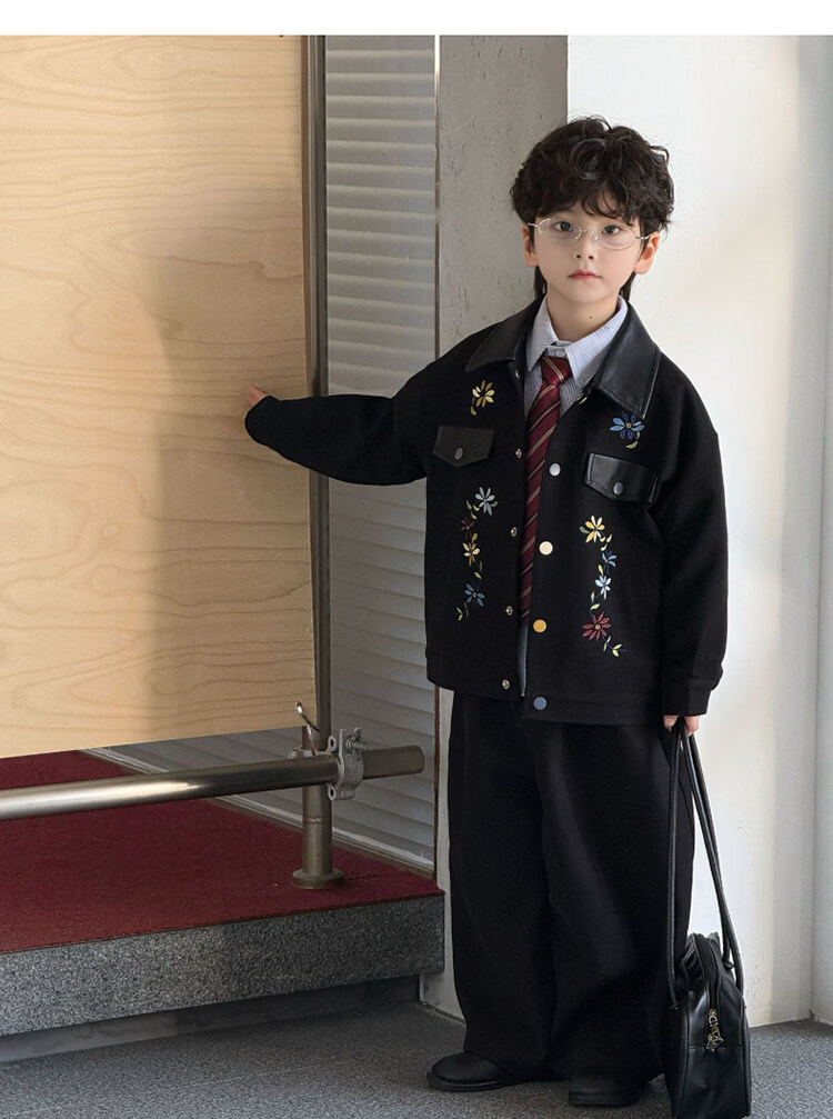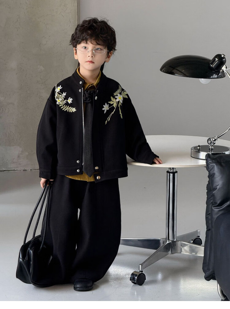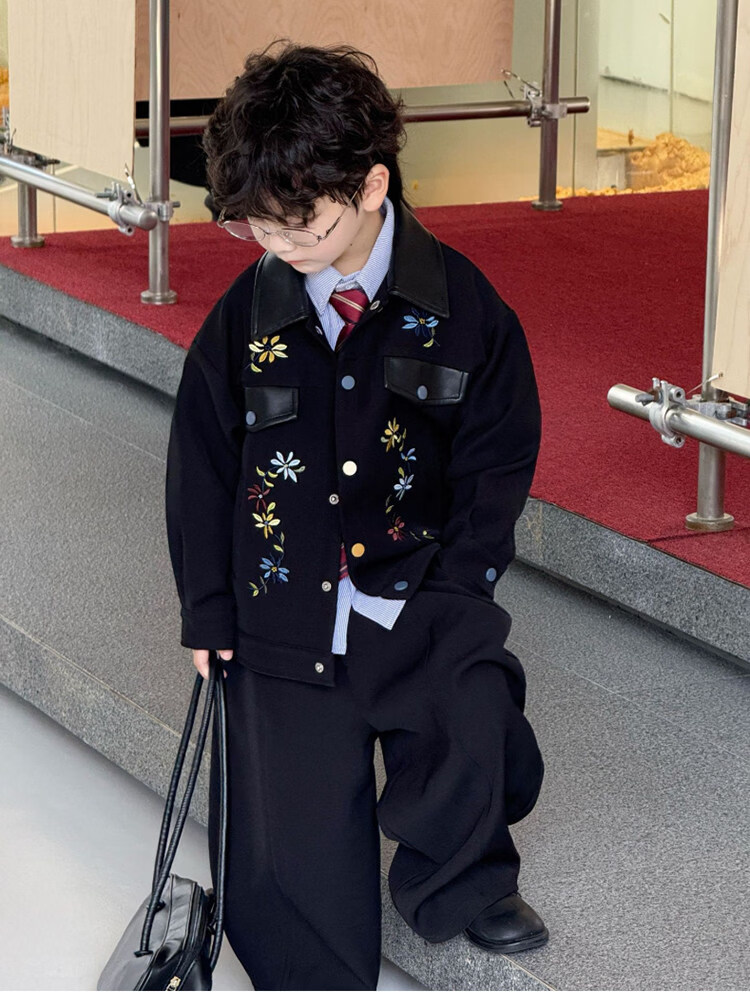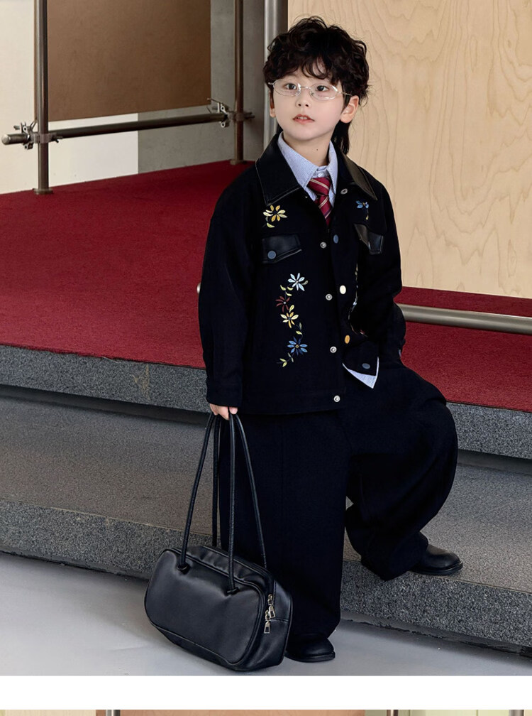 Pi Shuai Children's Jacket 2025 New National Style New Chinese Suit Boys Fashionable Trendy Autumn and Winter Jackets Tops All the Way Flower Jacket + Black Pants + Blue Striped Shirt cm Recommended Weight 5365 Jin Jin is equal to 0.5 kg 140