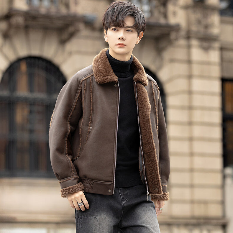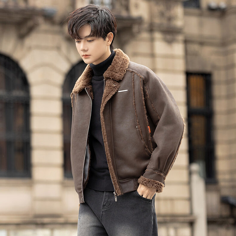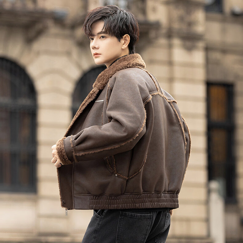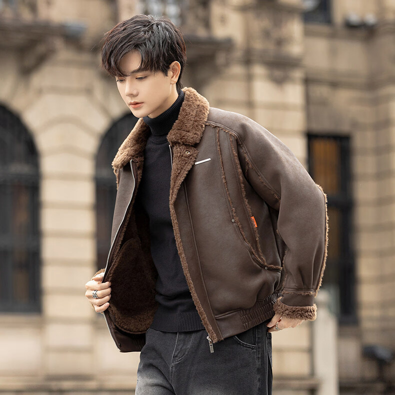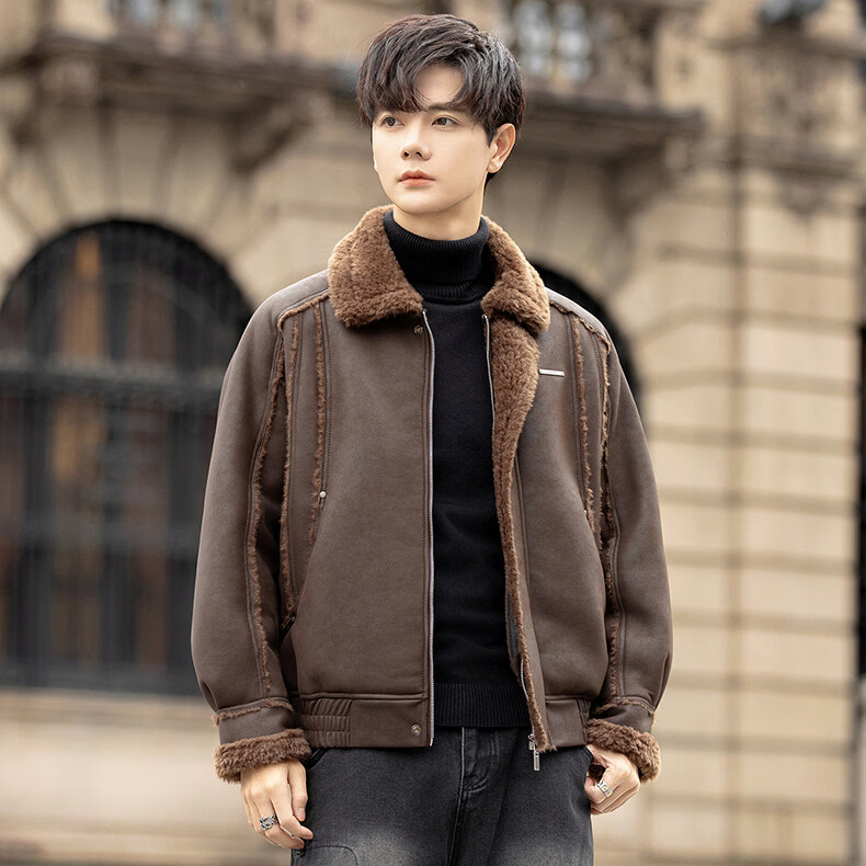 GENIUS国际一线品牌皮毛一体外套男冬季潮牌羊羔毛夹克加绒加厚羊羔绒棉 咖啡色 M