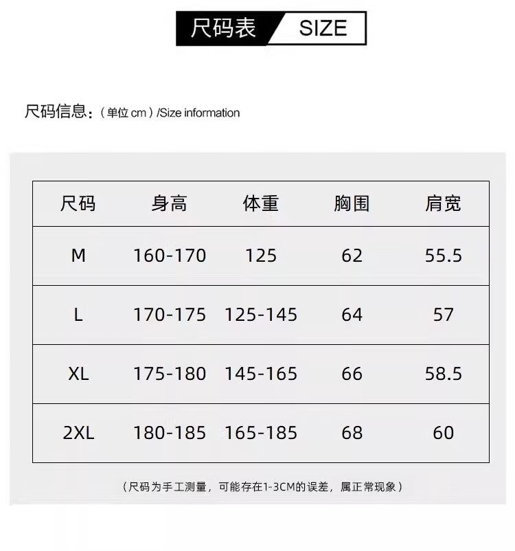 China (cm) 165 / 88-90 170 / 96-98 175 / 108-110 180 / 118-122 185 / 126-130