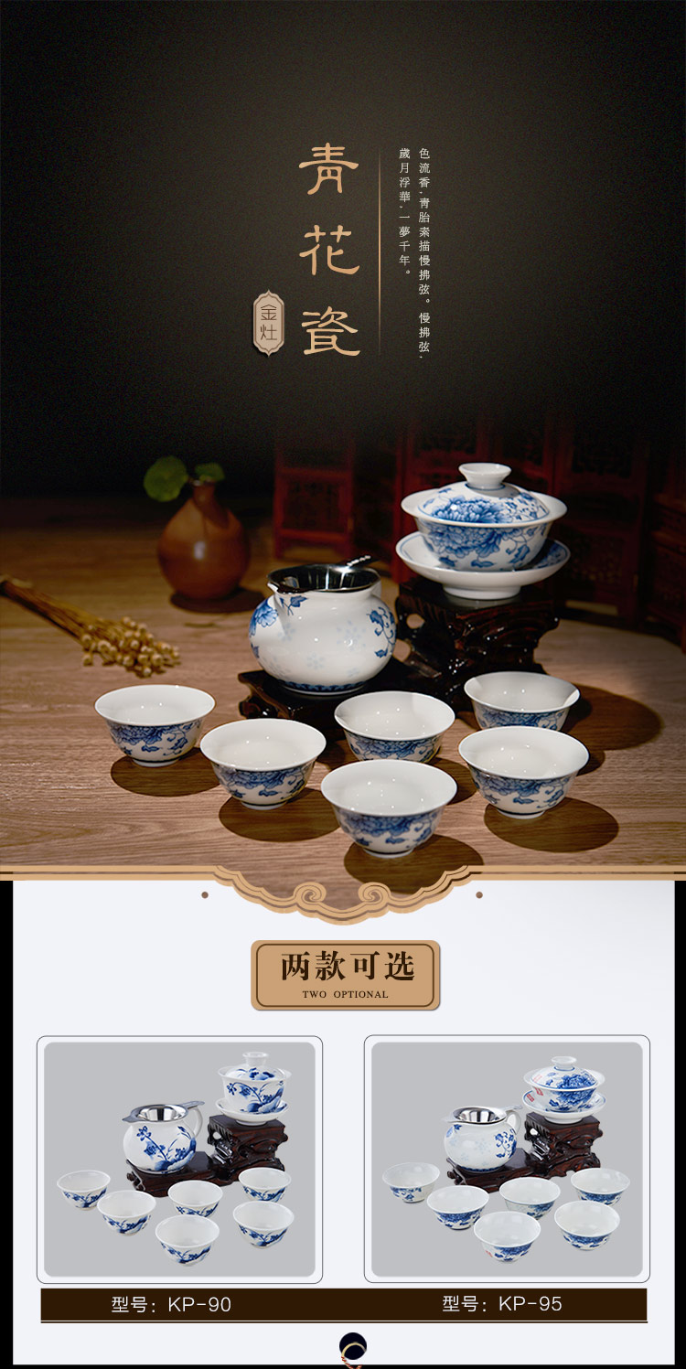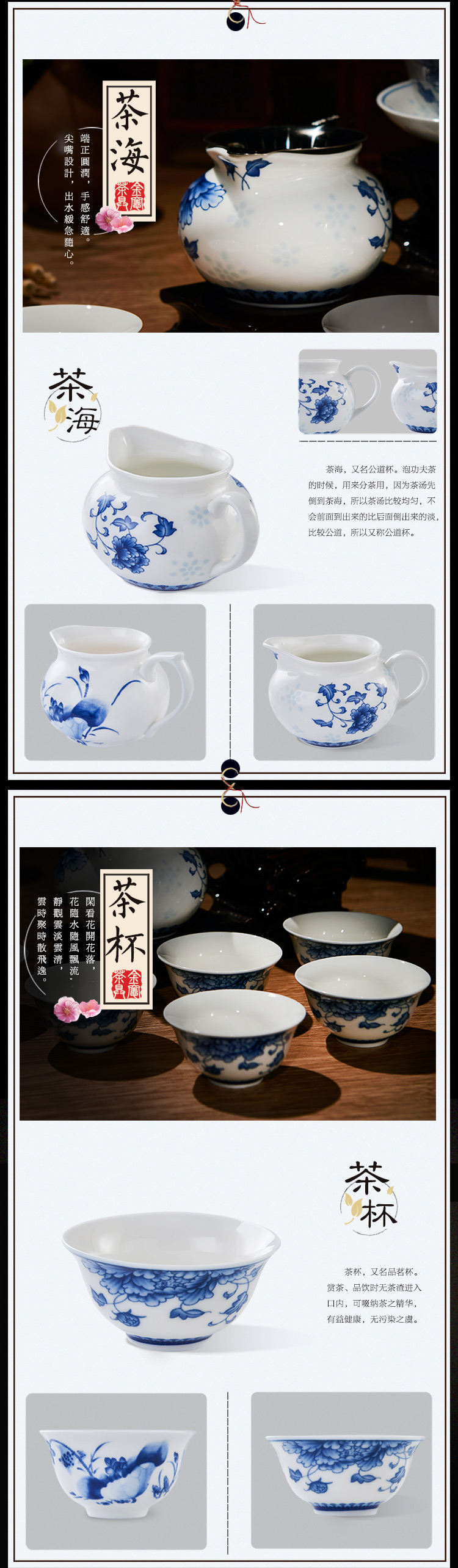 KAMJOVE blue and white porcelain Kung Fu tea set, tea cup, teapot, Sancai bowl tea set KP-95 exquisite peony style