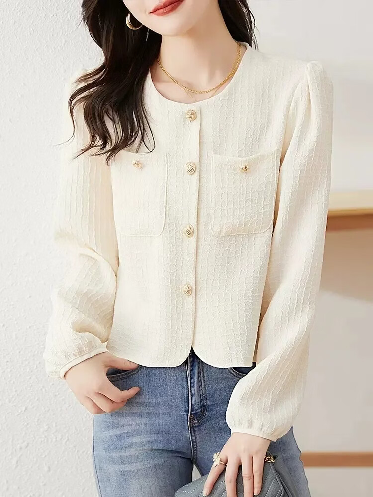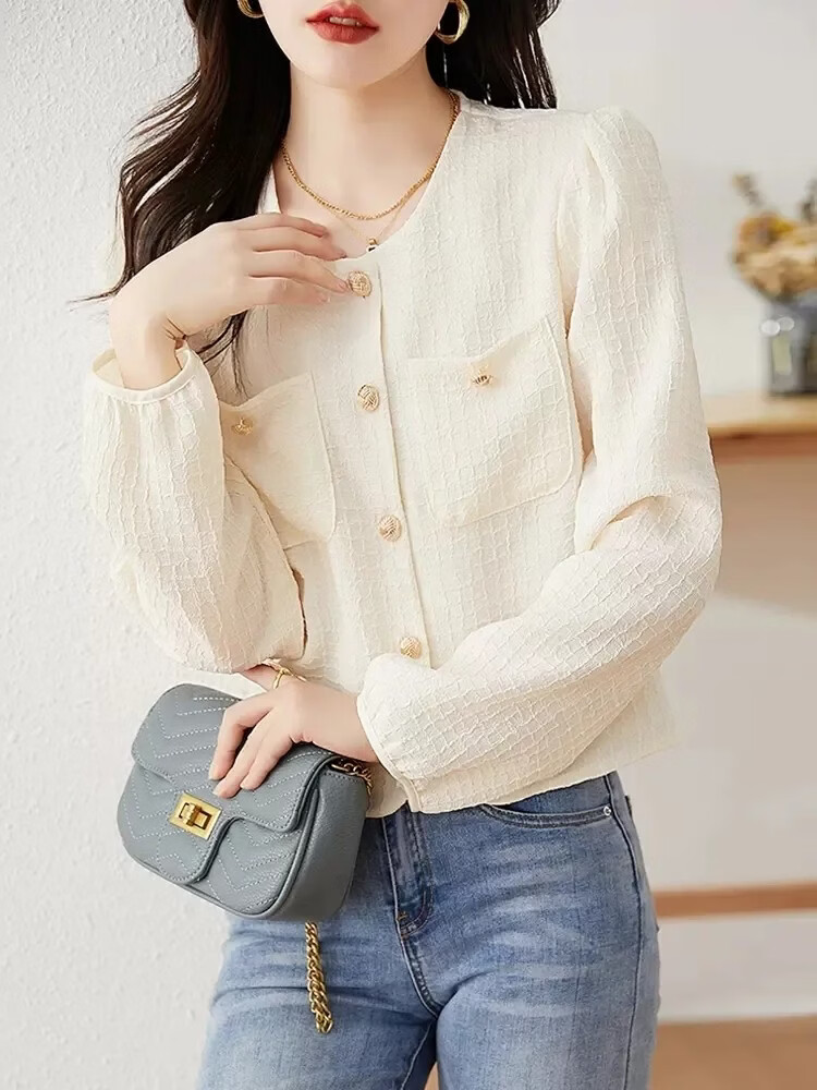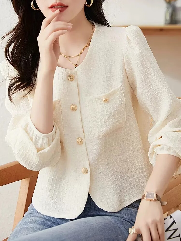 Woodpecker Autumn and Winter Fashionable Versatile Long Sleeve Shirt Women's Solid Color New Small Short Puff Sleeve Top Shirt Apricot-Version S