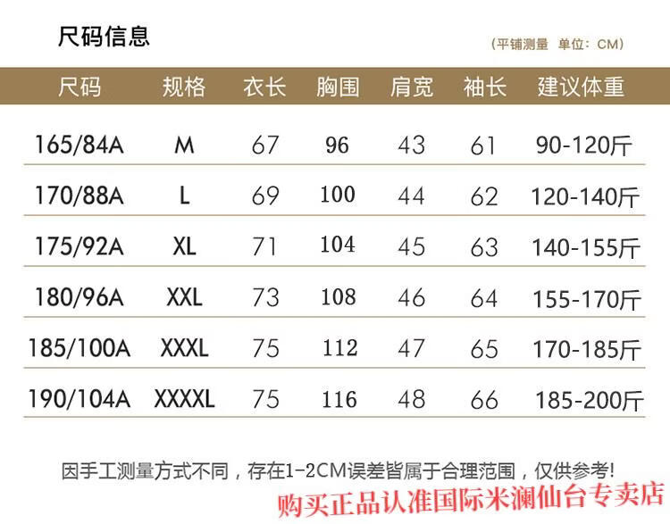 China (cm) 165 / 88-90 170 / 96-98 175 / 108-110 180 / 118-122 185 / 126-130