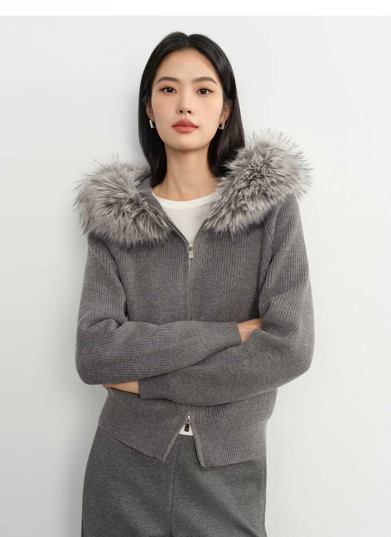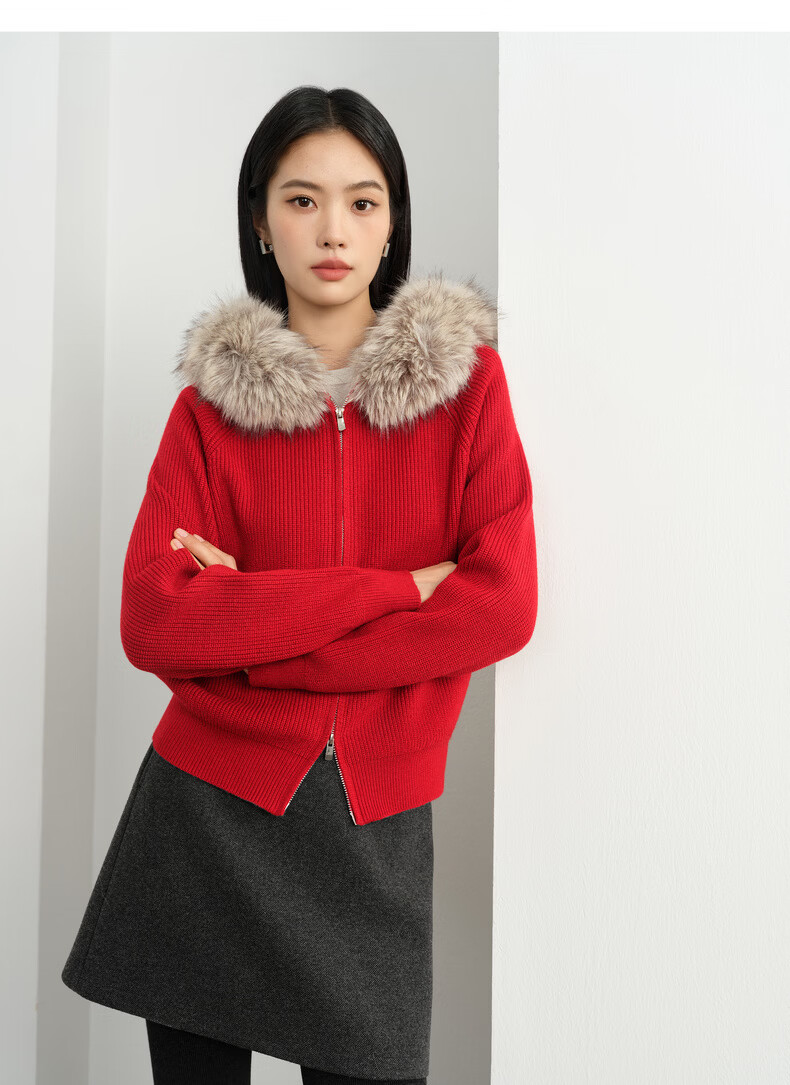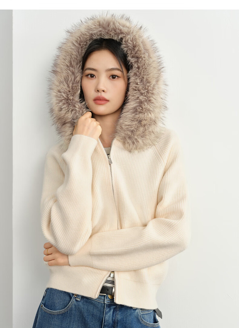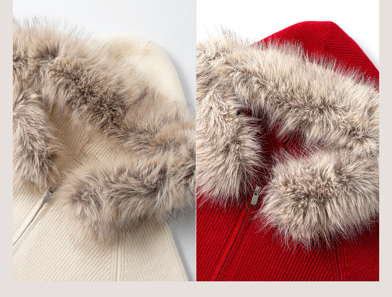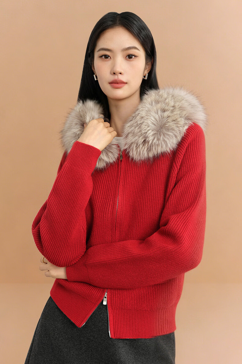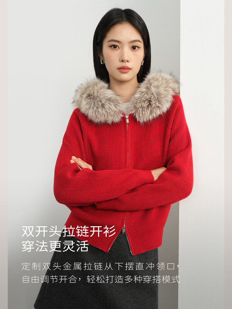 Eveli (eifini) Eveli fashionable detachable fur collar hooded knitted cardigan for women 2026 spring to continue the warmth and versatile sweater for women red M 105-115Jin Jin is equal to 0.5 kg