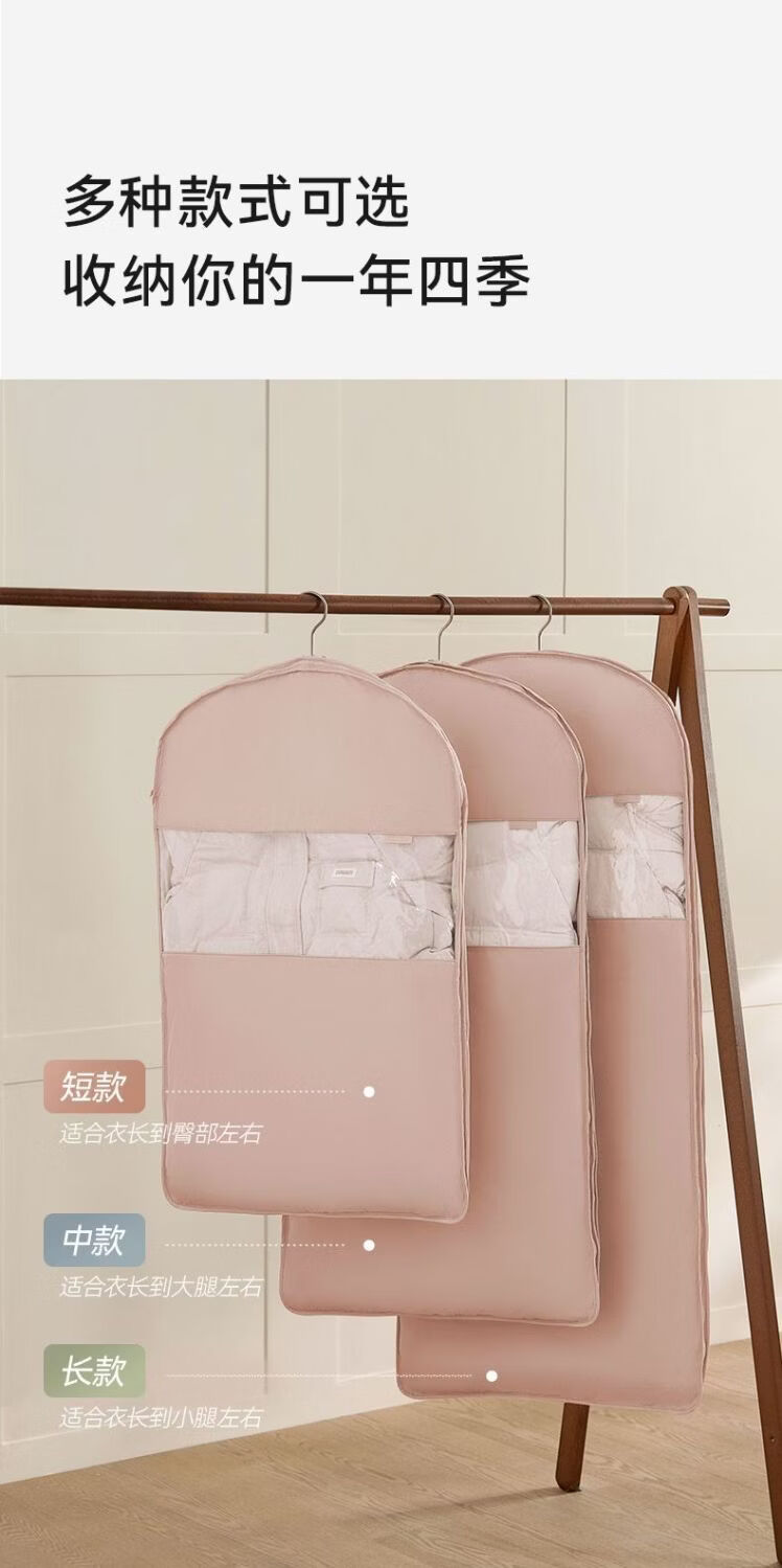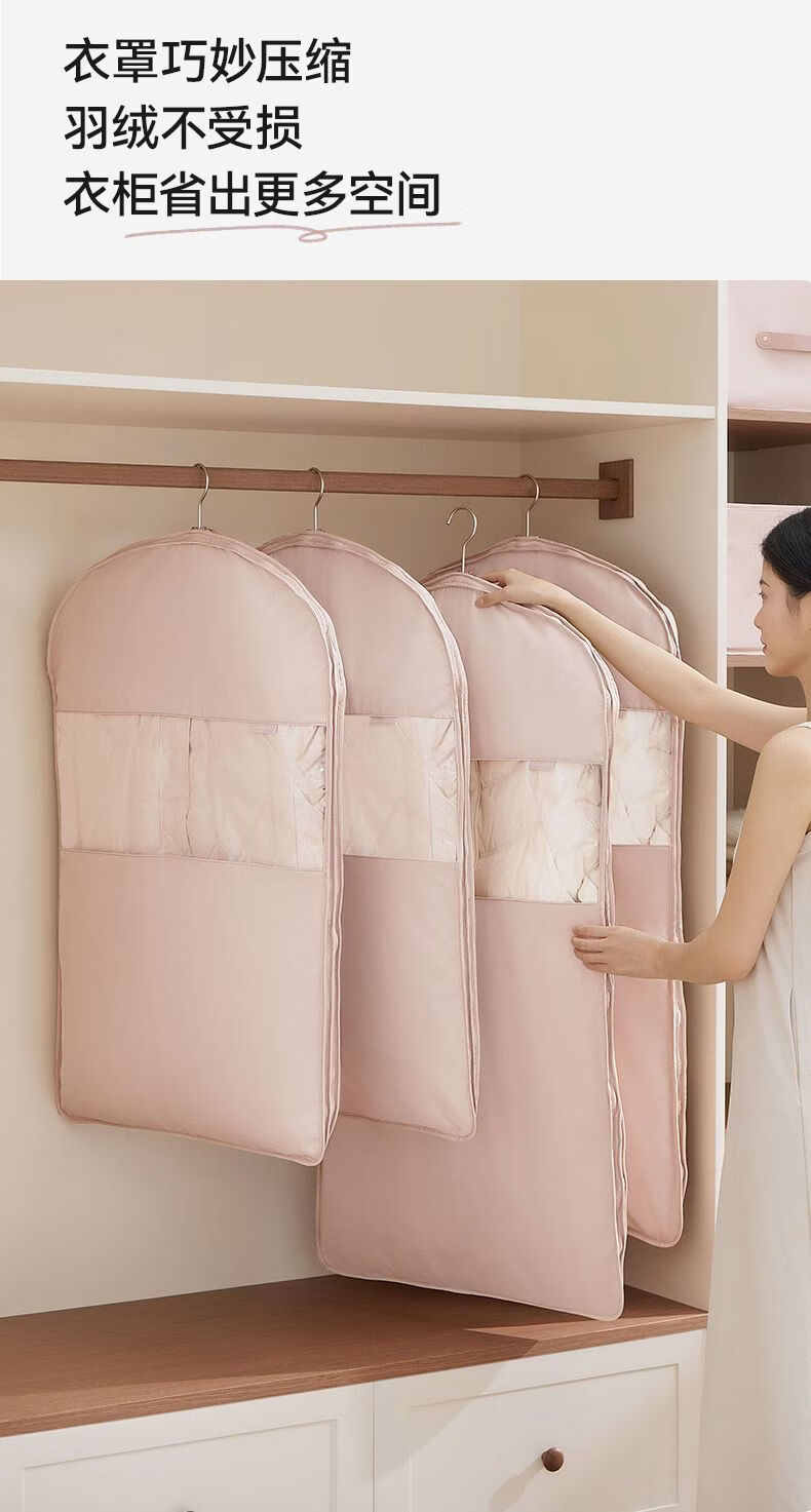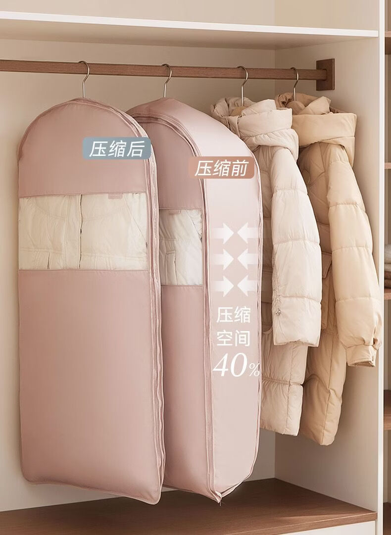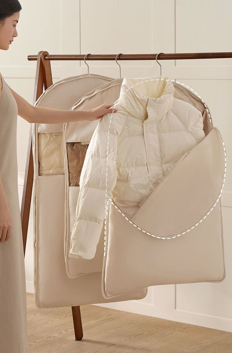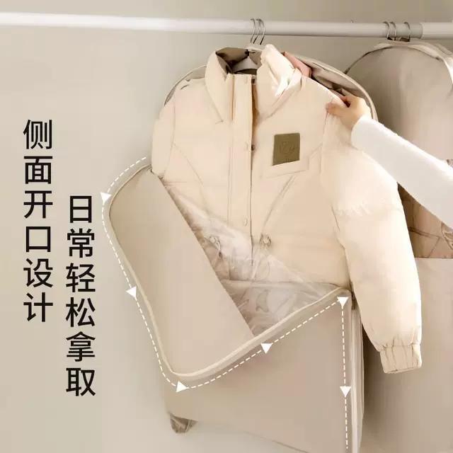 OIMG Japanese down jacket storage bag compressible clothes coat hanging dust cover home wardrobe transparent hanging clothes bag pearl beige short style - suitable for clothes within 90cm long