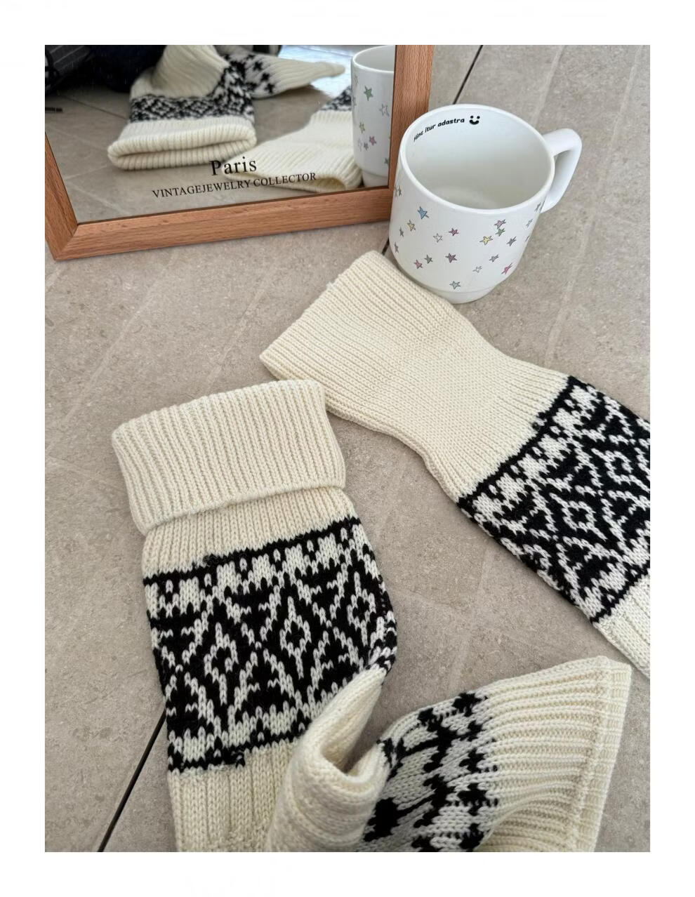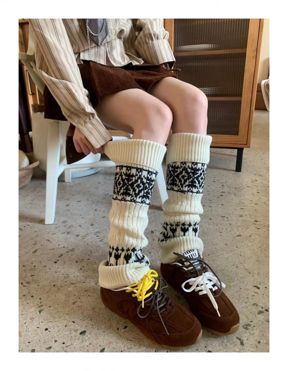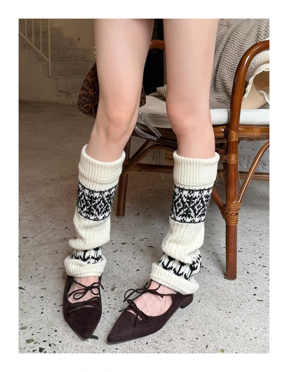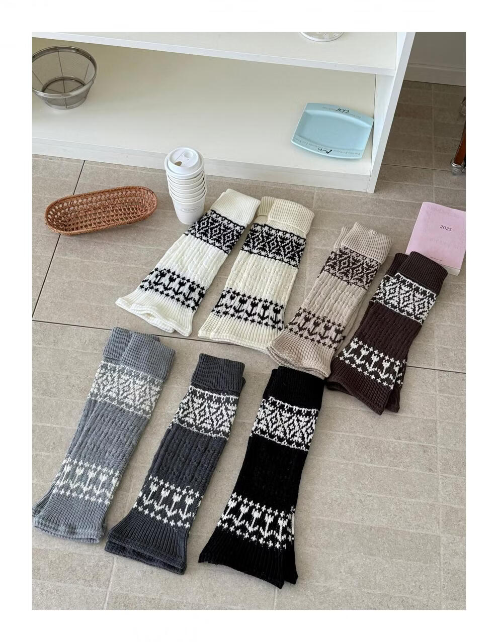 Complete antique white Fair Isle wool socks for women, thickened and warm cuffed socks, autumn and winter knitted knee pads and leg covers, off-white one piece