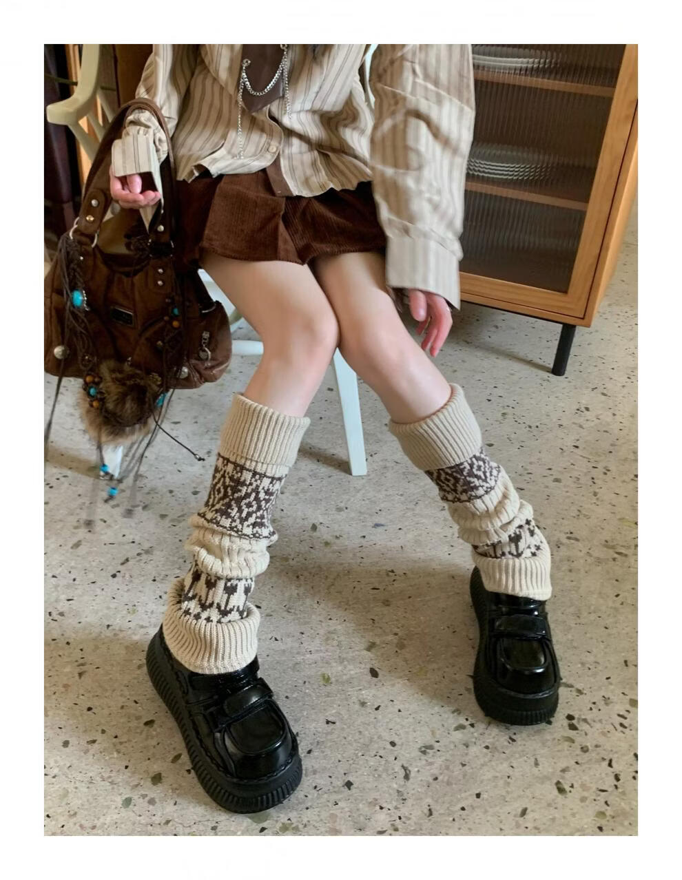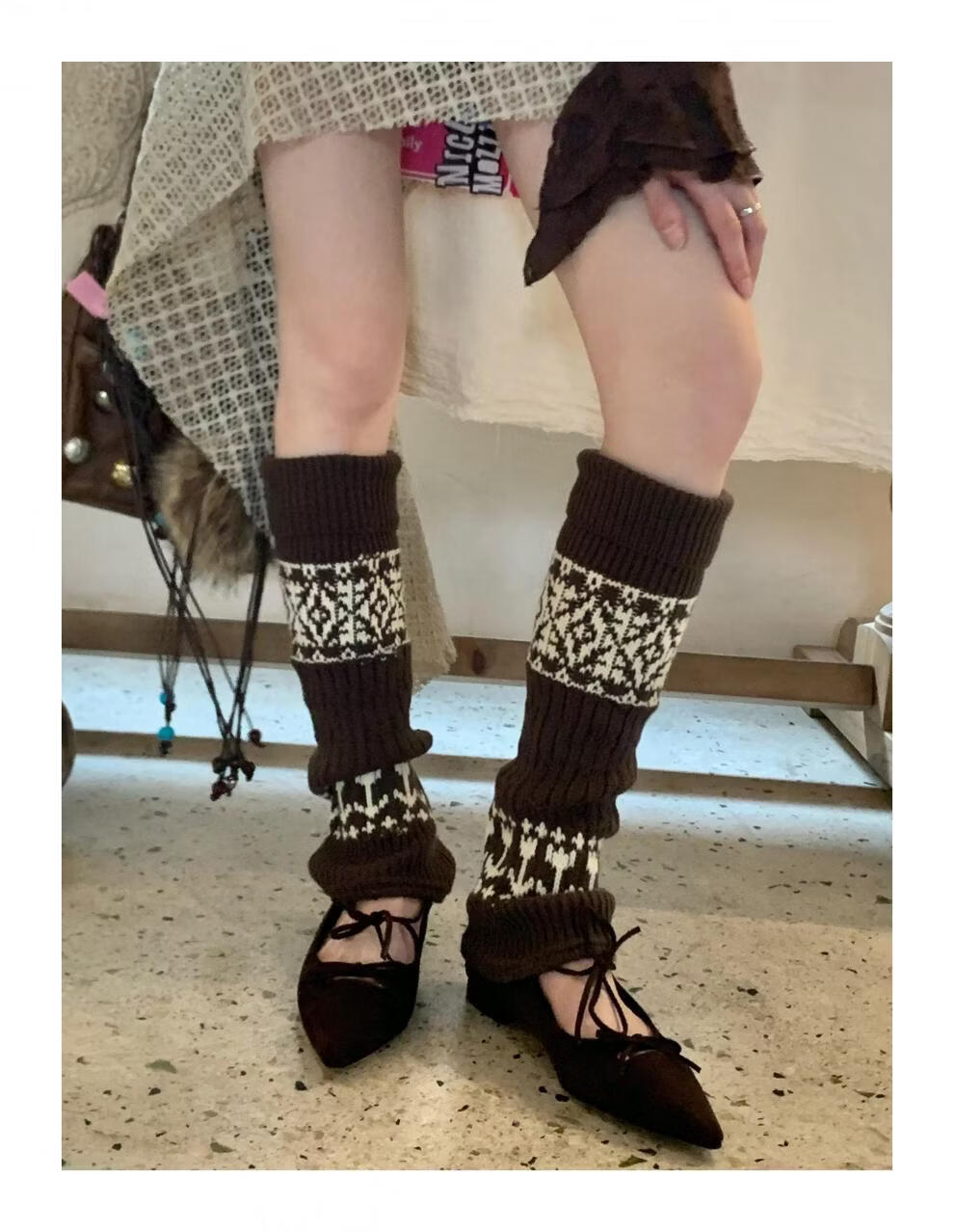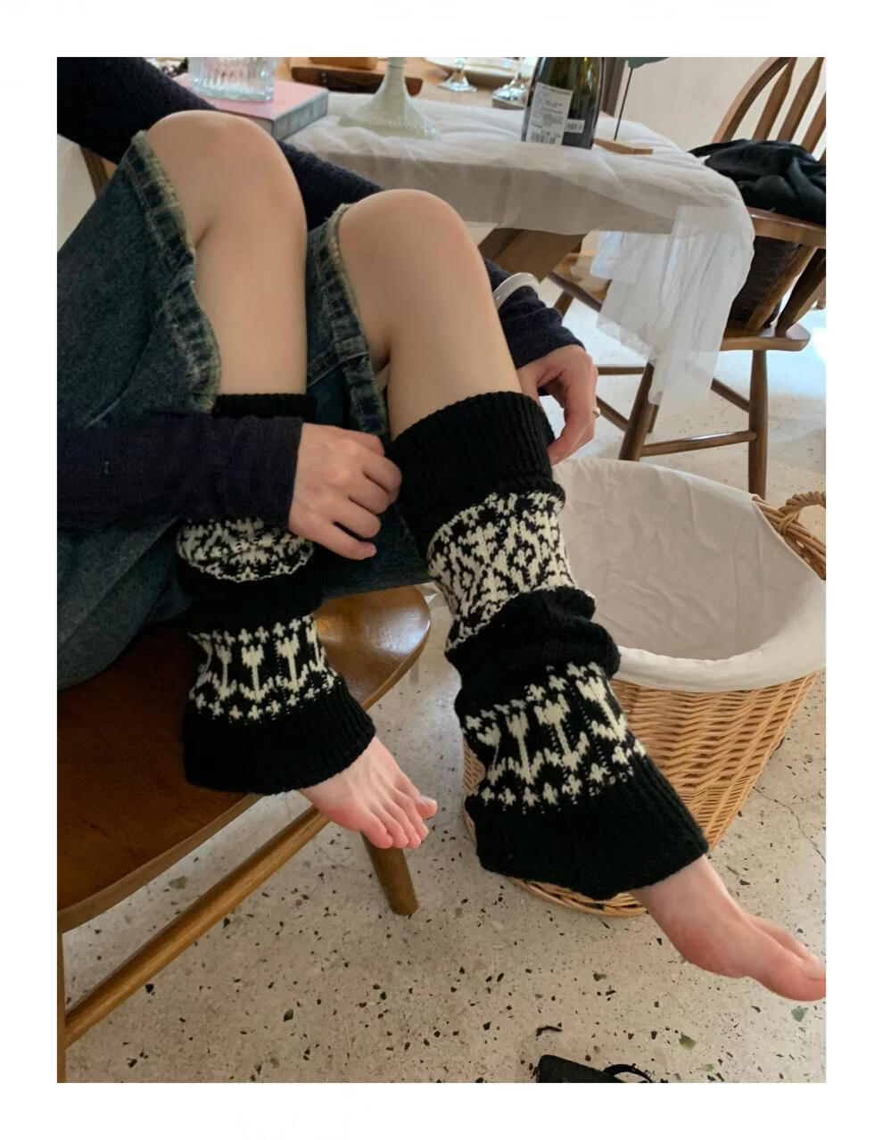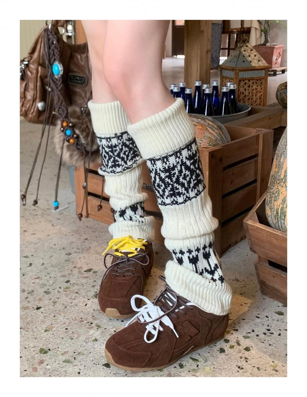 Complete antique white Fair Isle wool socks for women, thickened and warm cuffed socks, autumn and winter knitted knee pads and leg covers, off-white one piece