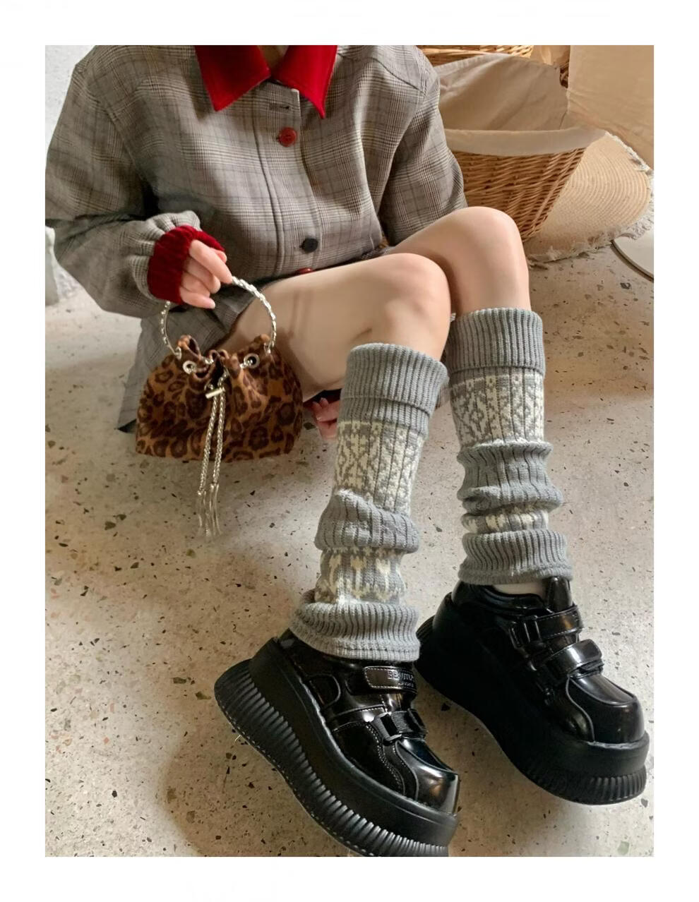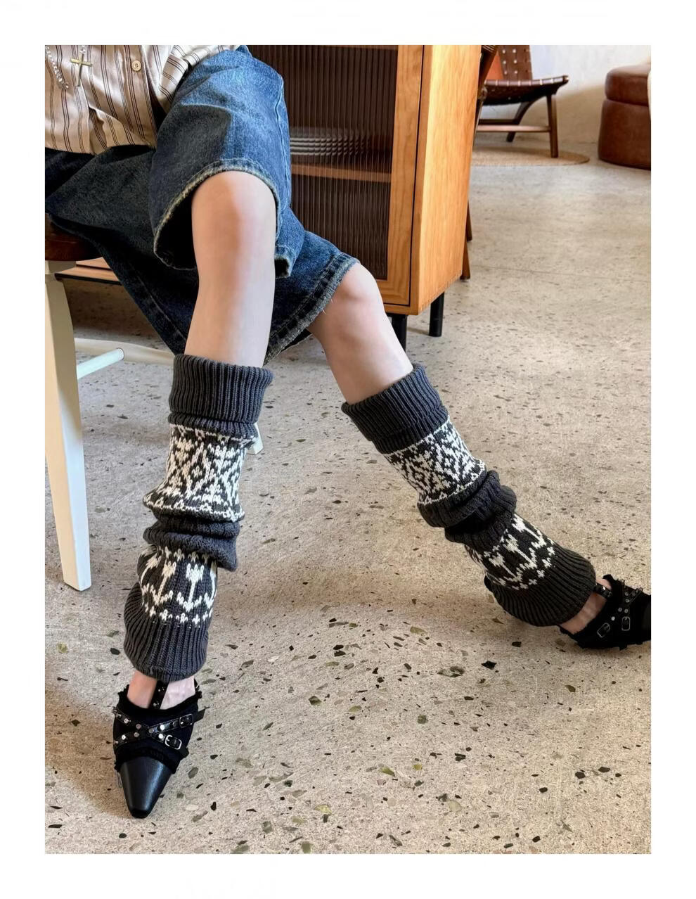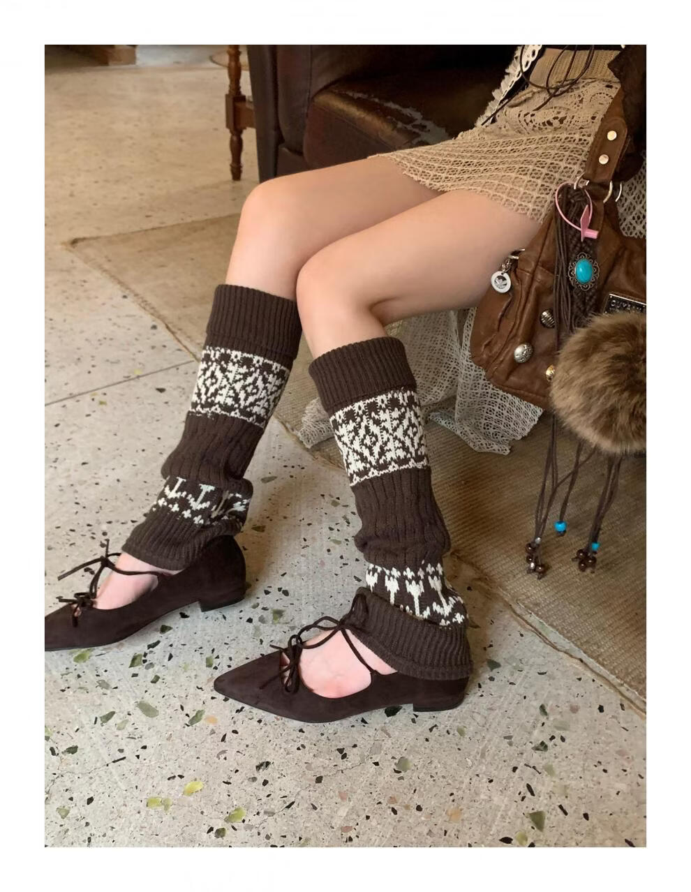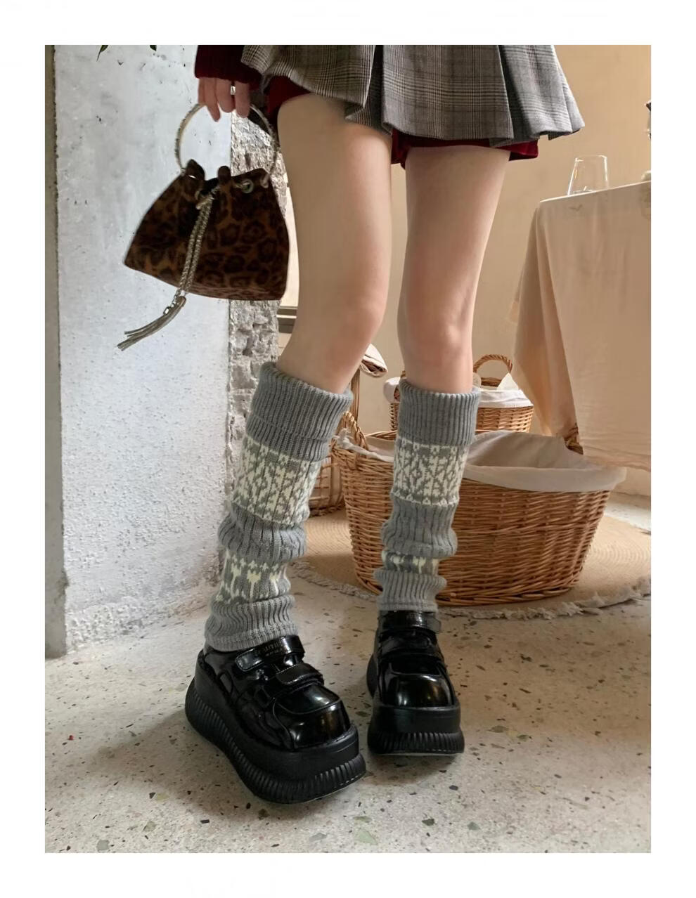 Complete antique white Fair Isle wool socks for women, thickened and warm cuffed socks, autumn and winter knitted knee pads and leg covers, off-white one piece