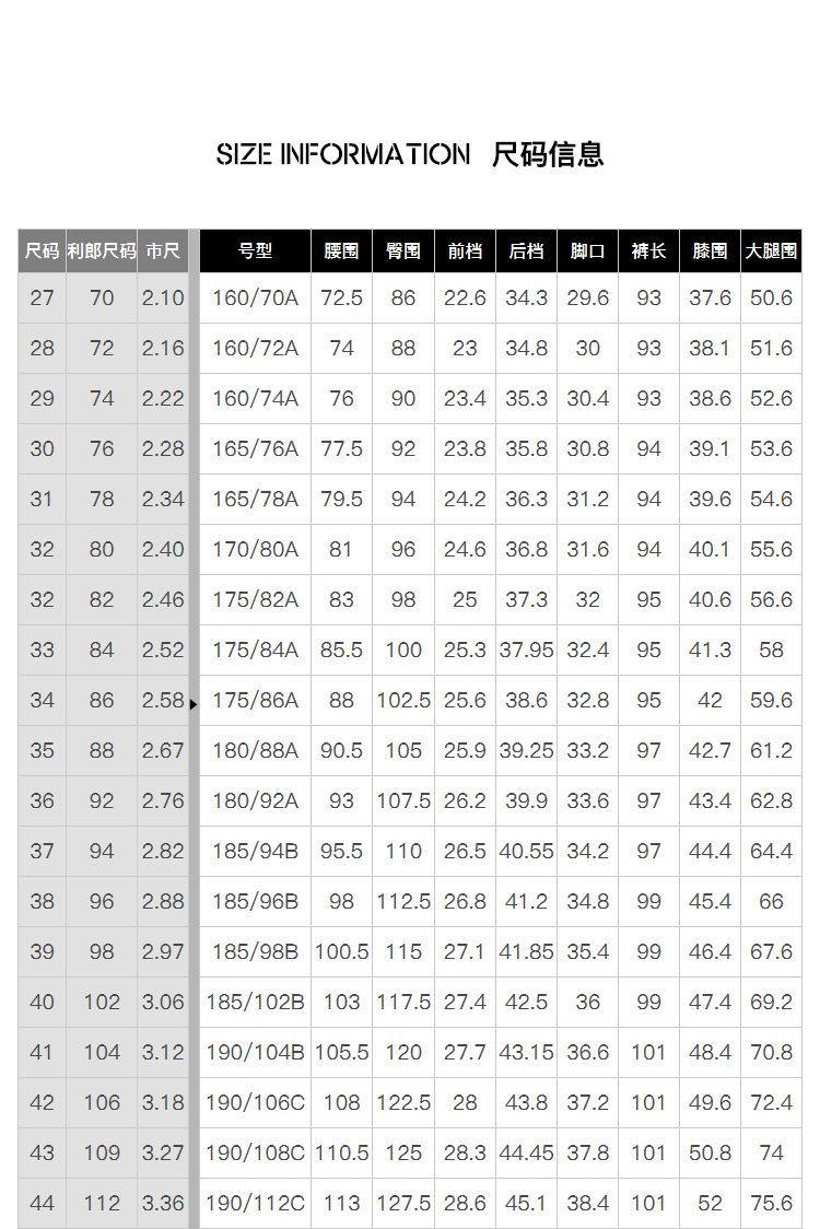 China (cm) 160-165/84-86 165-170 / 88-90 167-172 / 92-96 168-173 / 98-102 170-176 / 106-110