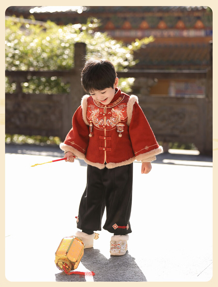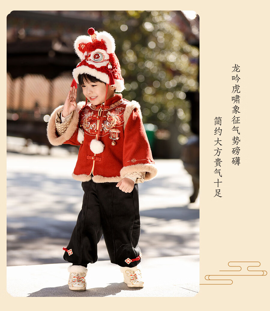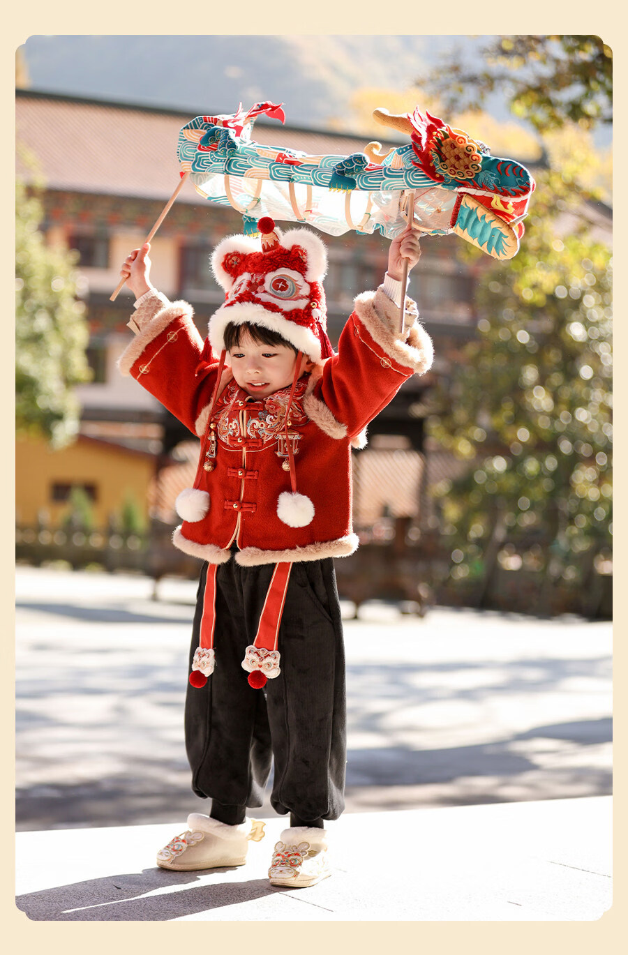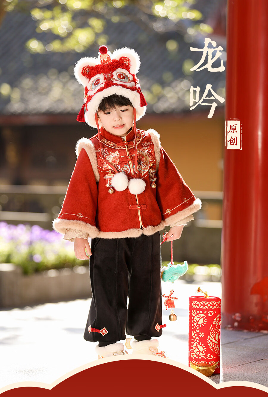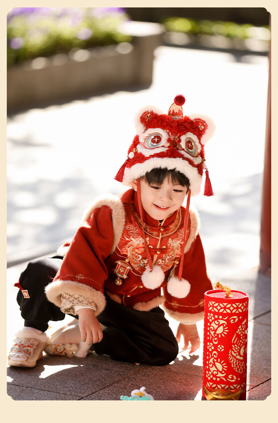 Disney Chinese style children's Tang suit winter suit thickened lion dance hat red embroidered New Year's greeting suit baby velvet outer suit boy lion awakening black pants 90 velvet thickened fabric
