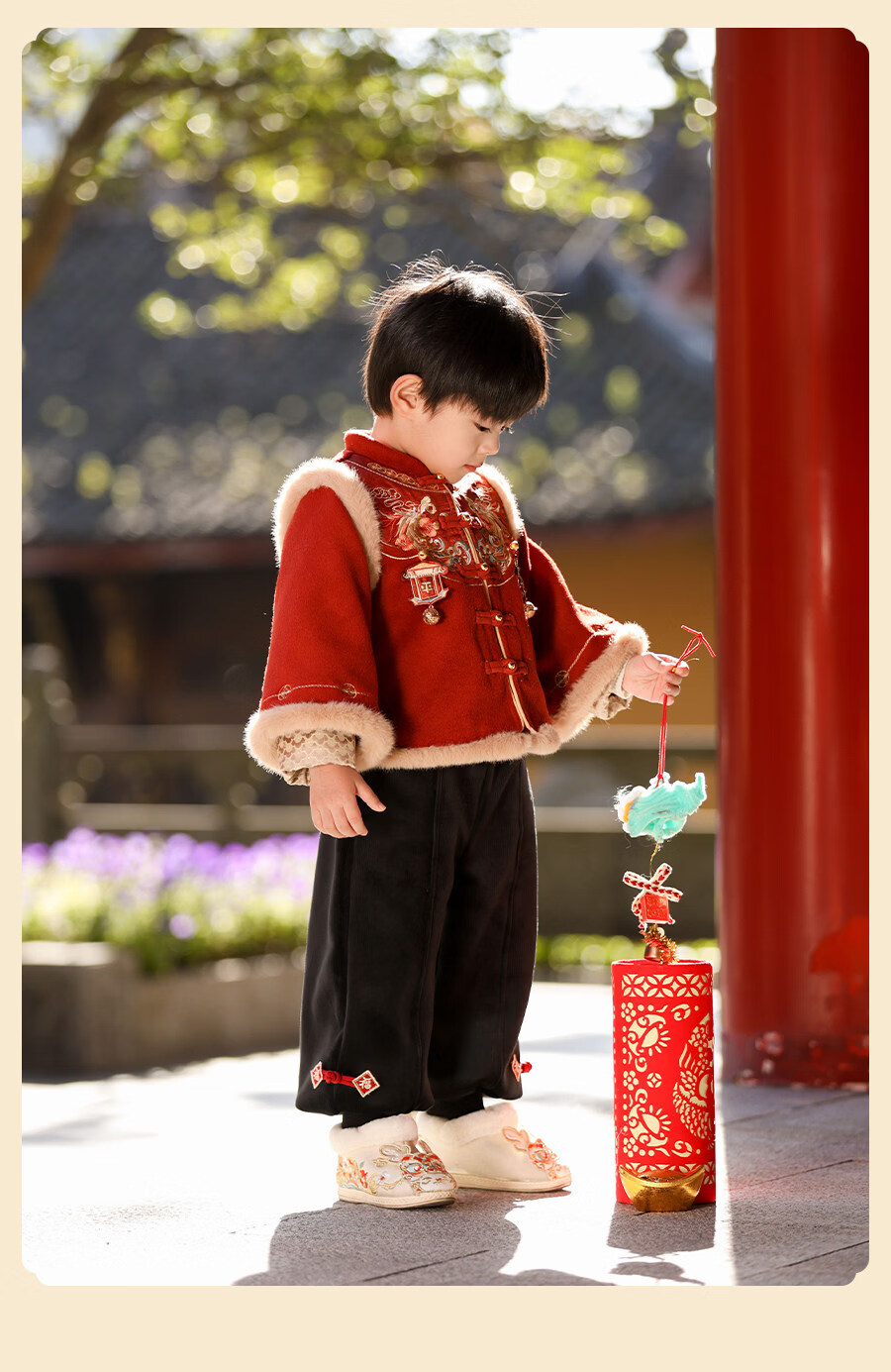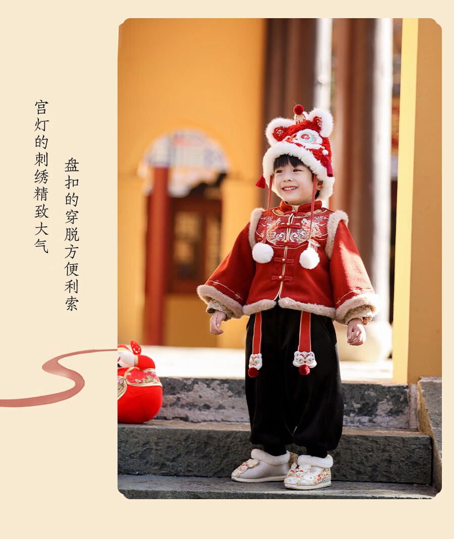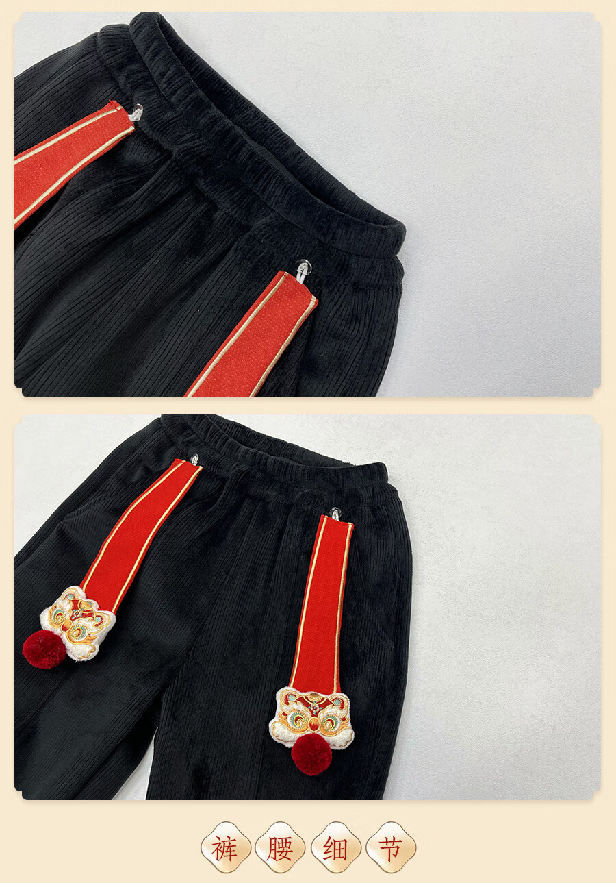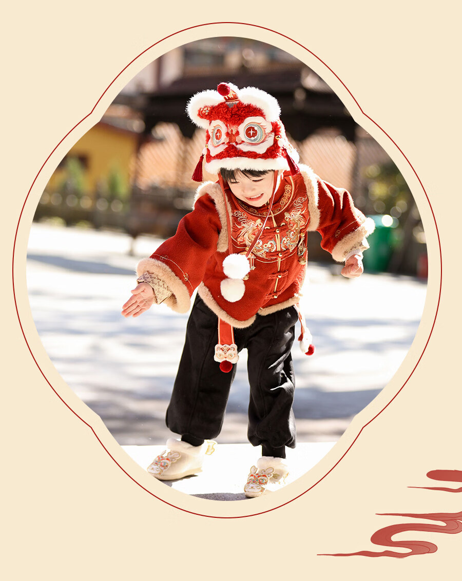 Disney Chinese style children's Tang suit winter suit thickened lion dance hat red embroidered New Year's greeting suit baby velvet outer suit boy lion awakening black pants 90 velvet thickened fabric