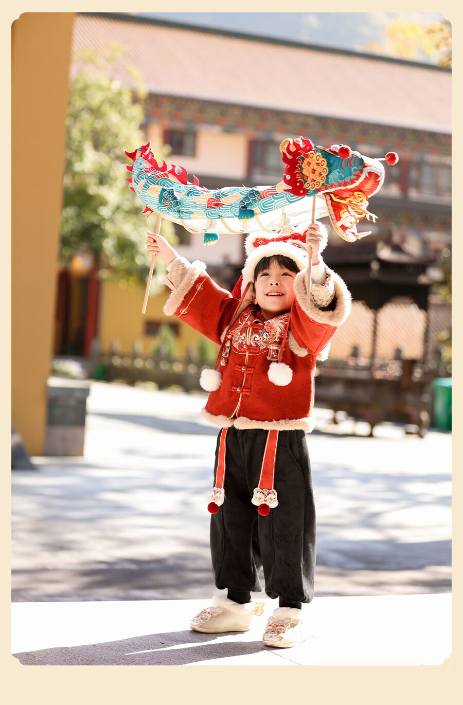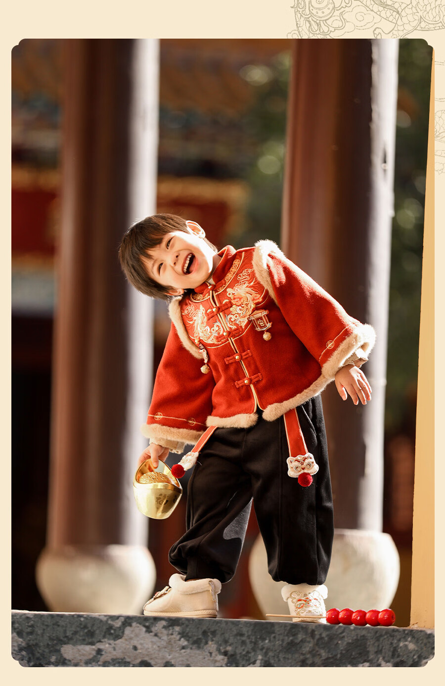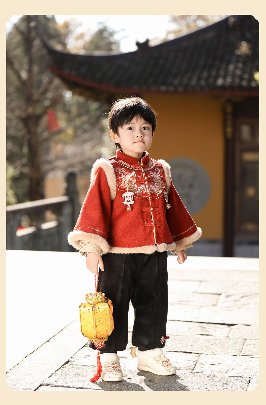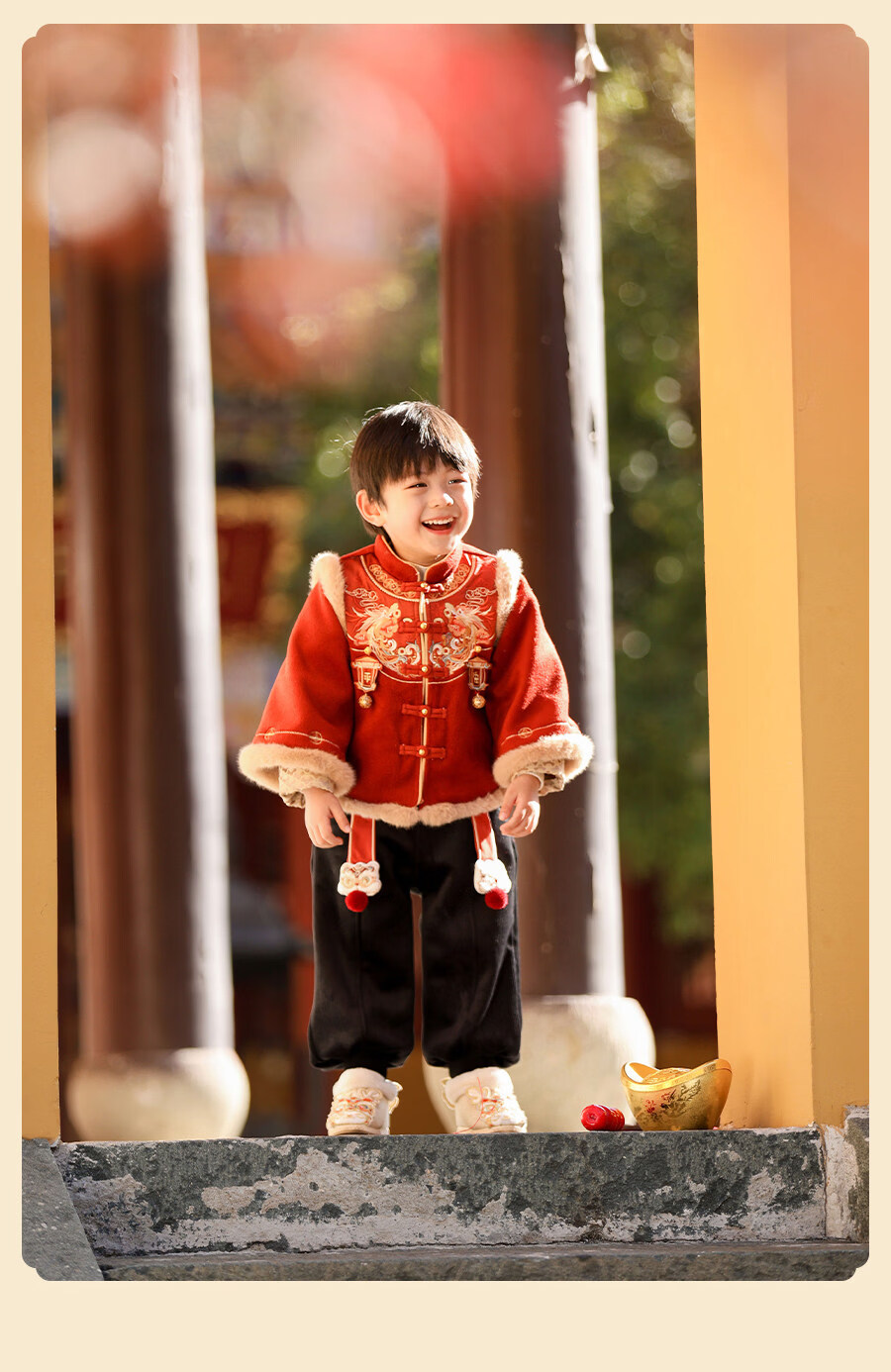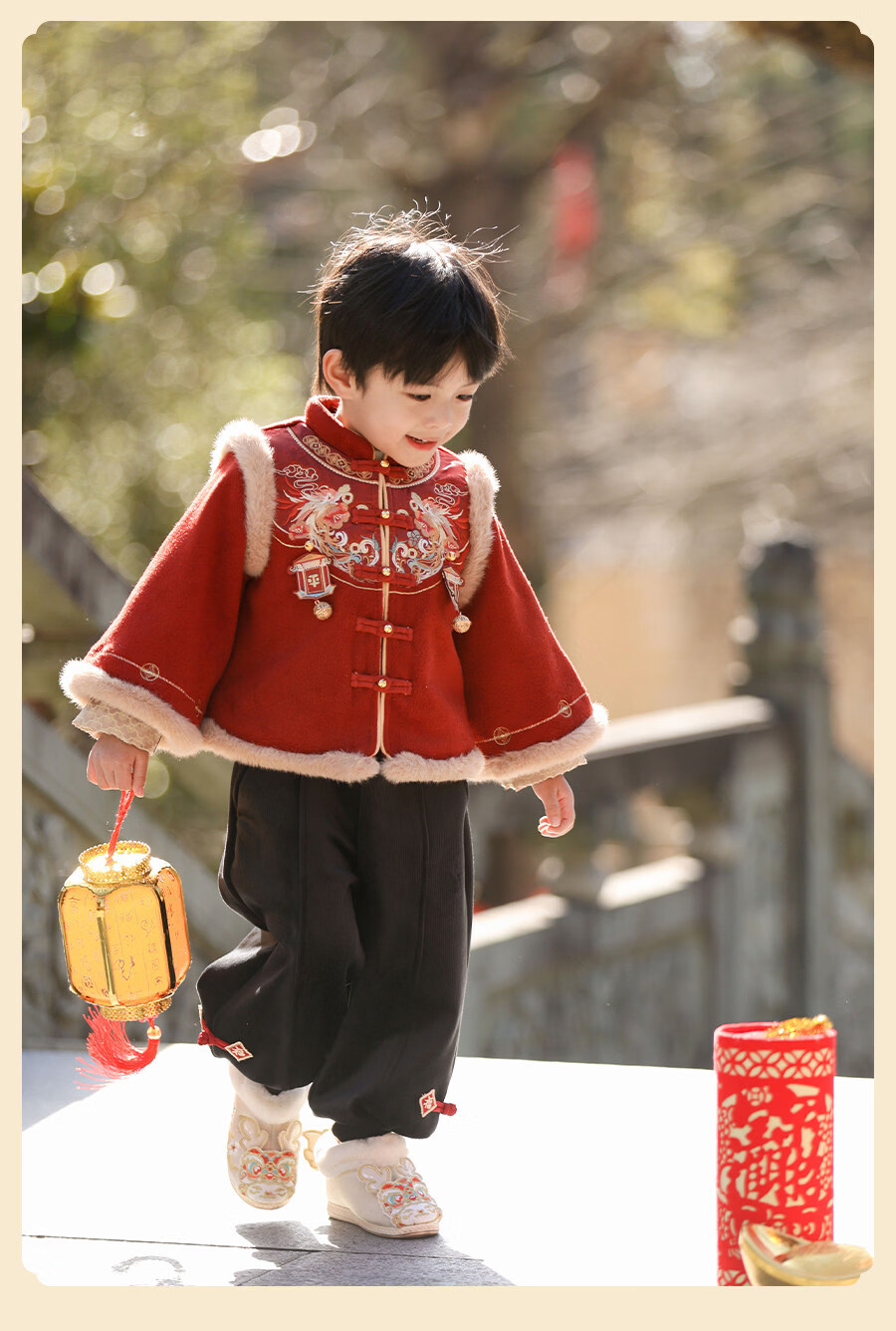 Disney Chinese style children's Tang suit winter suit thickened lion dance hat red embroidered New Year's greeting suit baby velvet outer suit boy lion awakening black pants 90 velvet thickened fabric