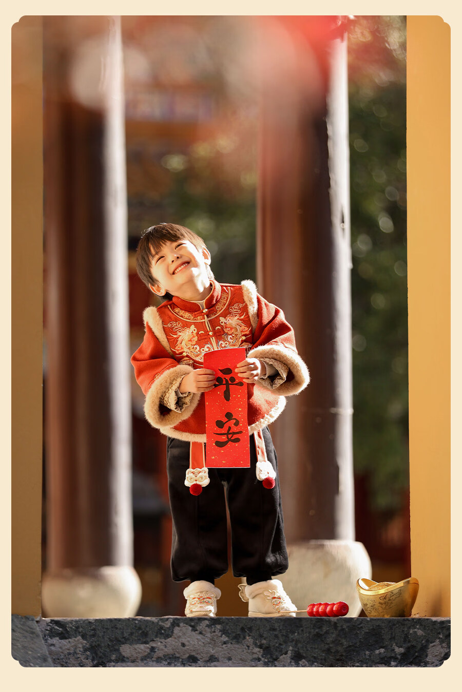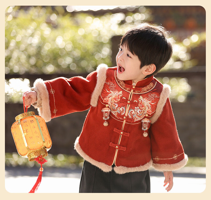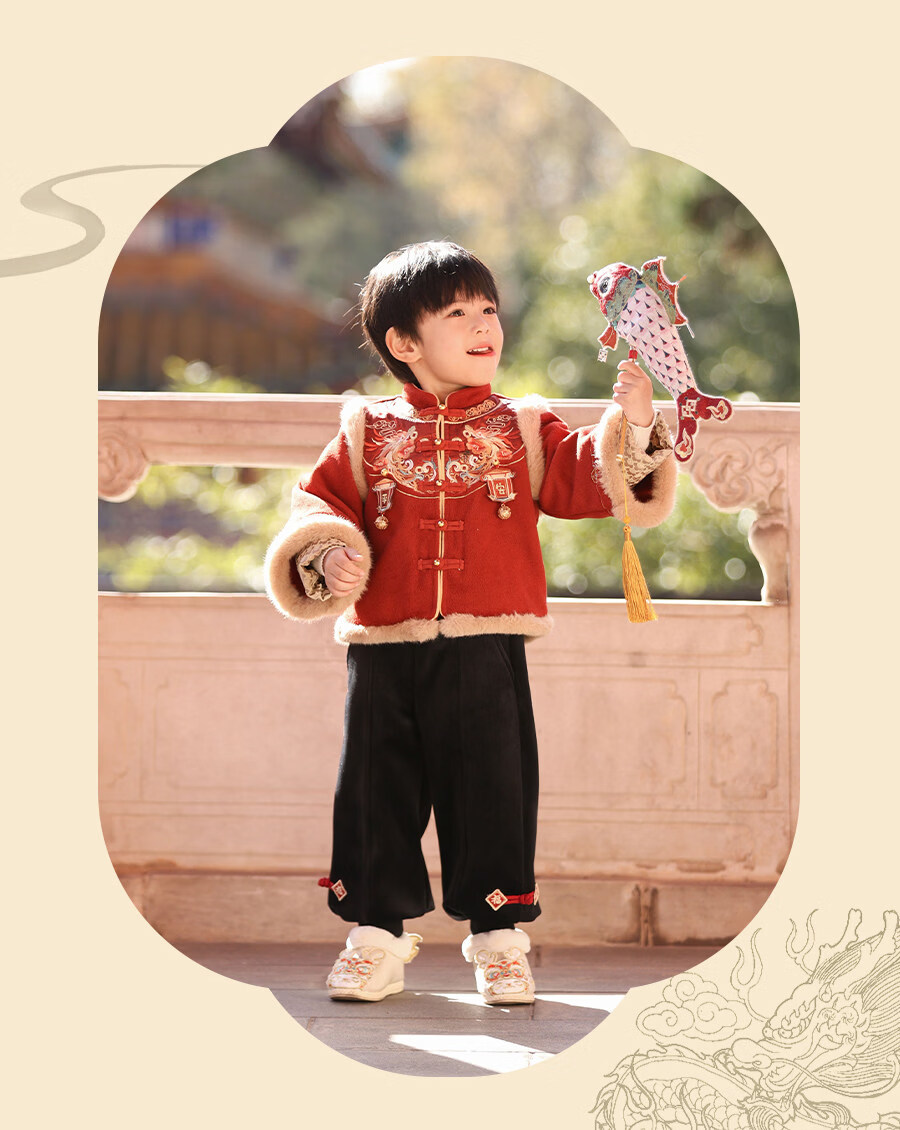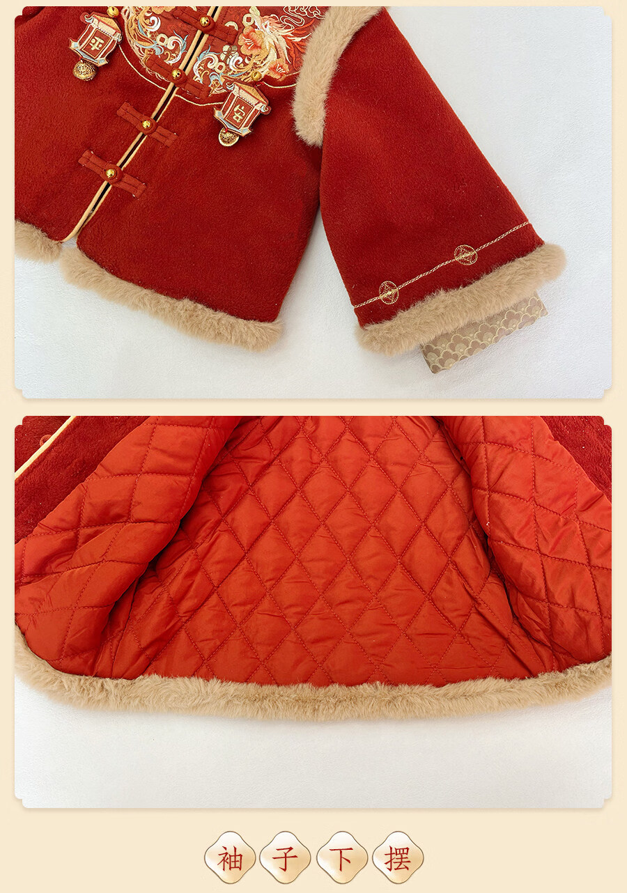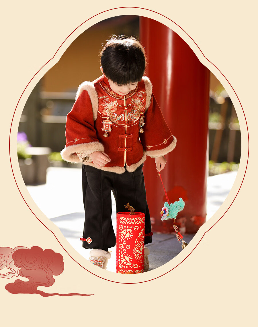 Disney Chinese style children's Tang suit winter suit thickened lion dance hat red embroidered New Year's greeting suit baby velvet outer suit boy lion awakening black pants 90 velvet thickened fabric
