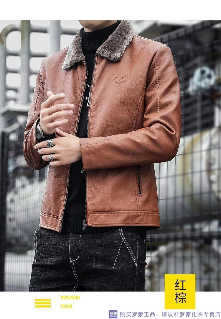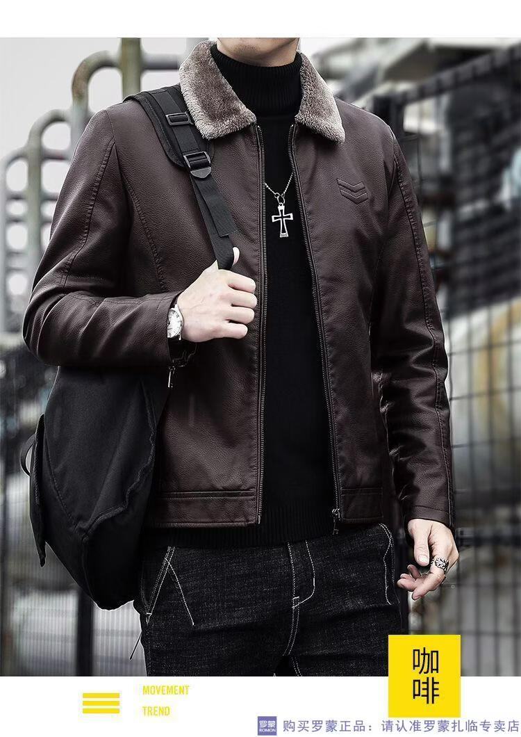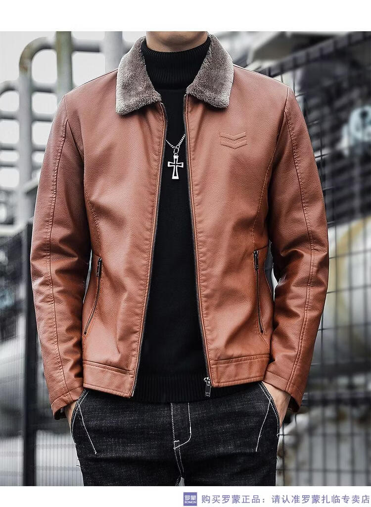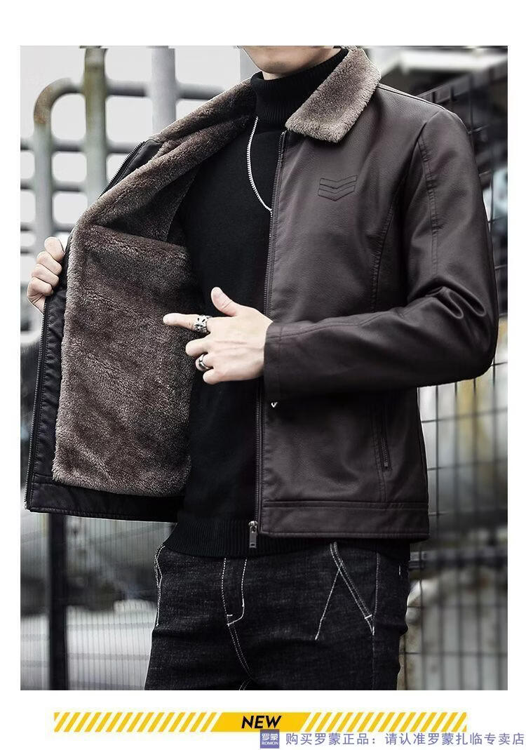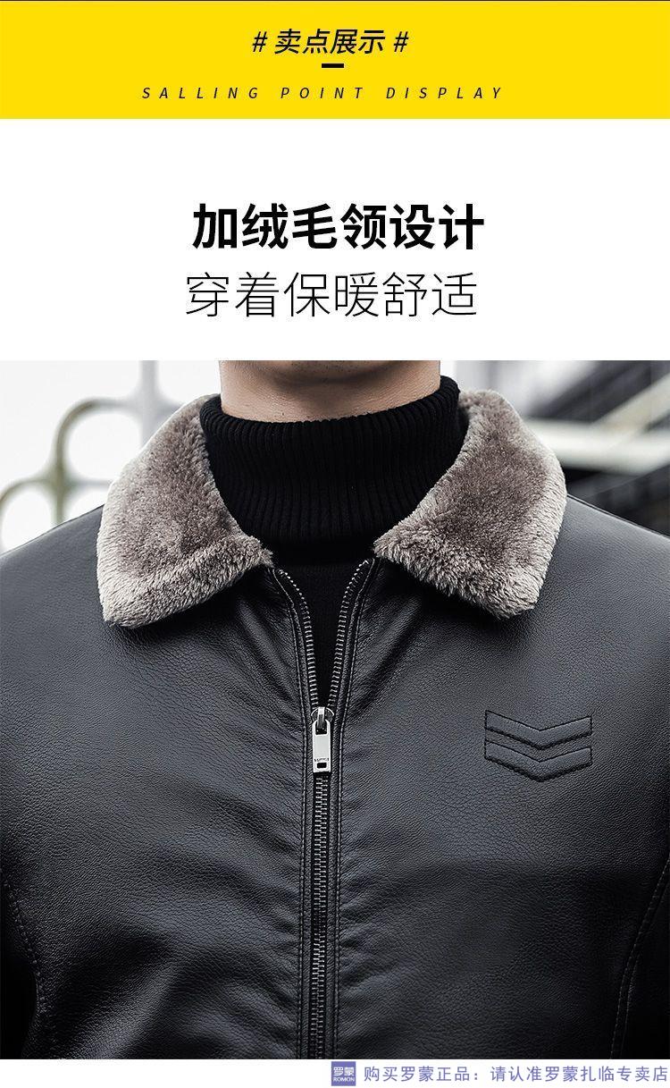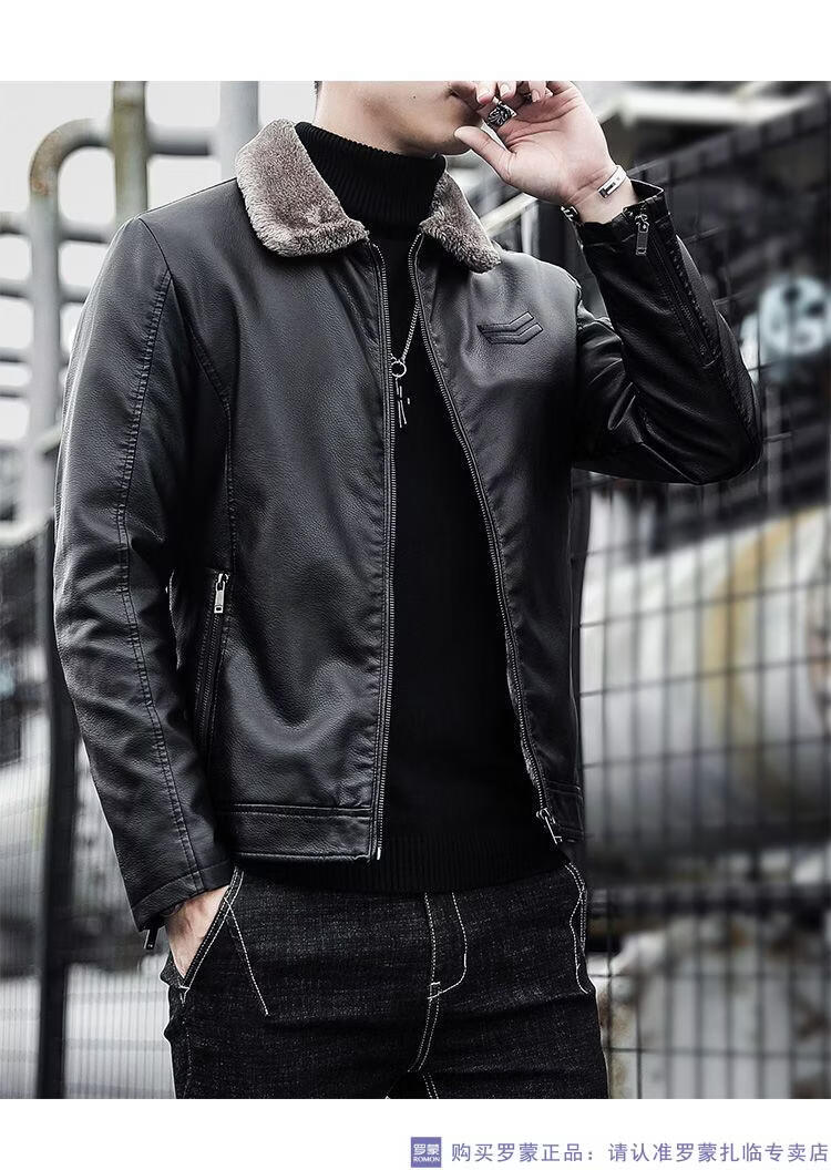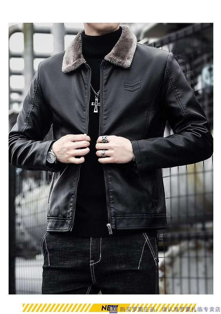 ROMON autumn and winter men's leather jacket new style lapel leather jacket trendy slim motorcycle casual Korean style plush leather jacket black plush plus thick style M recommended 90-110Jin Jin equals 0.5 kg