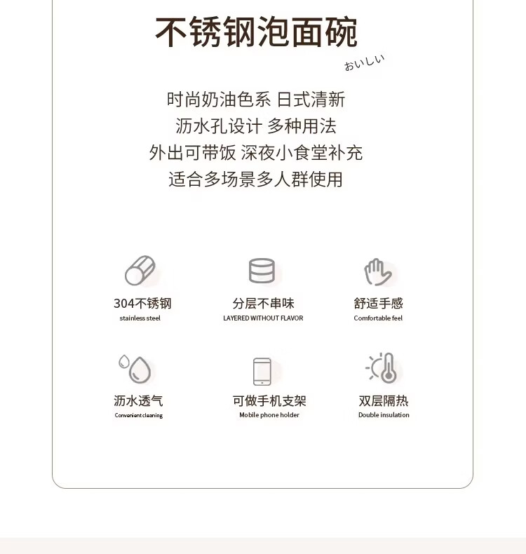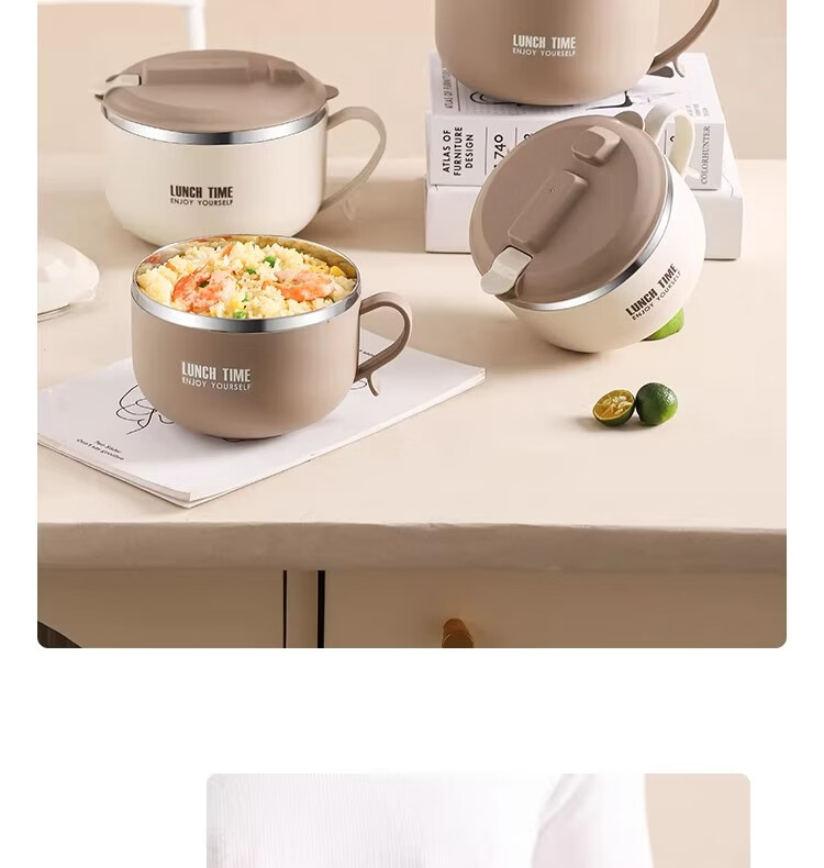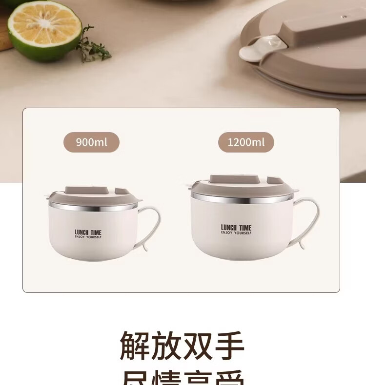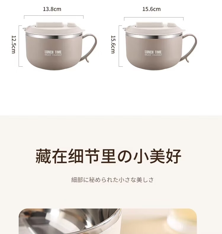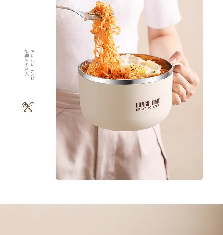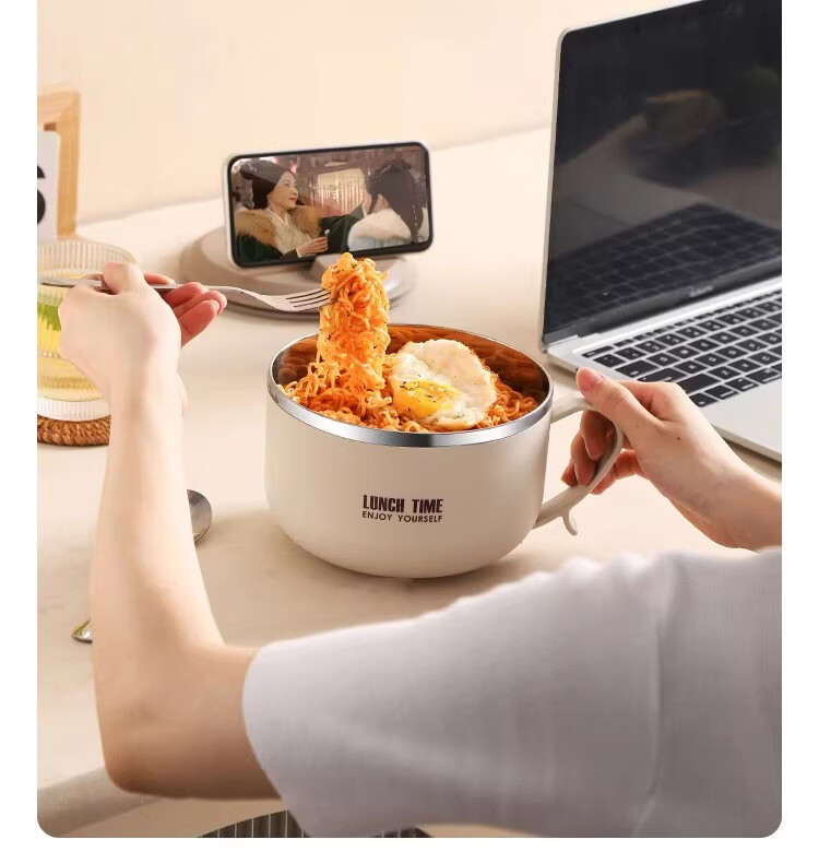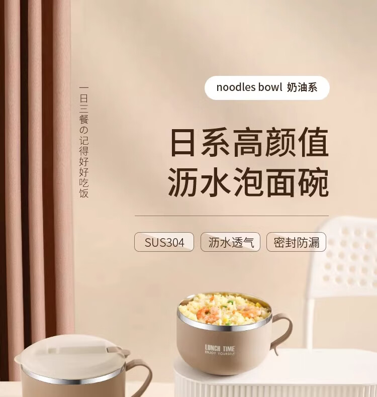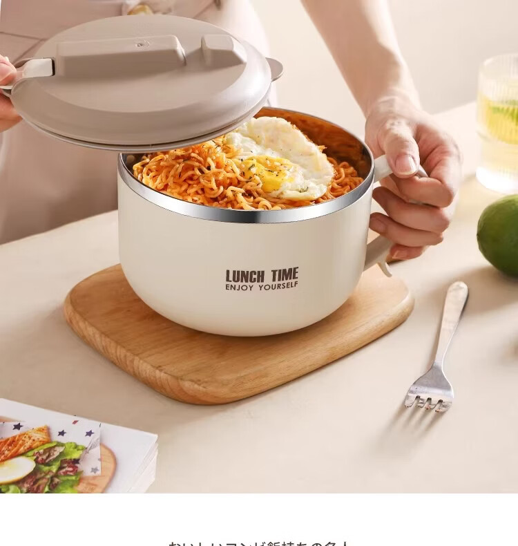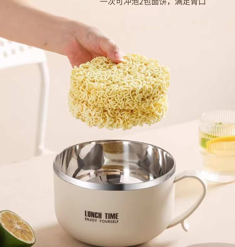 Hanxiao 304 stainless steel instant noodle bowl with lid for office workers and student dormitories for home use instant noodles drained heat insulation anti-scalding small drained instant noodles cup (off-white)