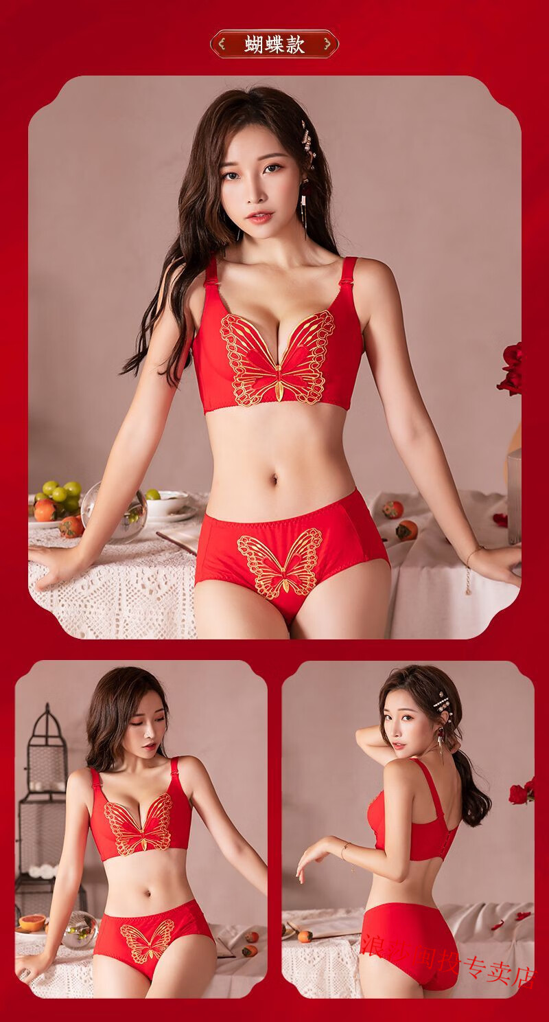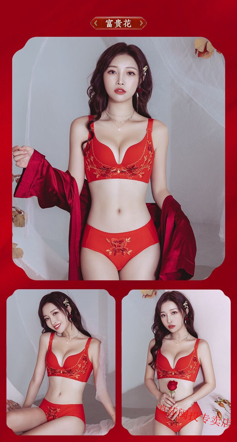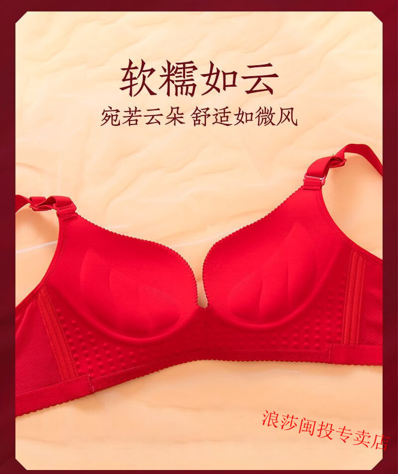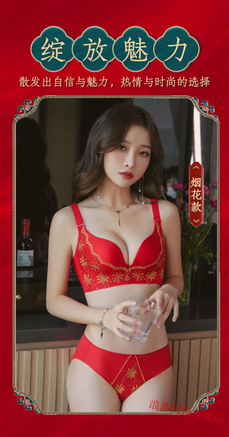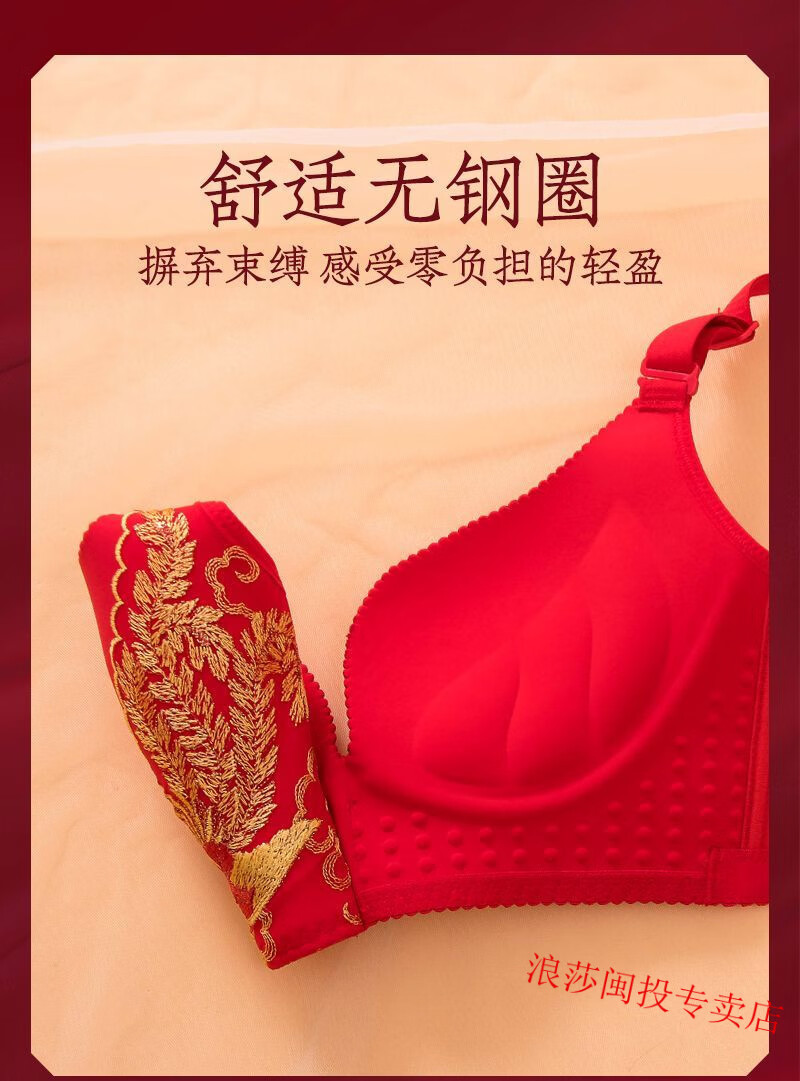 LangSha's new zodiac year red bra set for wedding celebrations for brides with small breasts push-up adjustable no-wire bra for women without gift box 34/75B M Fireworks style single piece