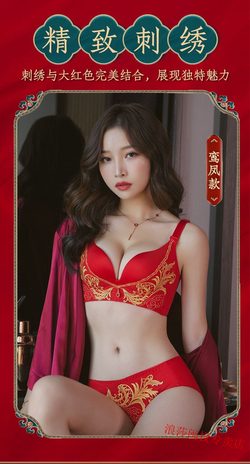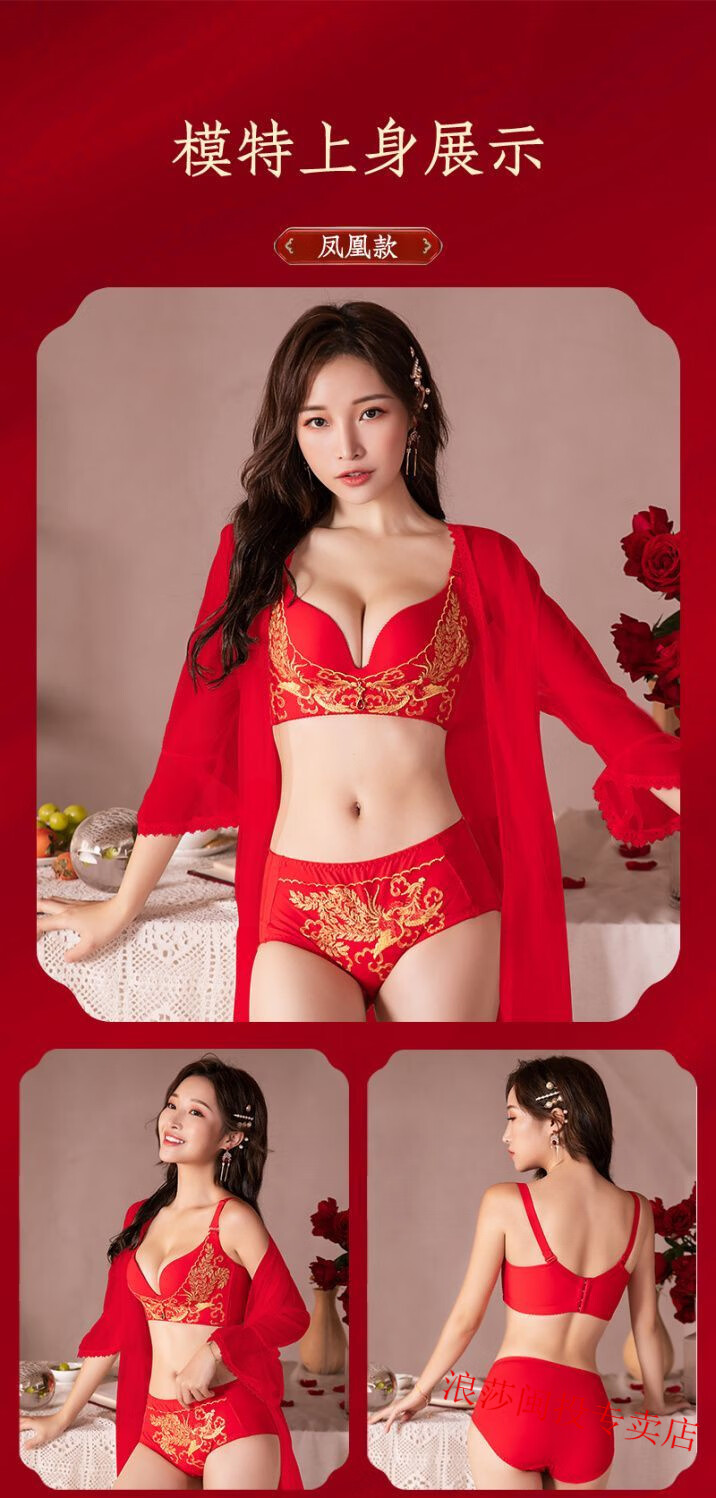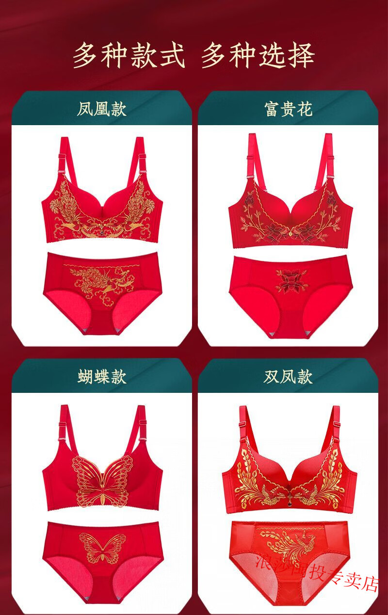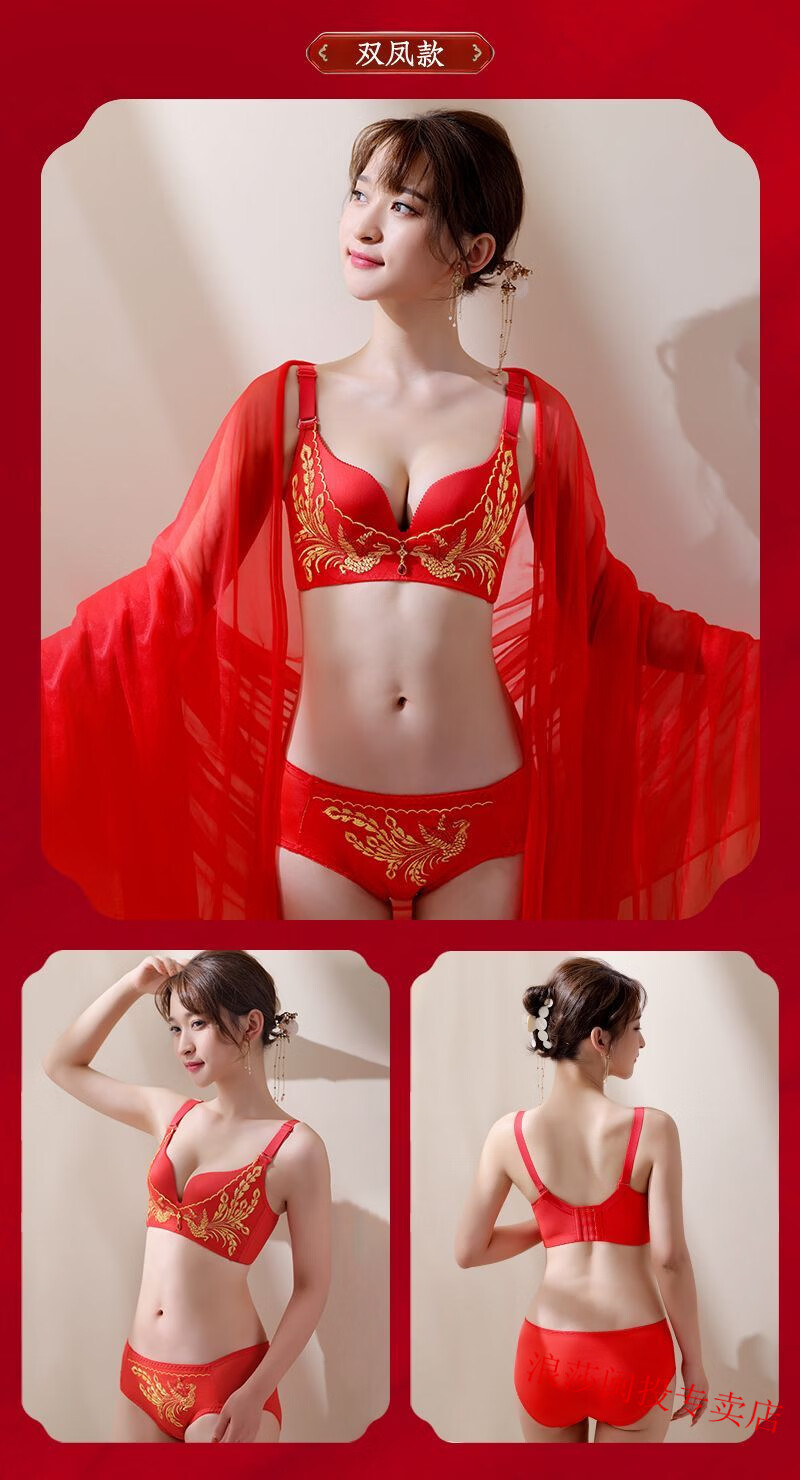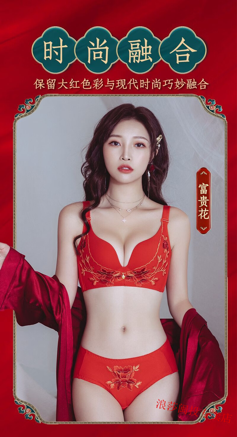LangSha's new zodiac year red bra set for wedding celebrations for brides with small breasts push-up adjustable no-wire bra for women without gift box 34/75B M Fireworks style single piece