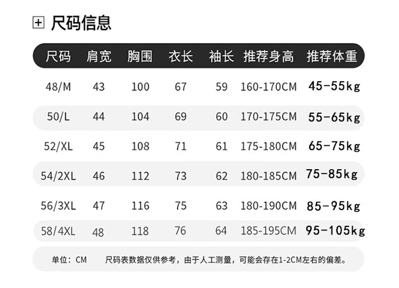 China (cm) 165 / 88-90 170 / 96-98 175 / 108-110 180 / 118-122 185 / 126-130