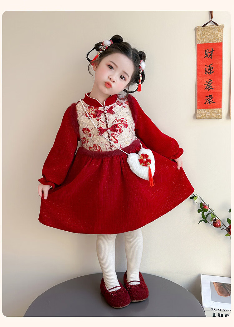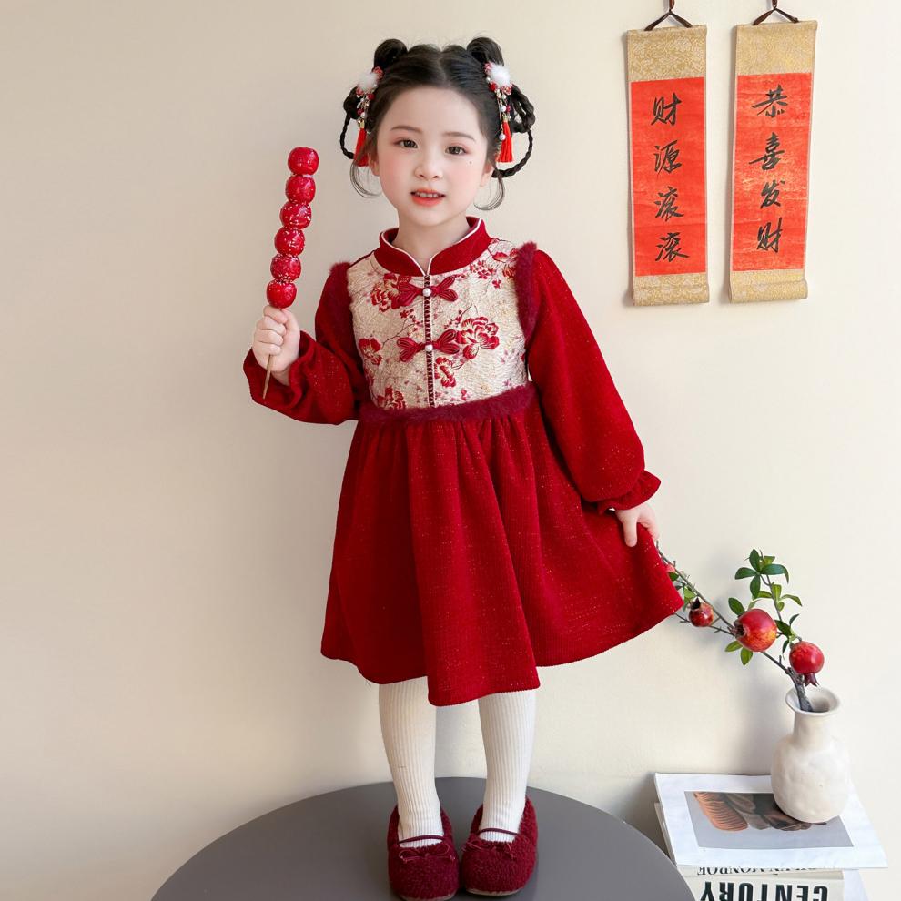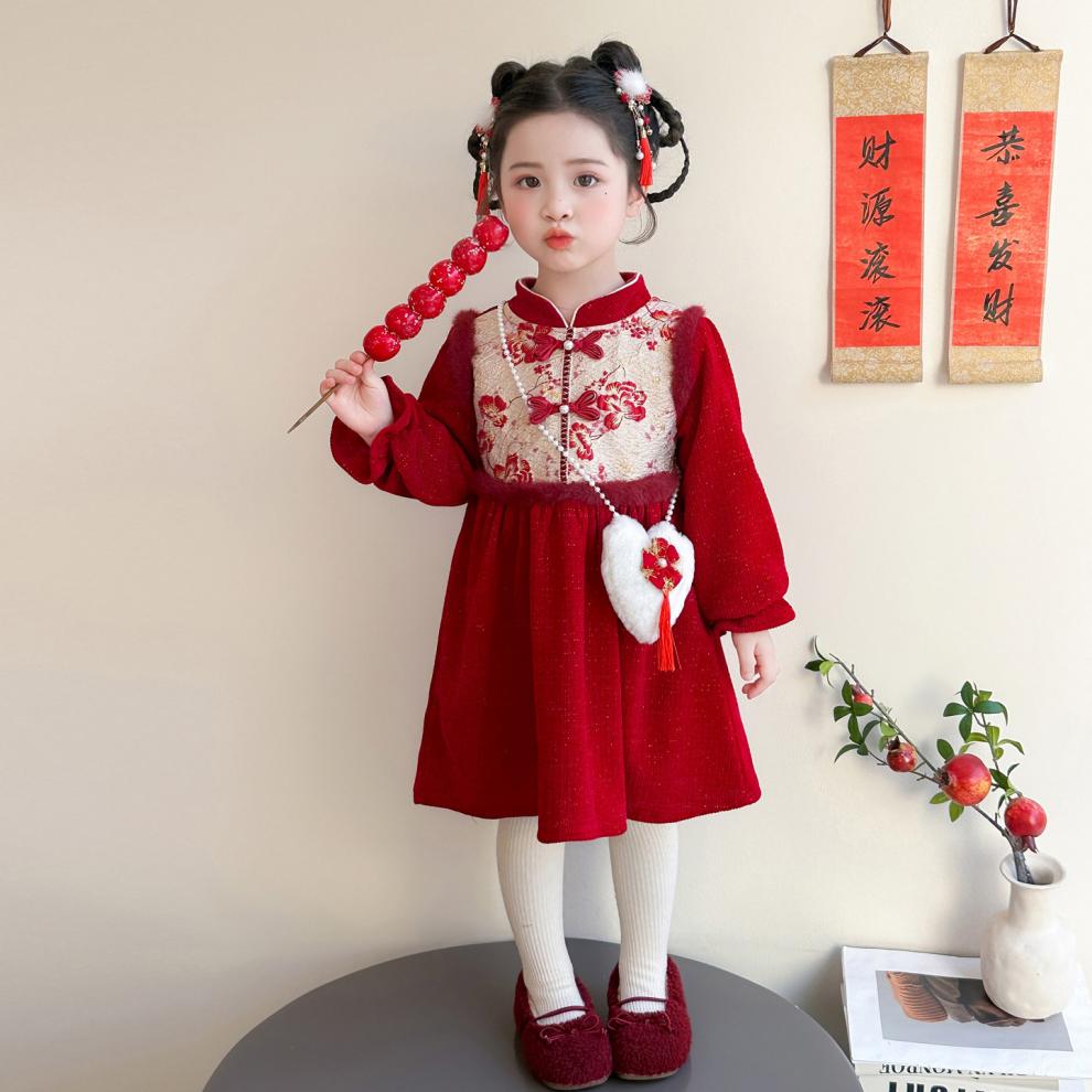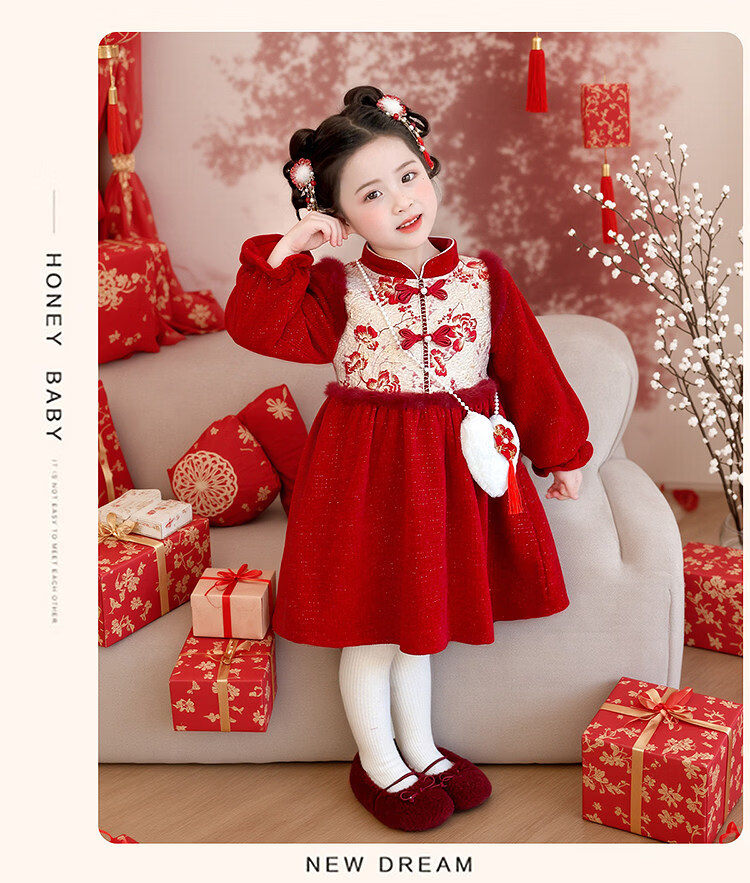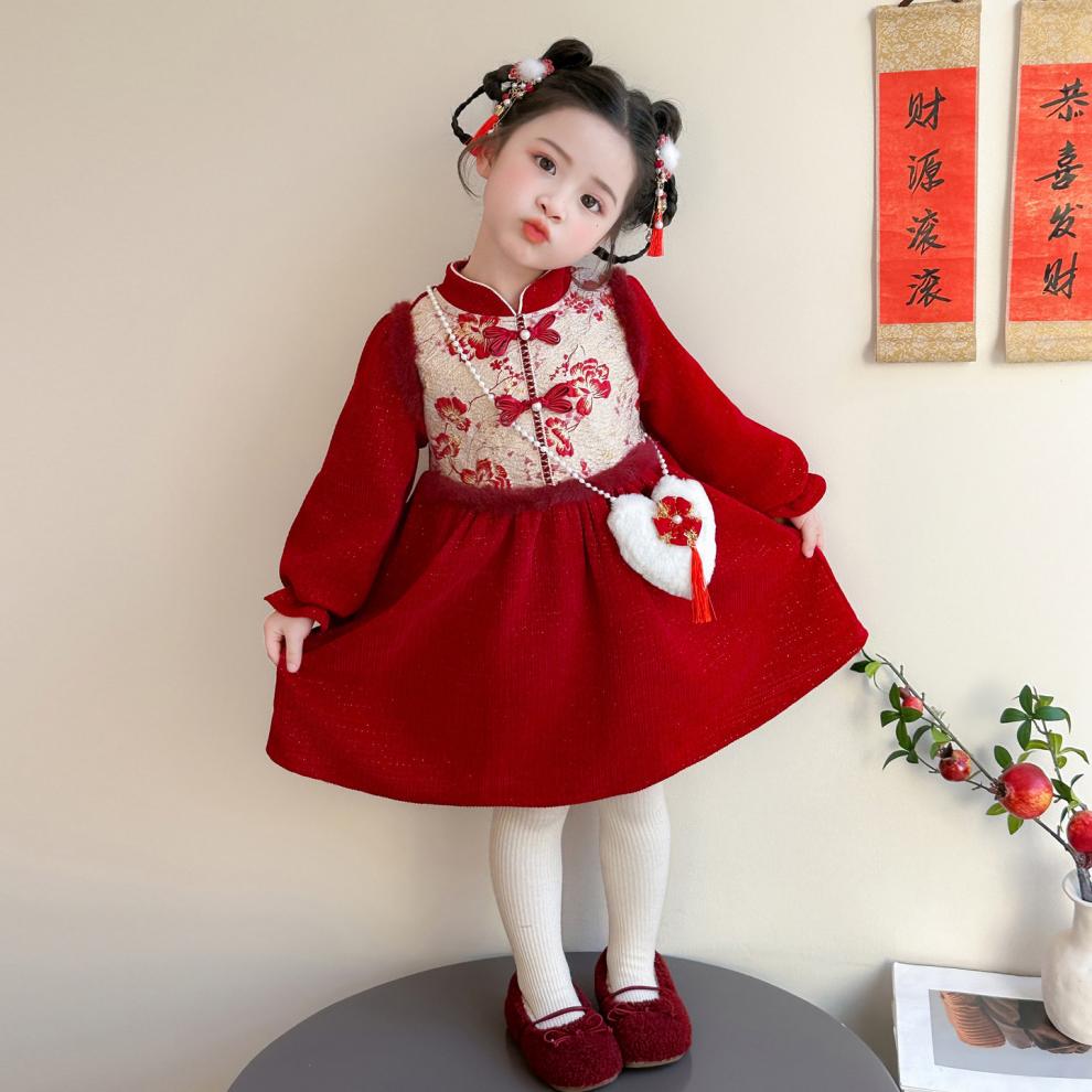 HAL.DUCK Girls' New Year's Eve Clothes Plus Velvet Dress Winter 2026 New Children's Cheongsam Dress Baby Girl's Happy New Year Dress Red Free Bag 110