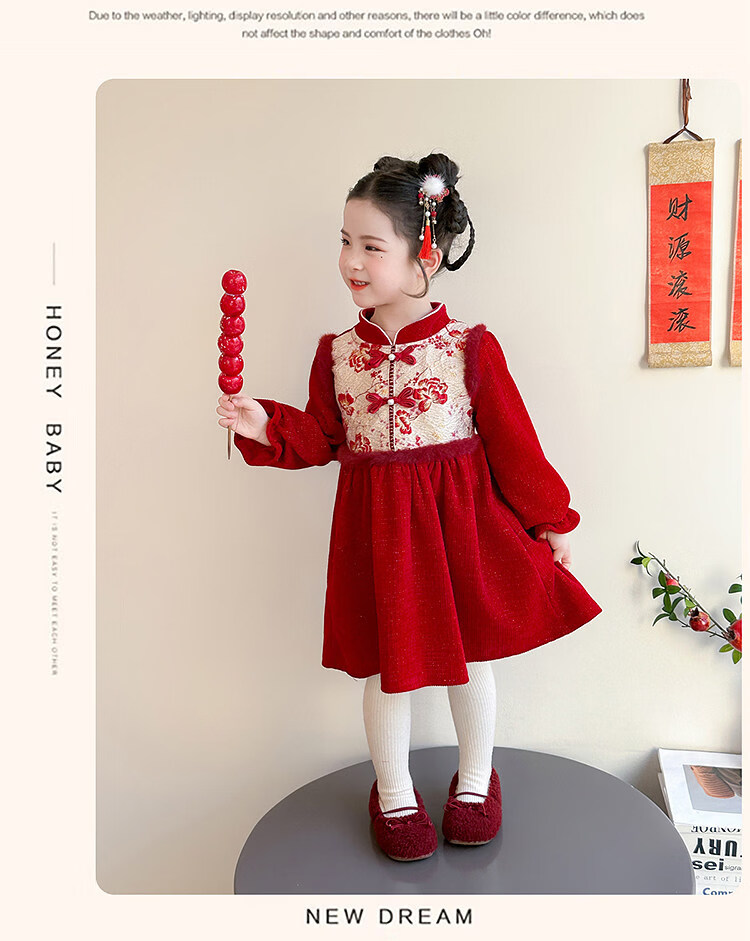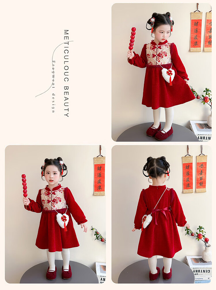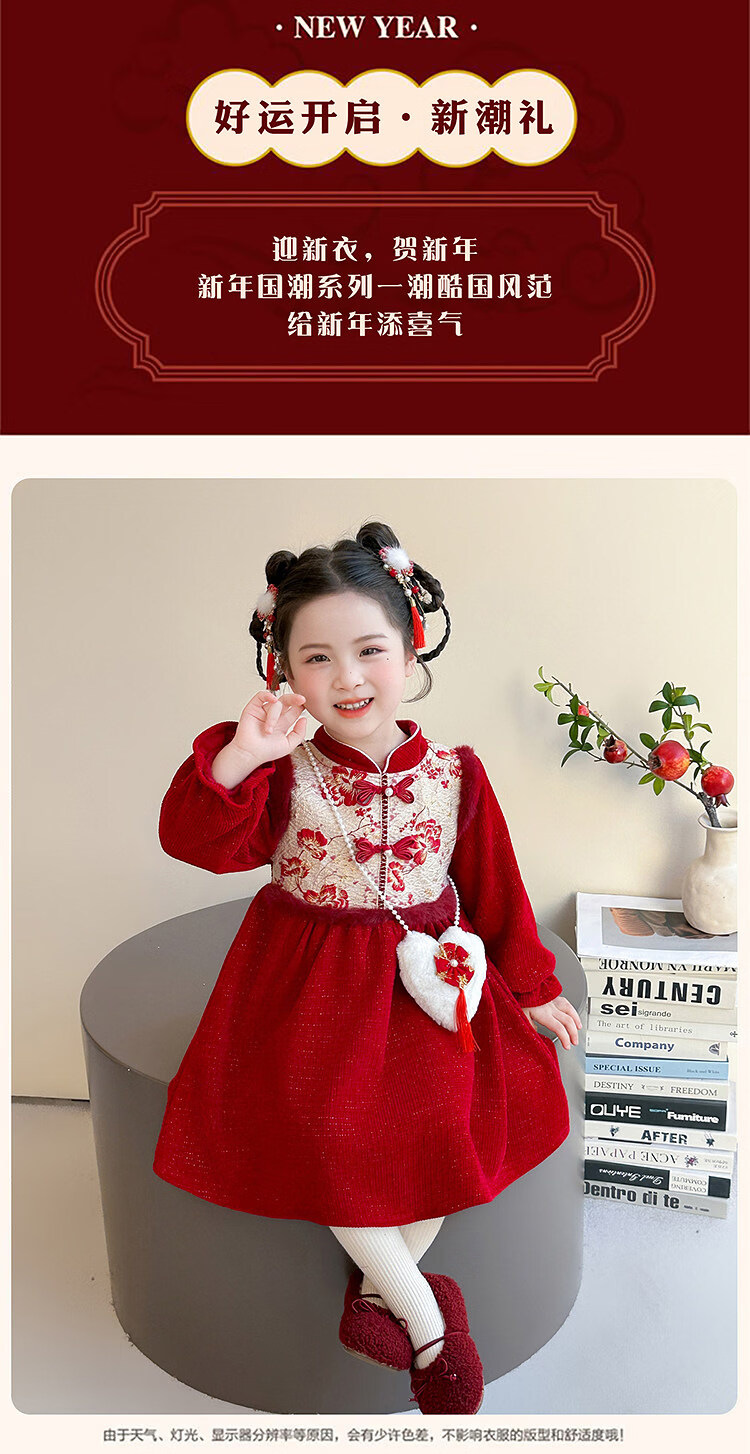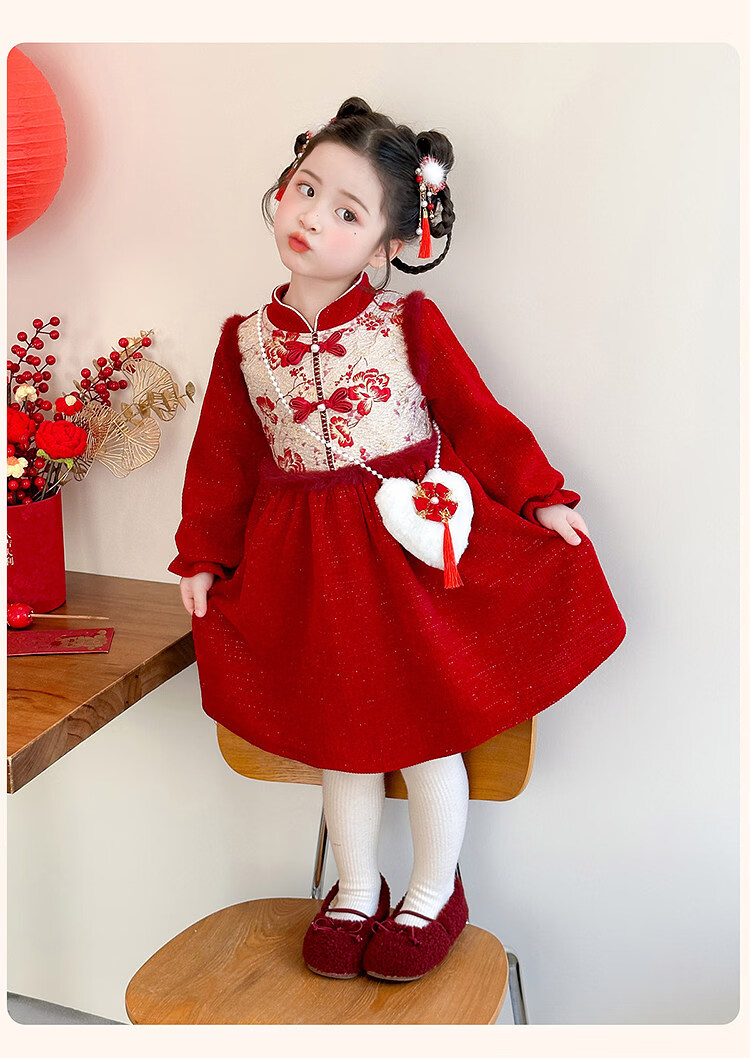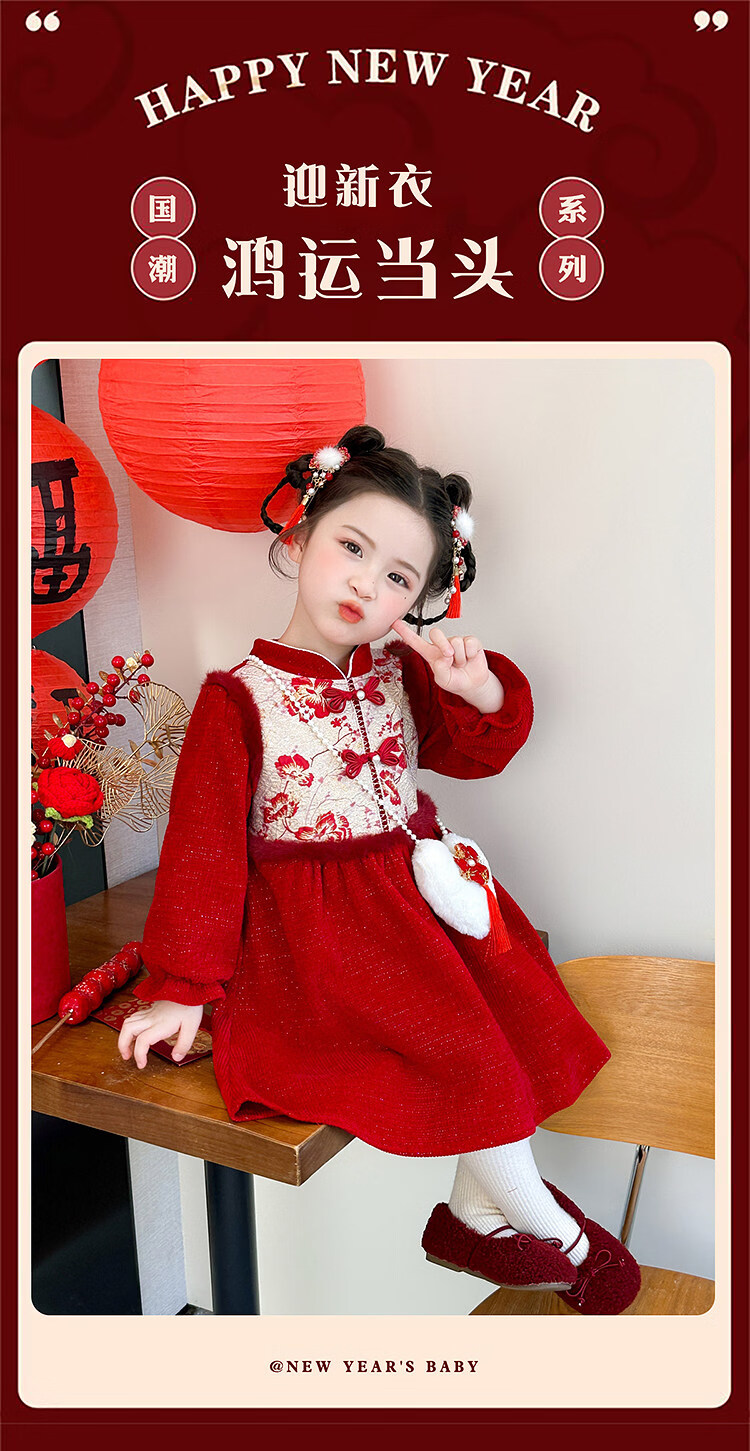 HAL.DUCK Girls' New Year's Eve Clothes Plus Velvet Dress Winter 2026 New Children's Cheongsam Dress Baby Girl's Happy New Year Dress Red Free Bag 110