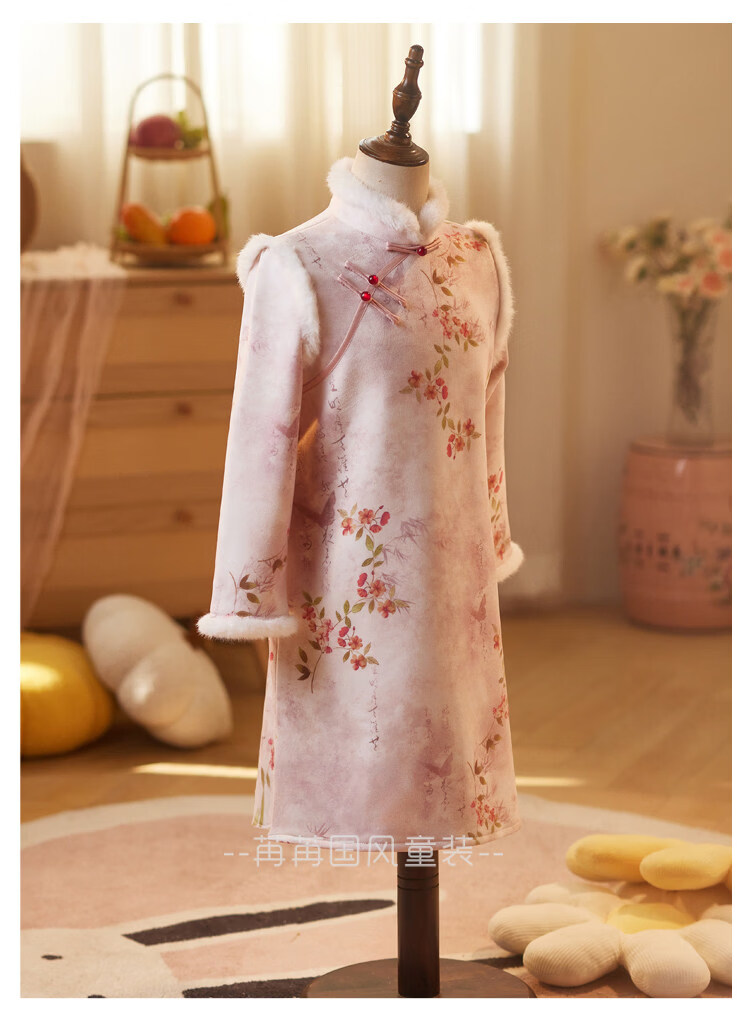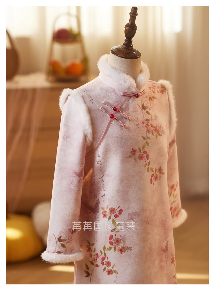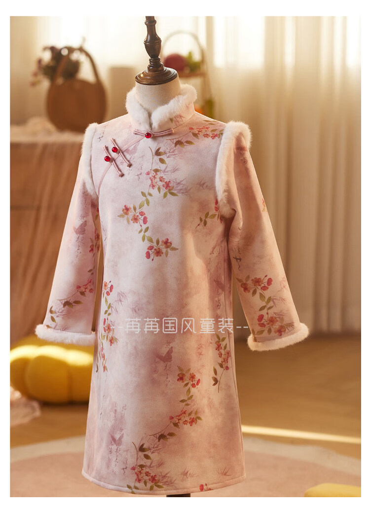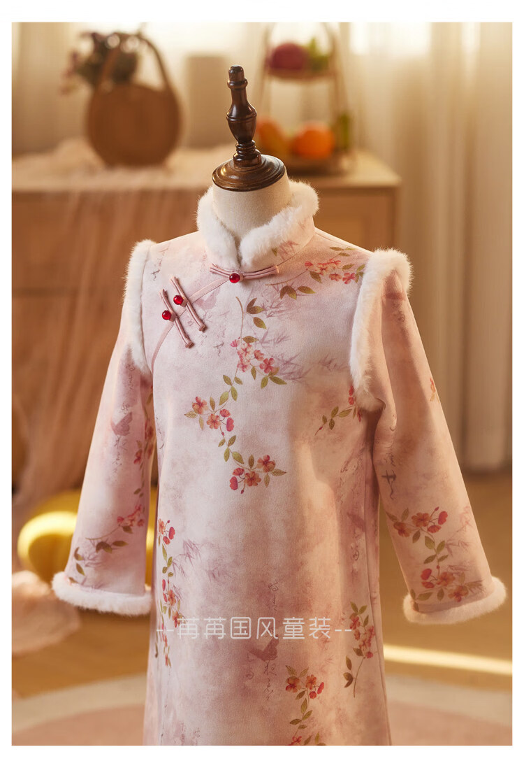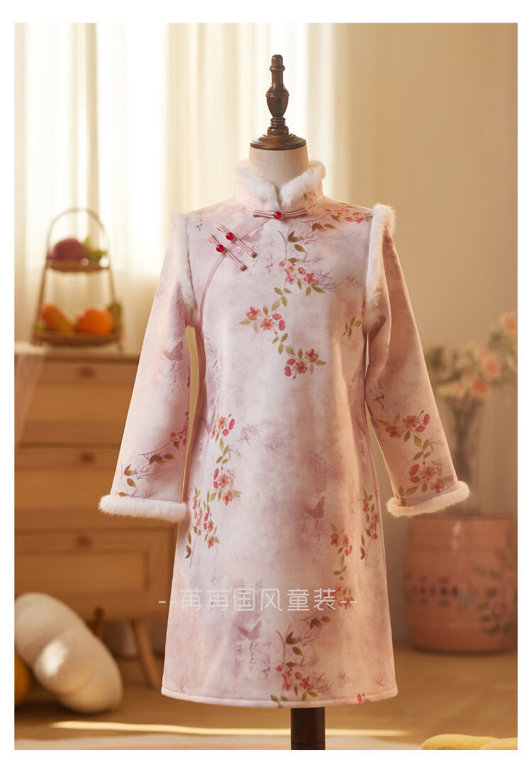 Disney pink girls' cheongsam autumn and winter clothing children's New Year's greetings clothing long-sleeved thickened velvet princess dress performance clothing winter pink 110