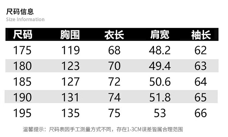 China (cm) 165 / 88-90 170 / 96-98 175 / 108-110 180 / 118-122 185 / 126-130
