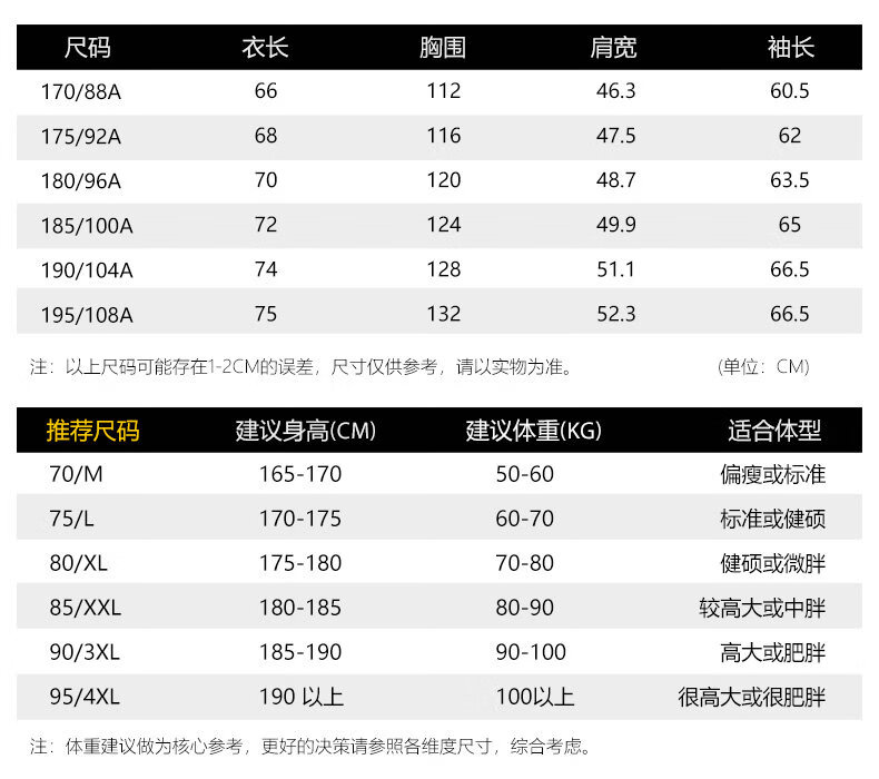China (cm) 160-165/84-86 165-170 / 88-90 167-172 / 92-96 168-173 / 98-102 170-176 / 106-110