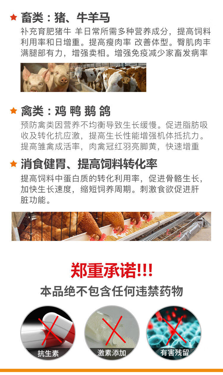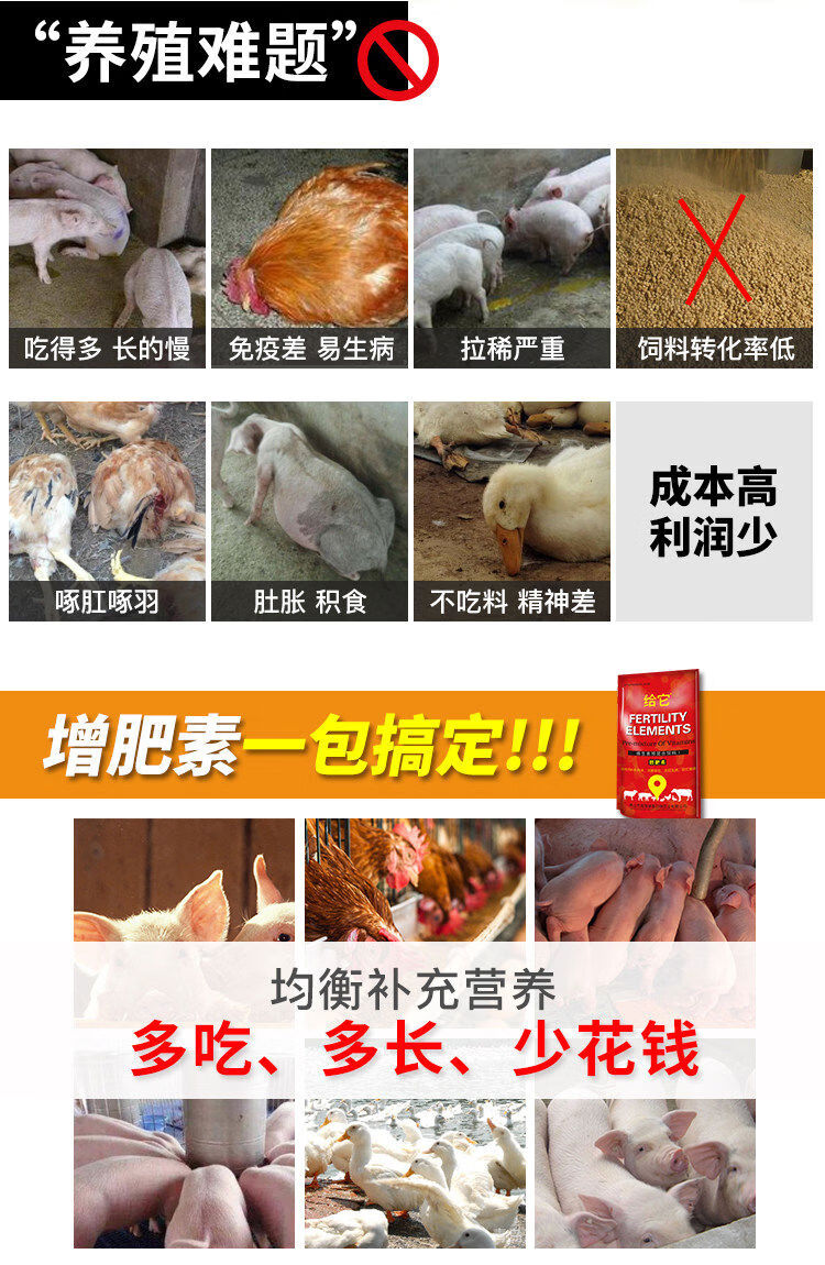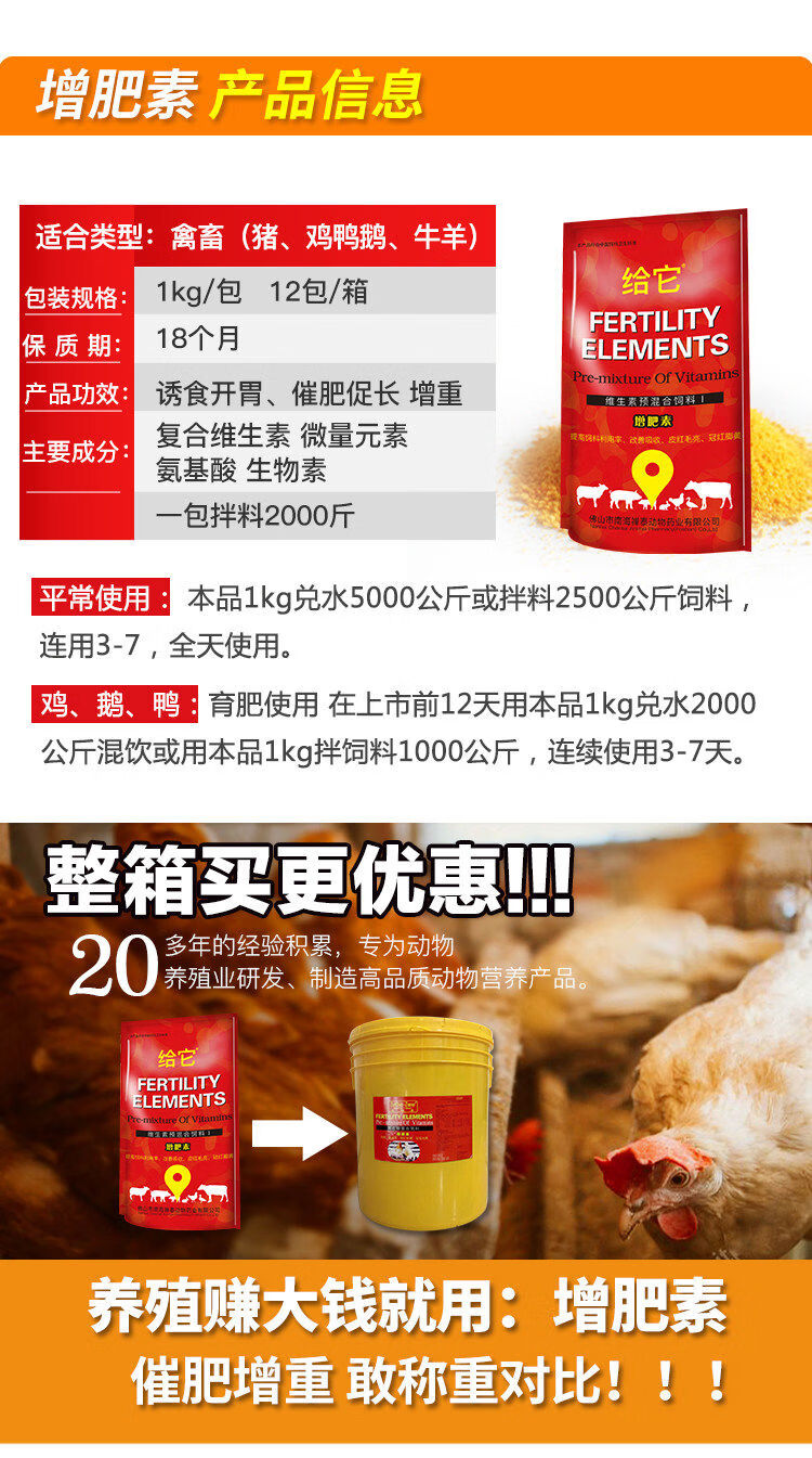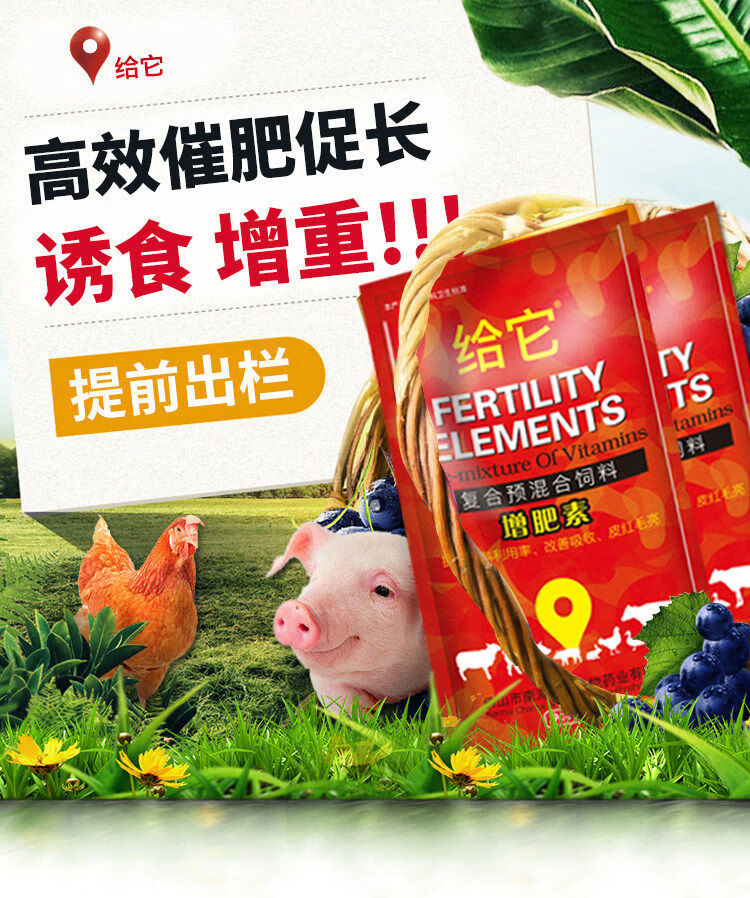 Give it feed additives for chickens and ducks, multivitamins to promote growth and fattening, premixes for pigs, cattle and sheep to fatten, veterinary multivitamins 1kg 1 pack