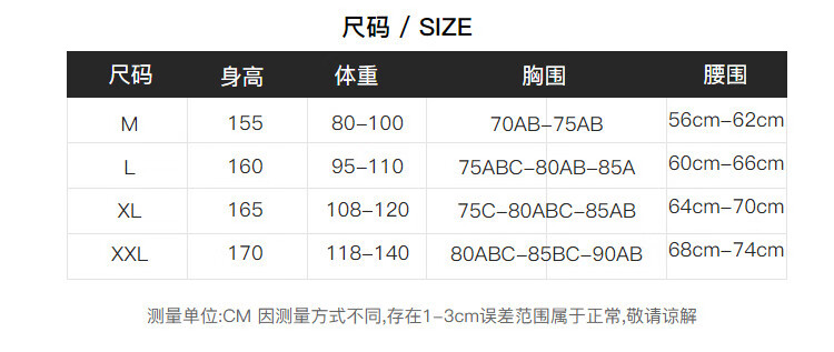 China (cm) 160-165/84-86 165-170 / 88-90 167-172 / 92-96 168-173 / 98-102 170-176 / 106-110