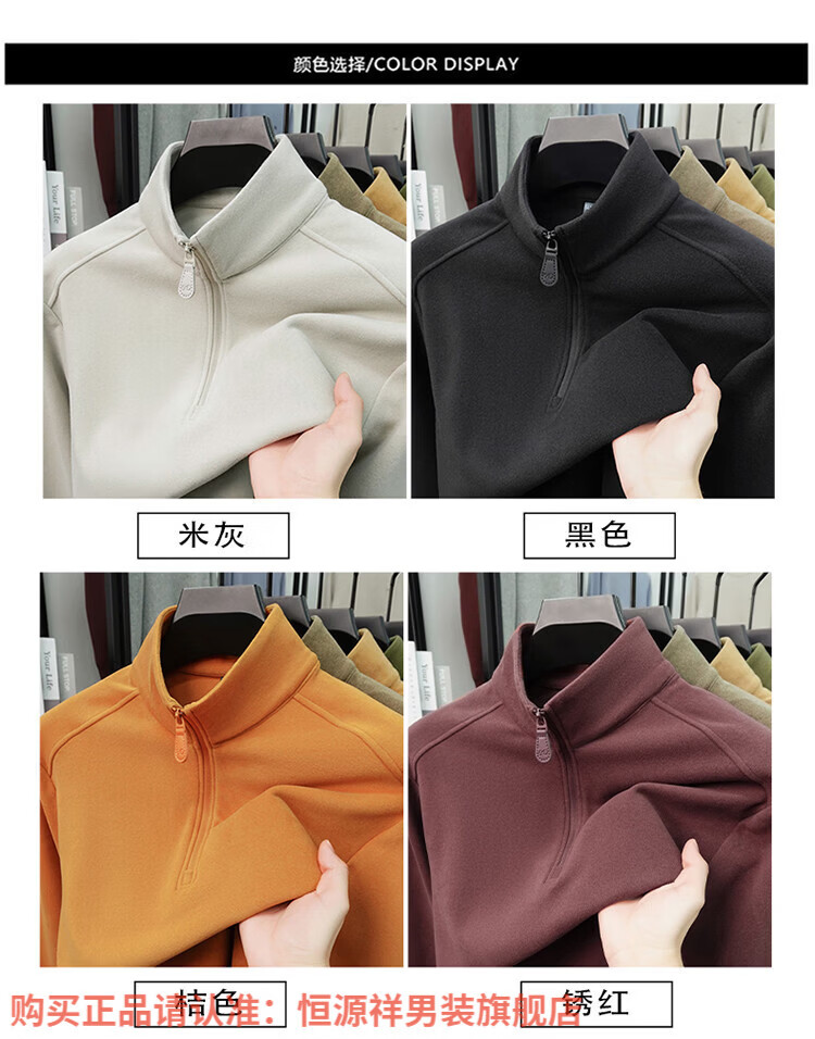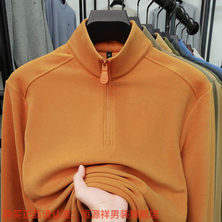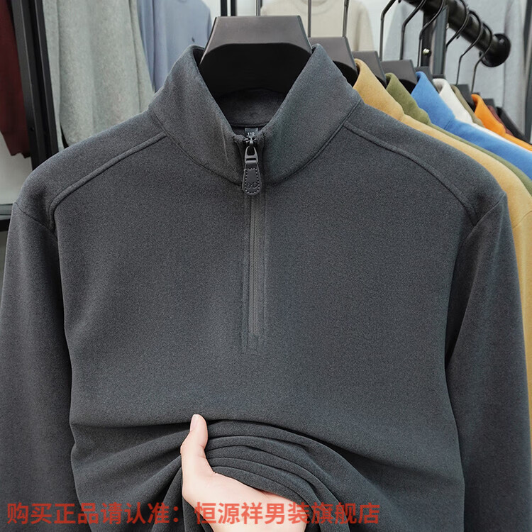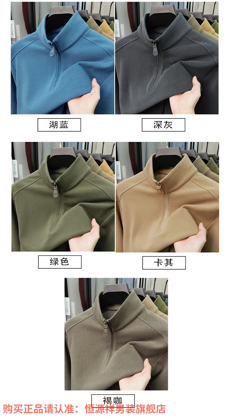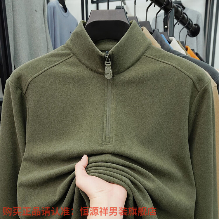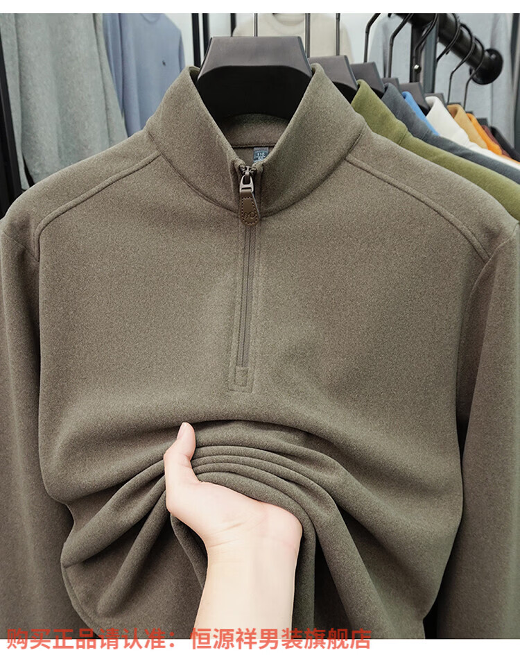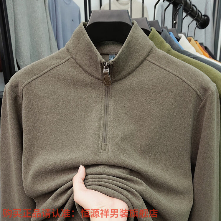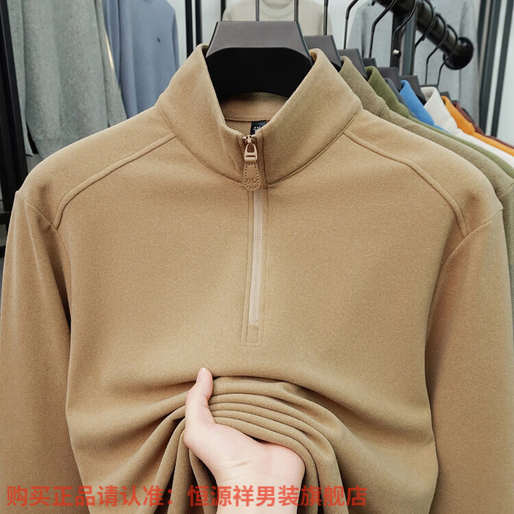Hengyuanxiang anti-static autumn and winter zippered half-high collar long-sleeved T-shirt for men thickened and warm double-sided velvet sweatshirt with base layer khaki XL 52
