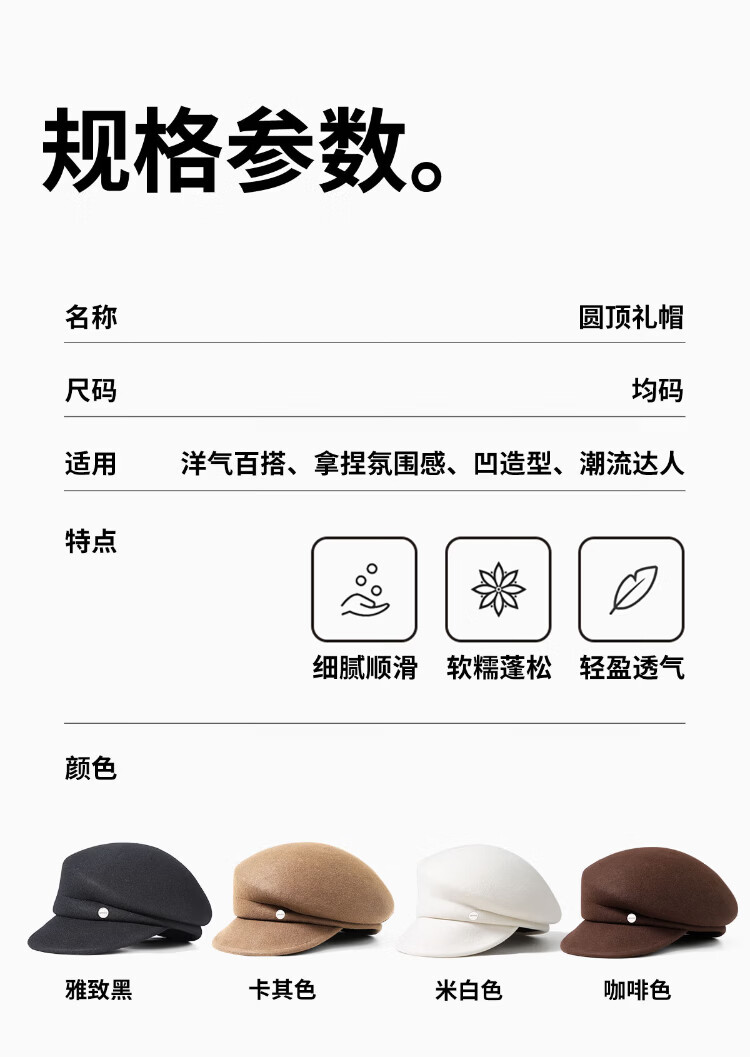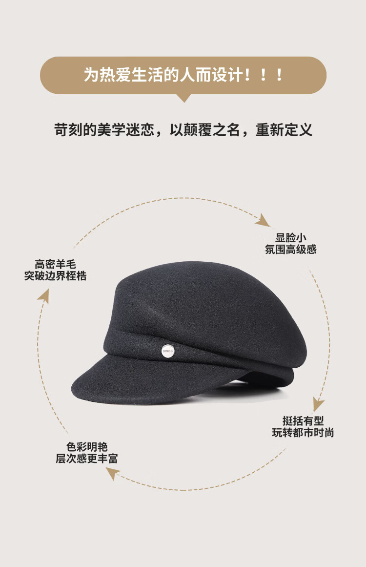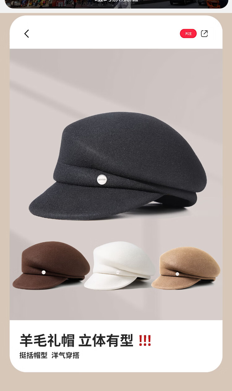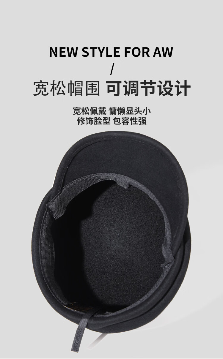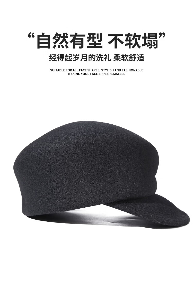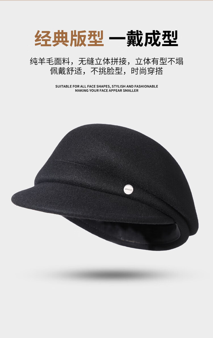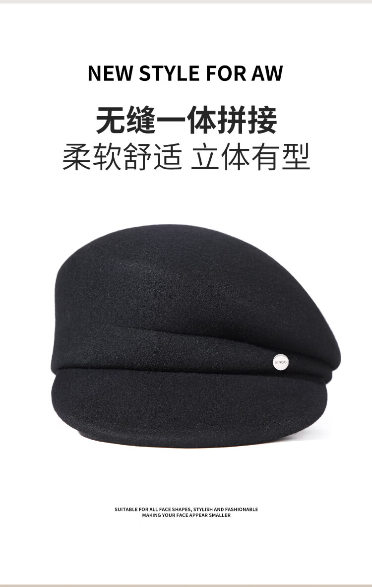 MINISO black pure wool nibert hat for women autumn and winter British style newsboy octagonal hat with big head circumference showing face Xiaohan fashion elegant black